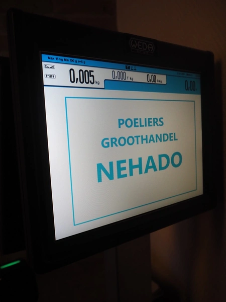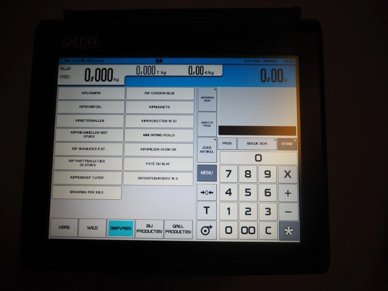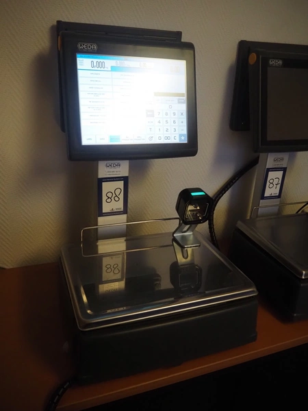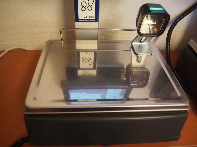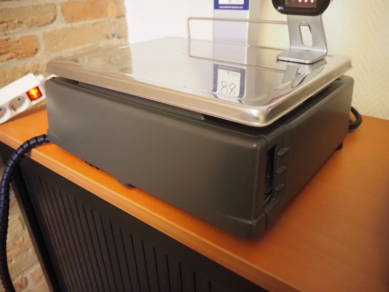 Dibal S.A. weighing scale with label printer and scanner, model: D-900 series, serial number: 31918313, 110-230 V, 50/60 Hz, 1.2 A, maximum weight: 15 kg, minimum weight: 100 gram, e= 5 gram, T= -14.995 kg, dimensions scale: 360 mm x 280 mm, total dimensions: 380 mm x 460 mm x 620 mm.