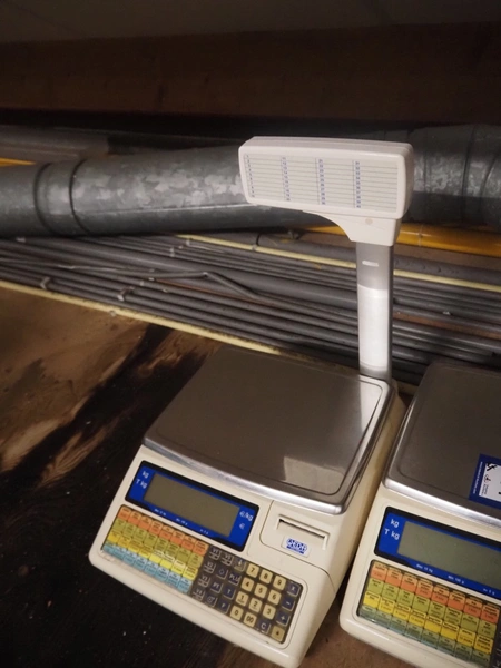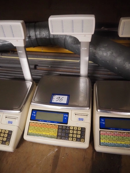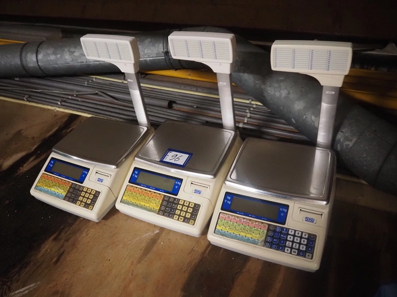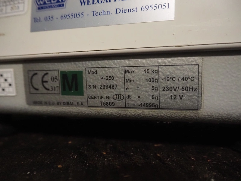 3 Dibal S.A. weighing scales, model: K-250, serial number: 209473 / 209468 / 209467, 230 V, 50 Hz, maximum weight: 15 kg, minimum weight: 100 gram, e= 5 gram, dt= 5 gram, T= - 14995 gram, dimensions scale: 320 mm x 250 mm, total dimensions: (3x) 330 mm x 450 mm x 550 mm.