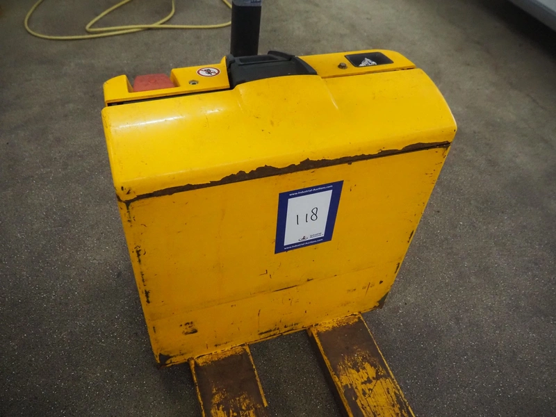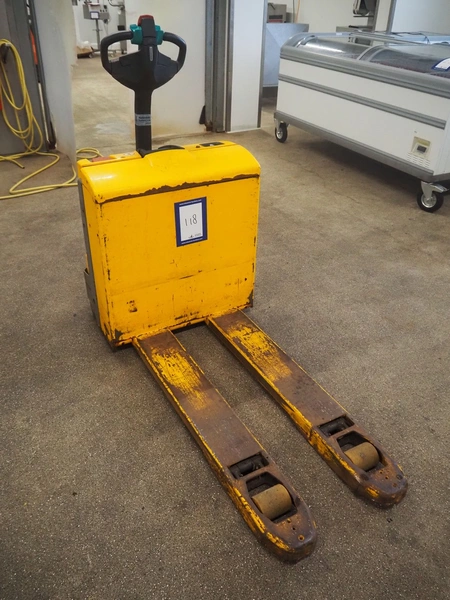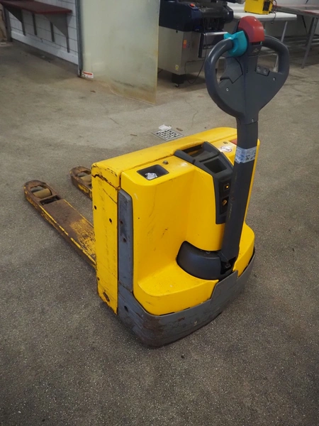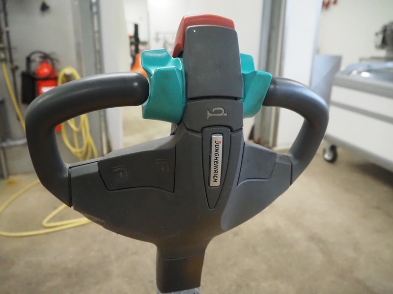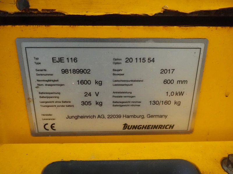 Jungheinrich electrical pallet lifter, type: EJE 116, serial number: 98189902, year of construction: 2017, capacity: 1600 kg, fork length: 1150 mm, total dimensions: 1800 mm x 740 mm x 1300 mm. Including Energic Plus battery charger.