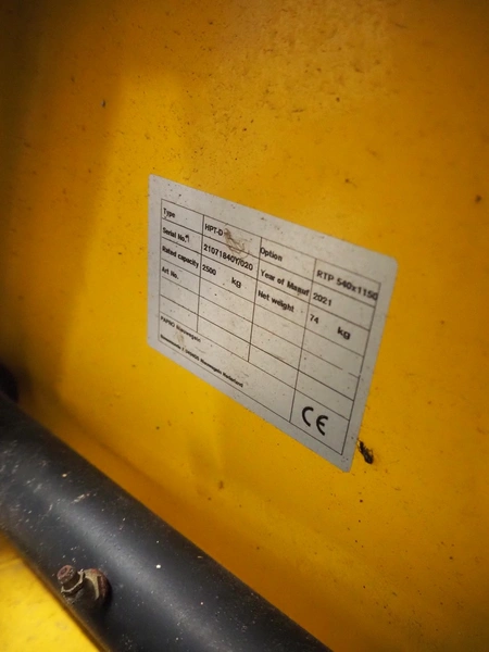 Papro steel pallet lifter, type: HPT-D, serial number: 21071840Y/020, year of construction: 2021, capacity: 2500 kg, weight: 74 kg, fork length: 1150 kg, total dimensions: 1550 mm x 520 mm x 1350 mm.