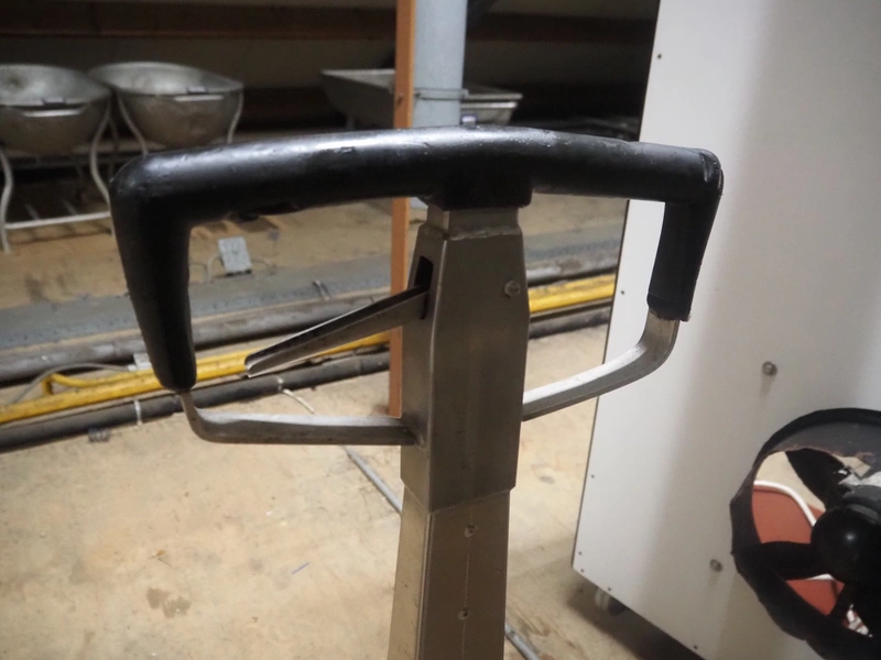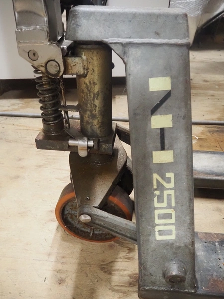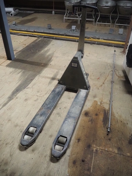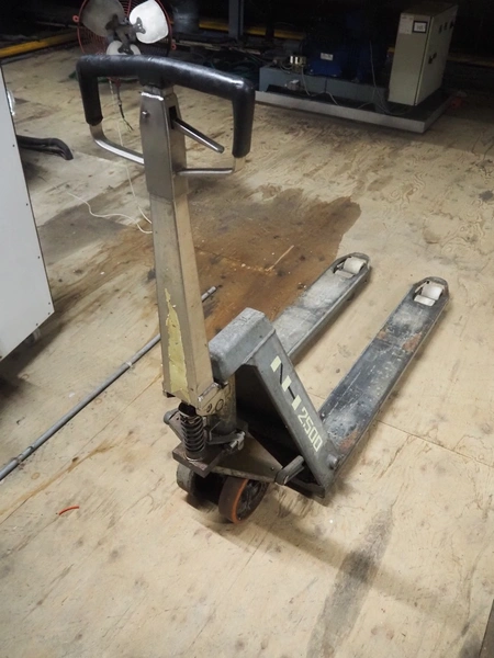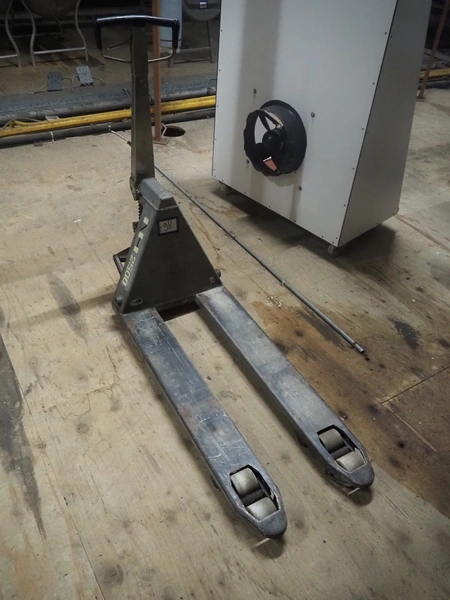 NH Intern Transport steel pallet lifter, model: PL25, serial number: 2646, fork length: 1125 mm, total dimensions: 1480 mm x 520 mm x 1180 mm. Defect.