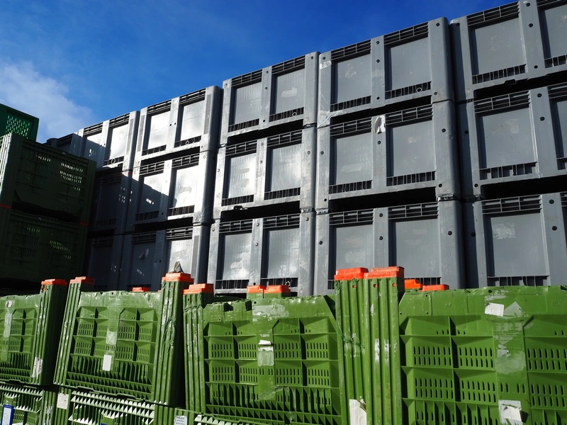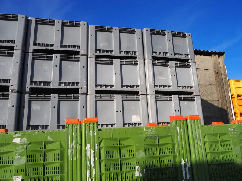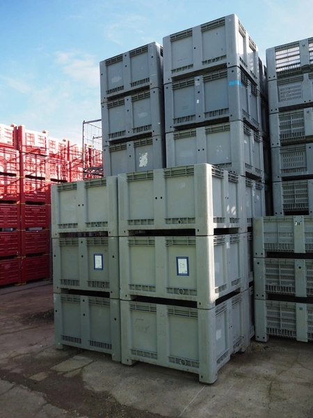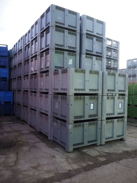 150 plastic pallet boxes, dimensions: (150x) 1120 mm x 1120 mm x 710 mm.