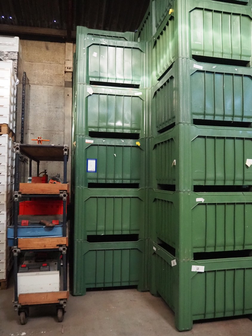 Approximately 65 plastic pallet boxes, dimensions: (65x) 1120 mm x 1120 mm x 770 mm.