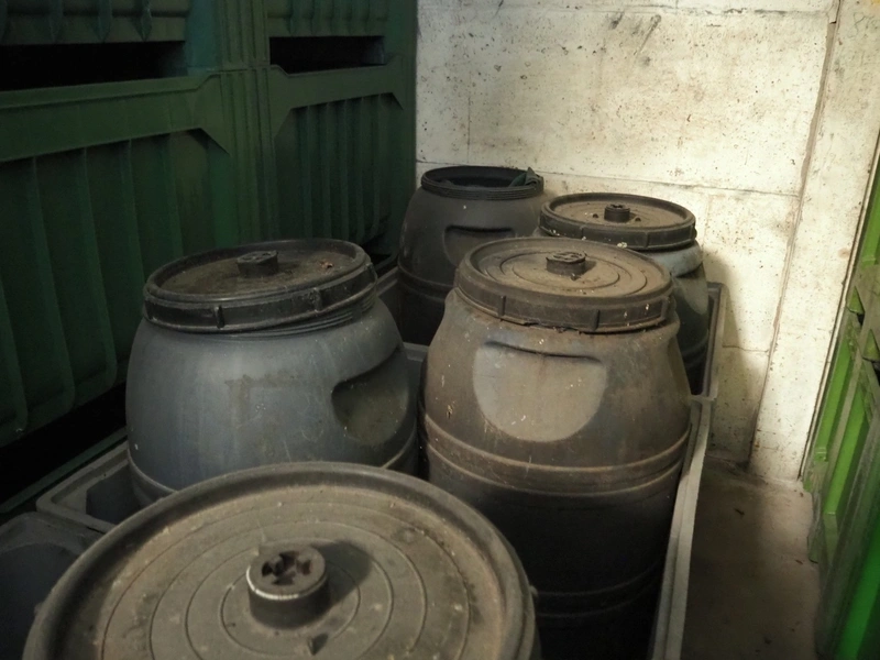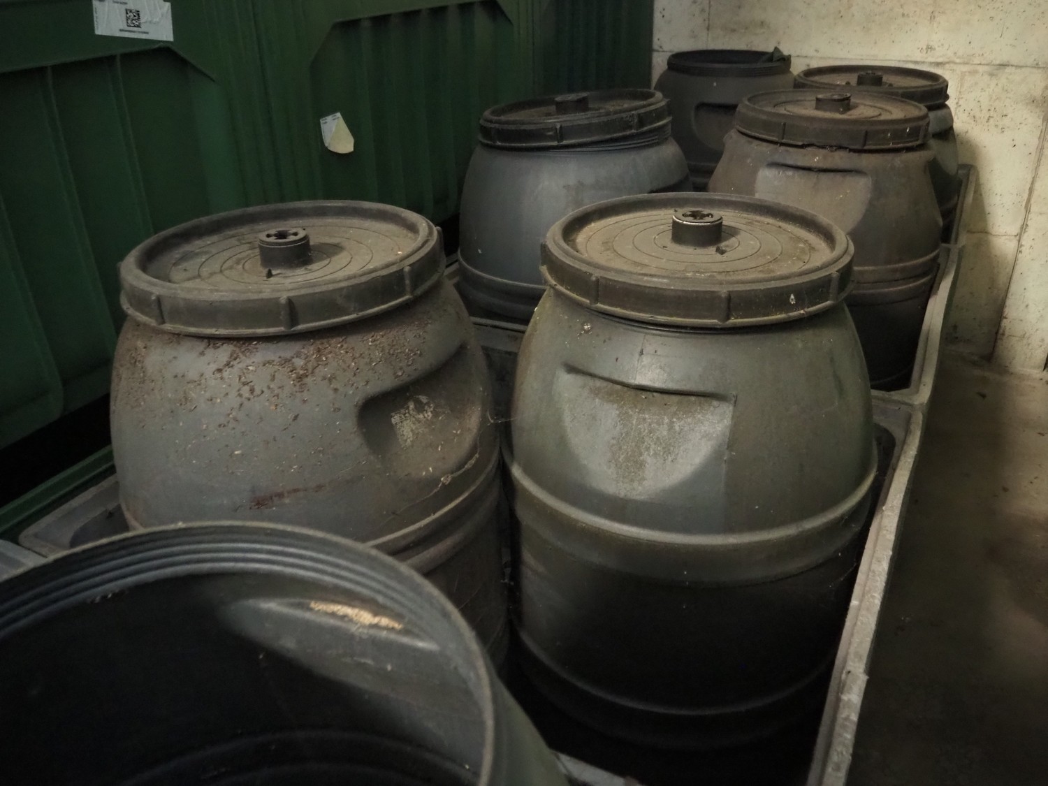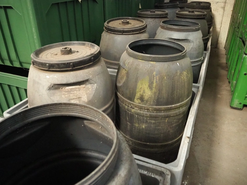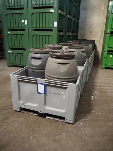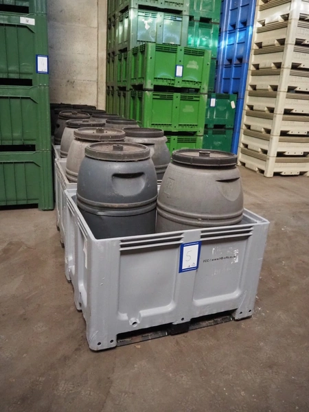 7 plastic pallet boxes with 14 plastic barrels, pallet box dimensions: (7x) 1200 mm x 1000 mm x 770 mm, barrel dimensions: (14x) Ø 600 mm x 1000 mm. Missing 4 lids.