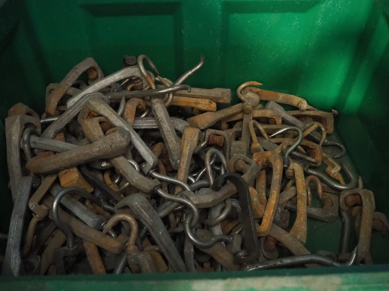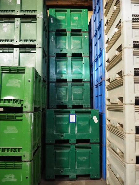 8 plastic pallet boxes, dimensions (8x) 1190 mm x 990 mm x 760 mm. Including large amount of meat hooks.