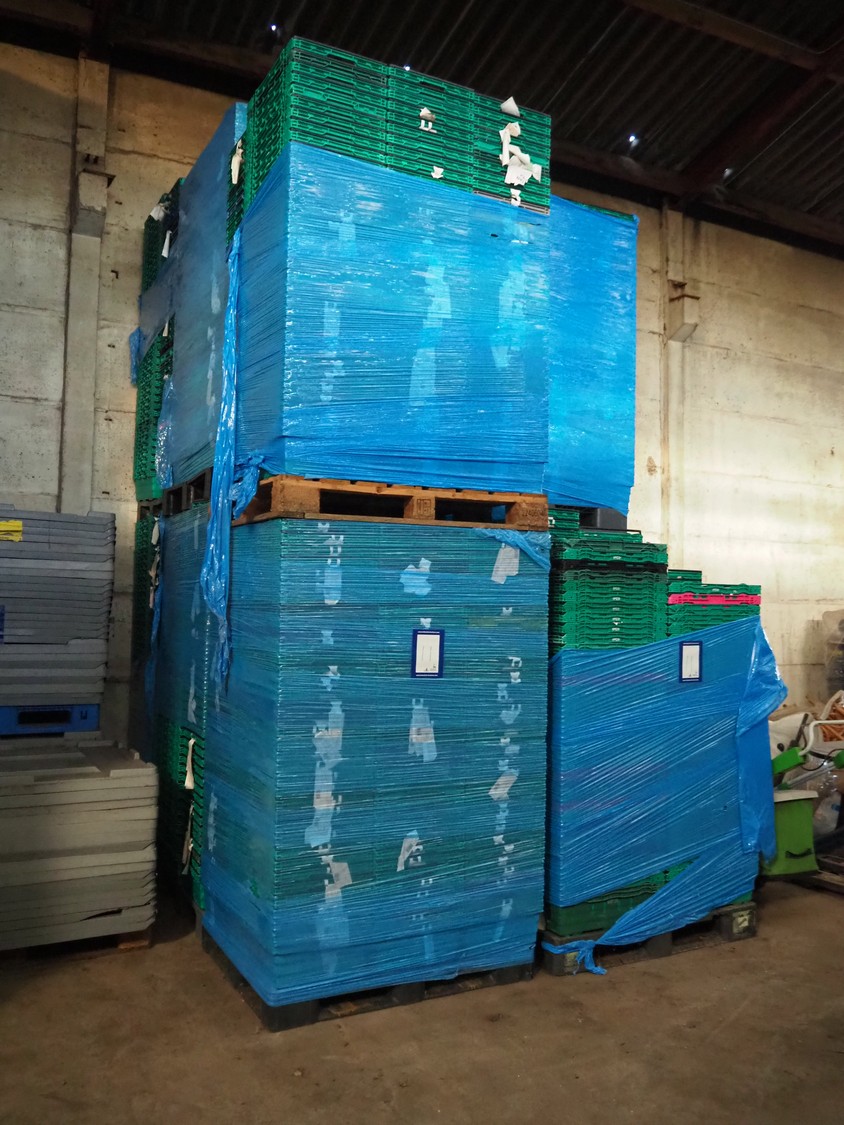 11 pallets with approximately 2100 plastic crates, crate dimensions: 600 mm x 400 mm x 200 mm.