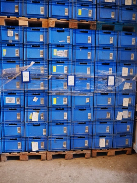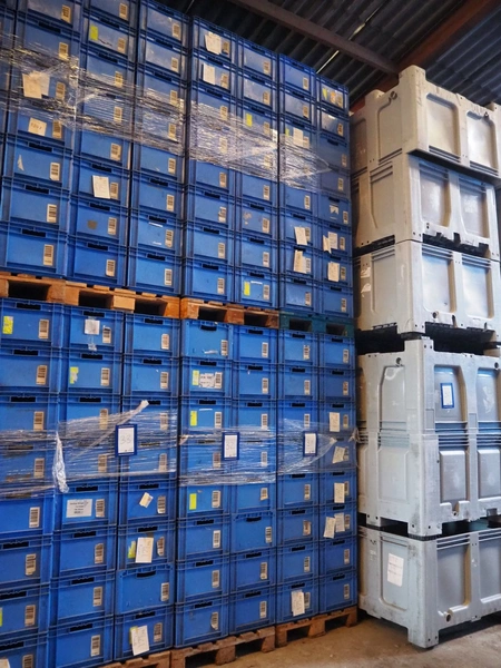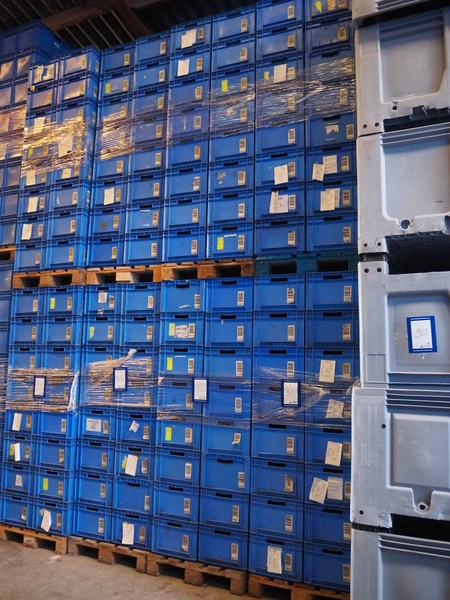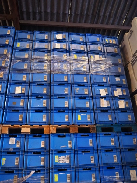 4 pallets with approximately 128 plastic crates, crate dimensions: 550 mm x 390 mm x 265 mm.