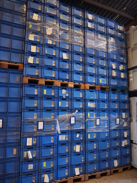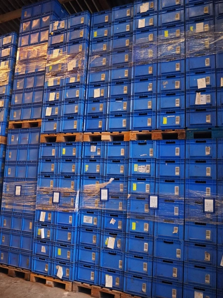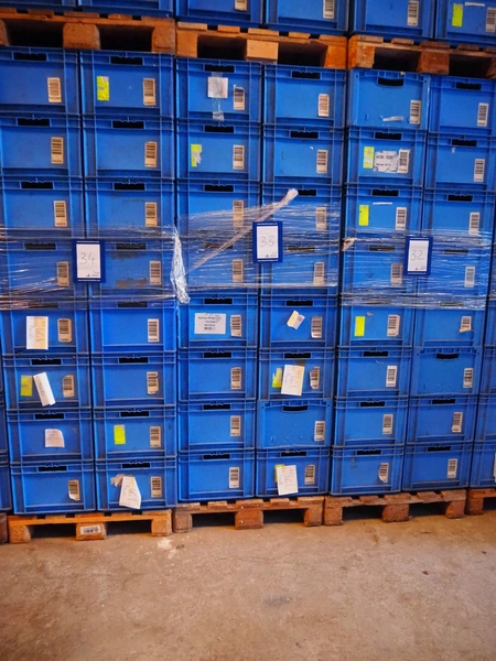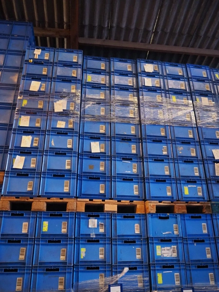 4 pallets with approximately 128 plastic crates, crate dimensions: 550 mm x 390 mm x 265 mm.