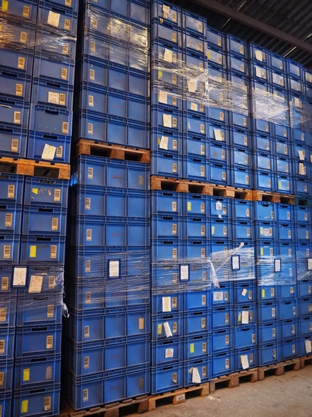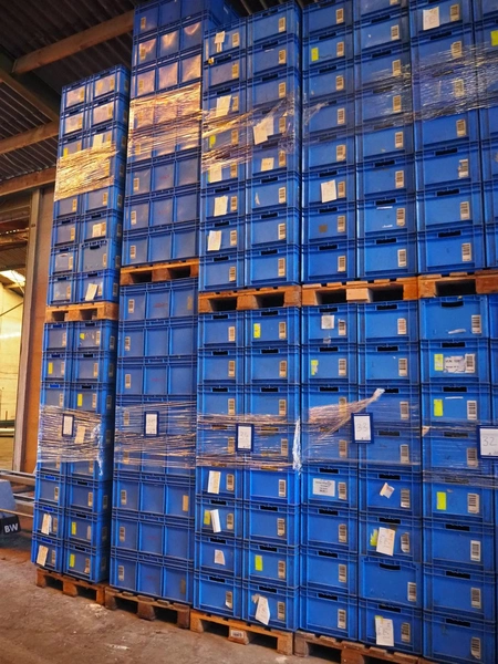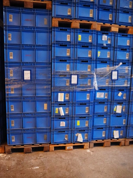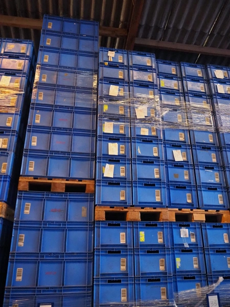 4 pallets with approximately 128 plastic crates, crate dimensions: 550 mm x 390 mm x 265 mm.