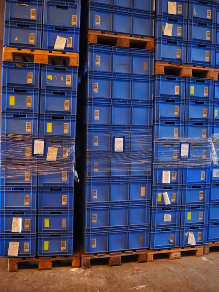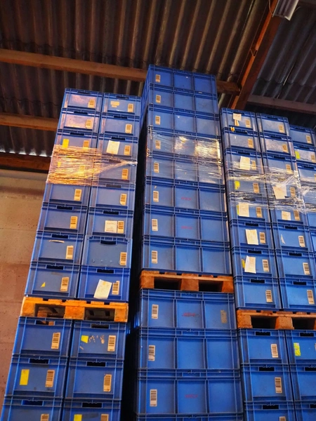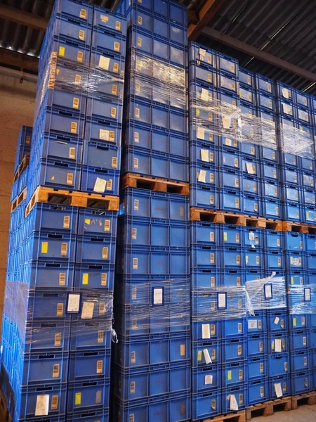 4 pallets with approximately 64 plastic crates, crate dimensions: 590 mm x 390 mm x 300 mm.