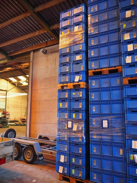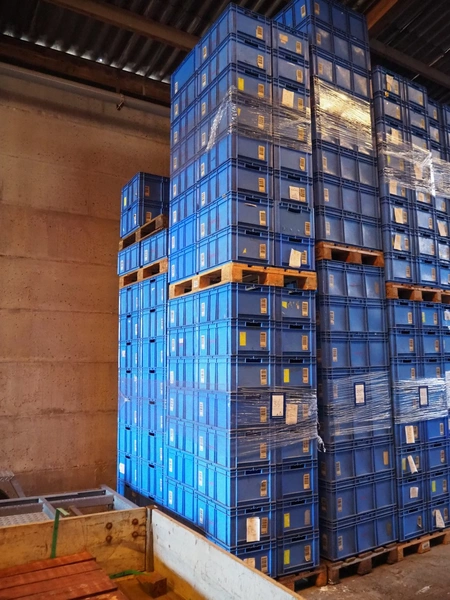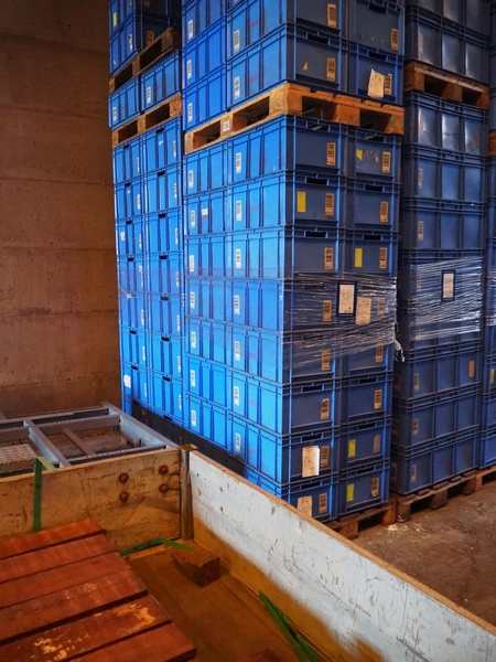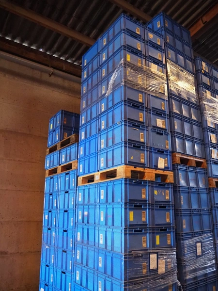 4 pallets with approximately 106 plastic crates, crate dimensions: 590 mm x 390 mm x 265 mm and 590 mm x 390 mm x 300 mm.