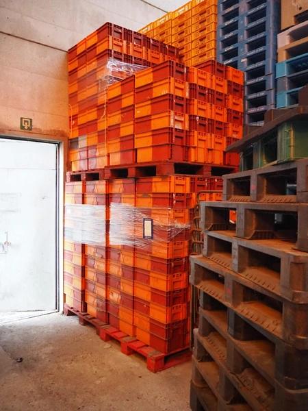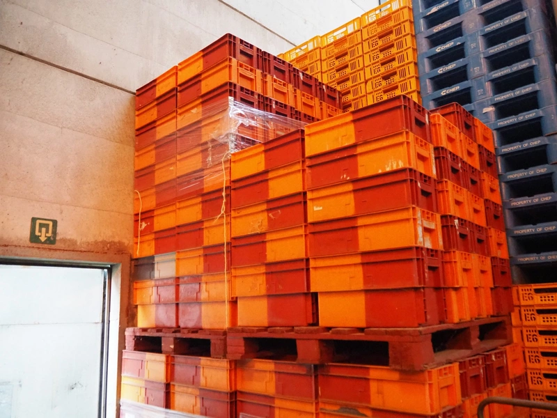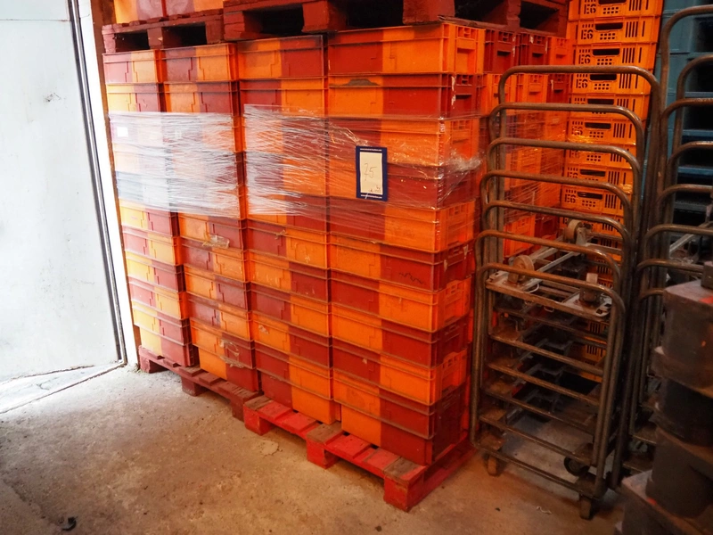 4 pallets with approximately 120 plastic crates, dimensions: 510 mm x 280 mm x 290 mm.