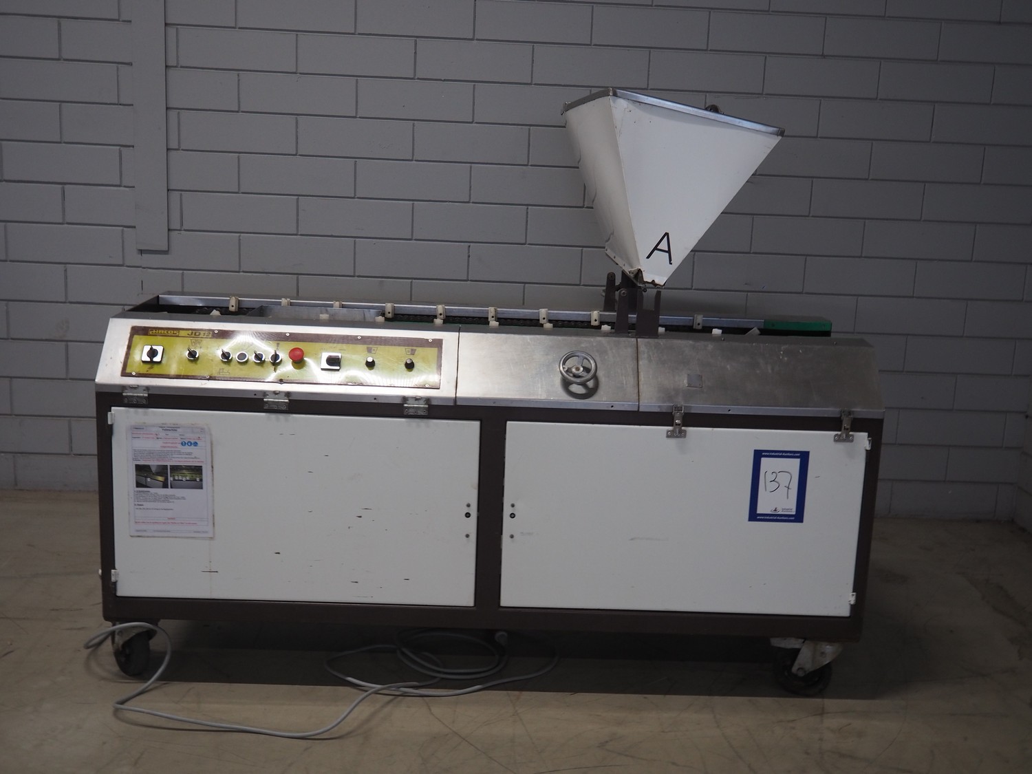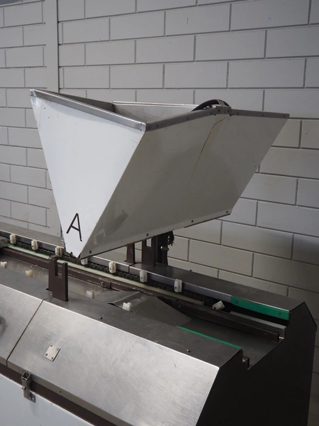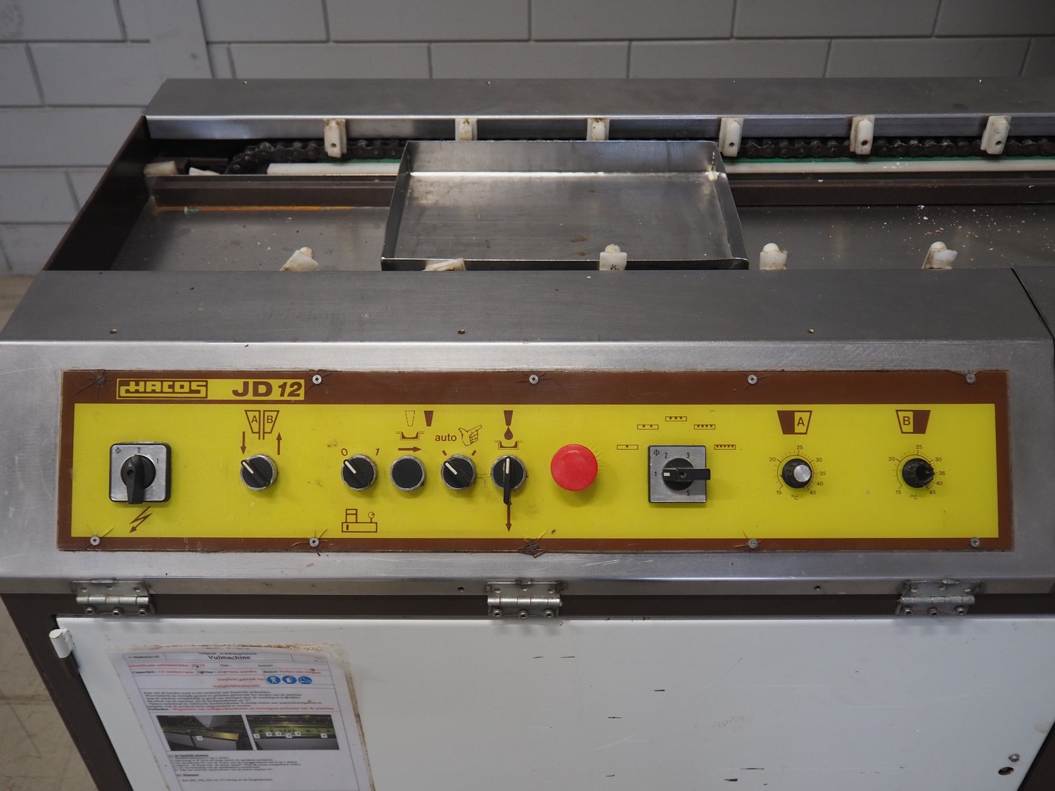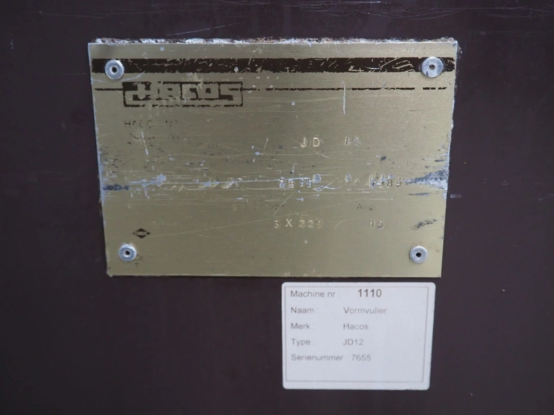 Hacos mobile filling machine, type: JD12, serial number: 7655, year of construction: 1989, 3x 220 V, 10 A, inside dimensions funnel: (2x) 450 mm x 430 mm x 450 mm, total dimensions: 2000 mm x 1000 mm x 1600 mm. Funnel slightly damaged but still working. two filling heads; one 6 and one 7 pistons