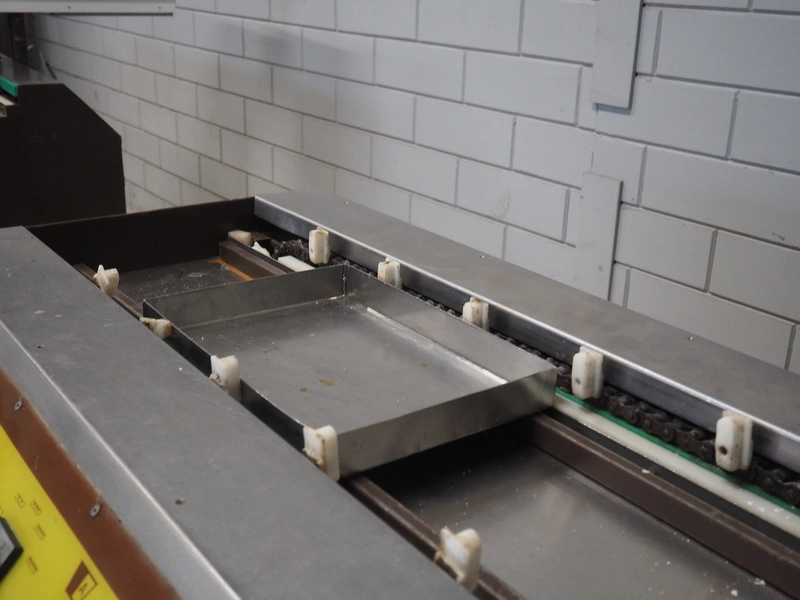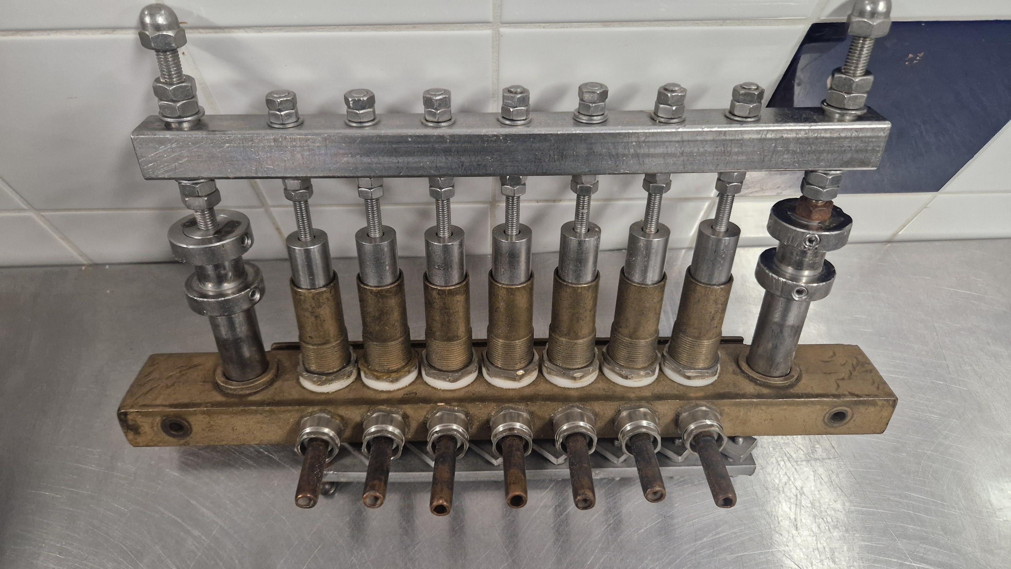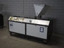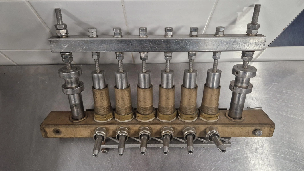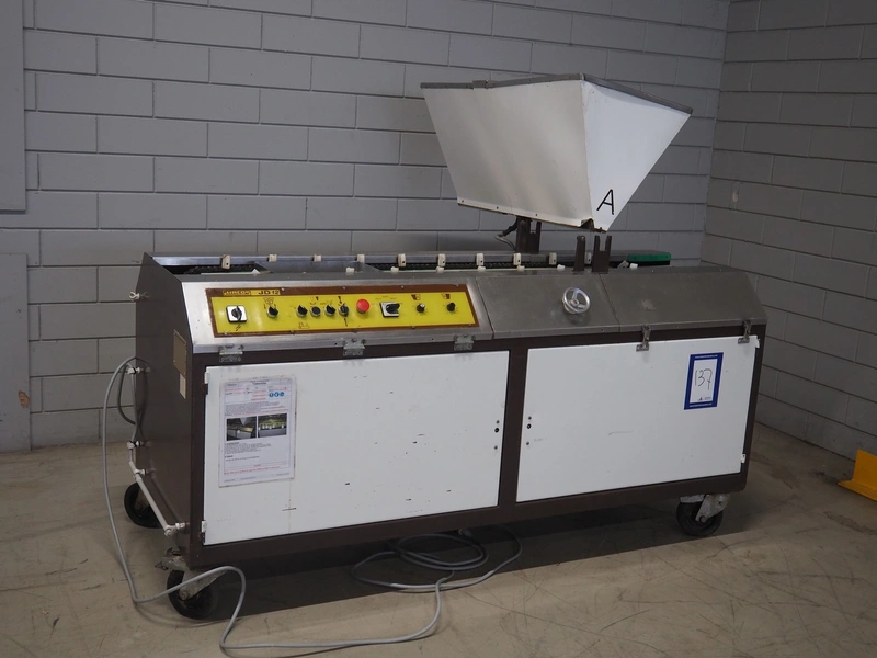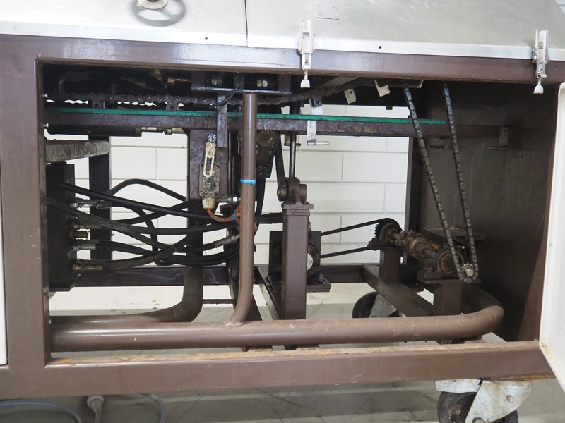 Hacos mobile filling machine, type: JD12, serial number: 7655, year of construction: 1989, 3x 220 V, 10 A, inside dimensions funnel: (2x) 450 mm x 430 mm x 450 mm, total dimensions: 2000 mm x 1000 mm x 1600 mm. Funnel slightly damaged but still working. two filling heads; one 6 and one 7 pistons