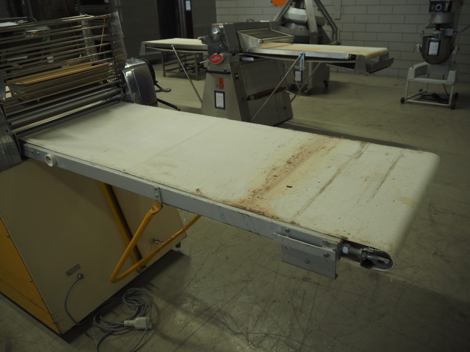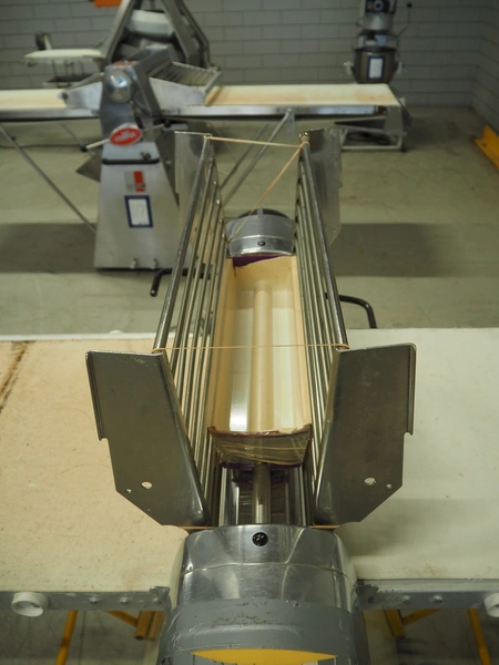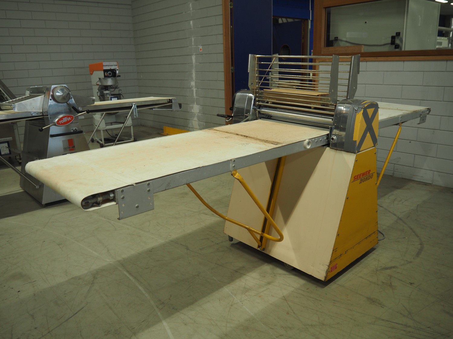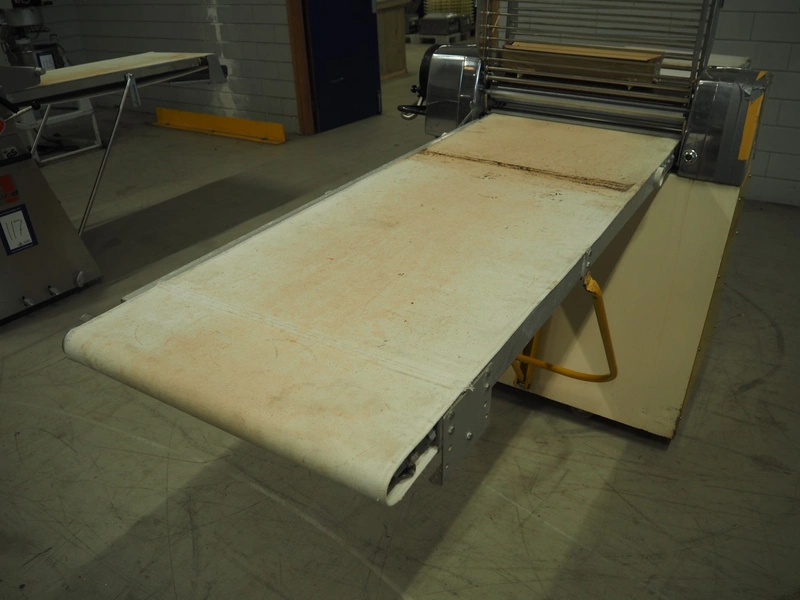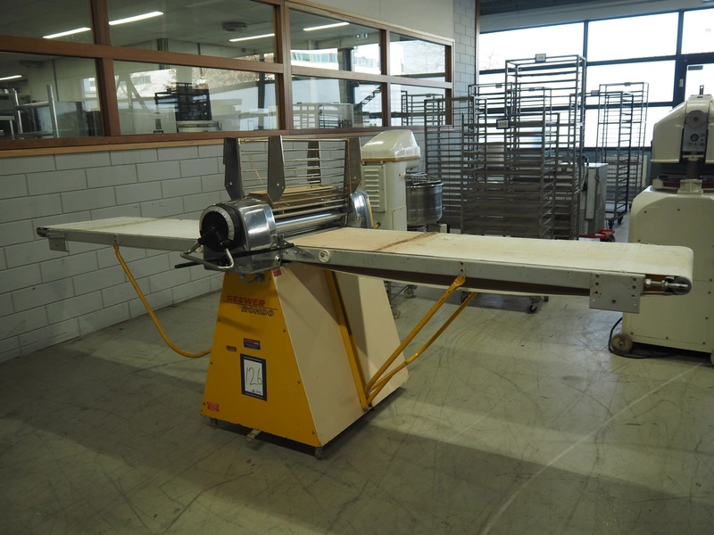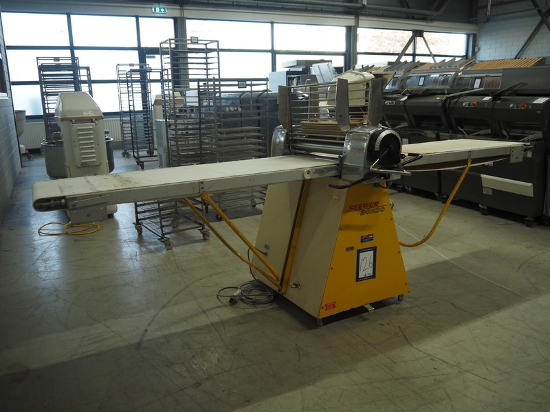 Seewer Rondo mobile dough sheeter, model: SS0 63, machine number: B2068008, cloth belt, belt width: 600 mm, total dimensions: 3500 mm x 1200 mm x 1300 mm.