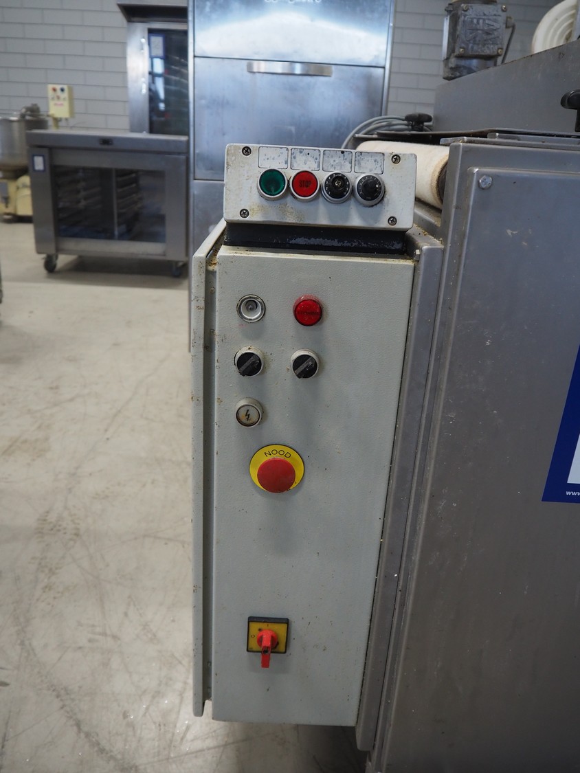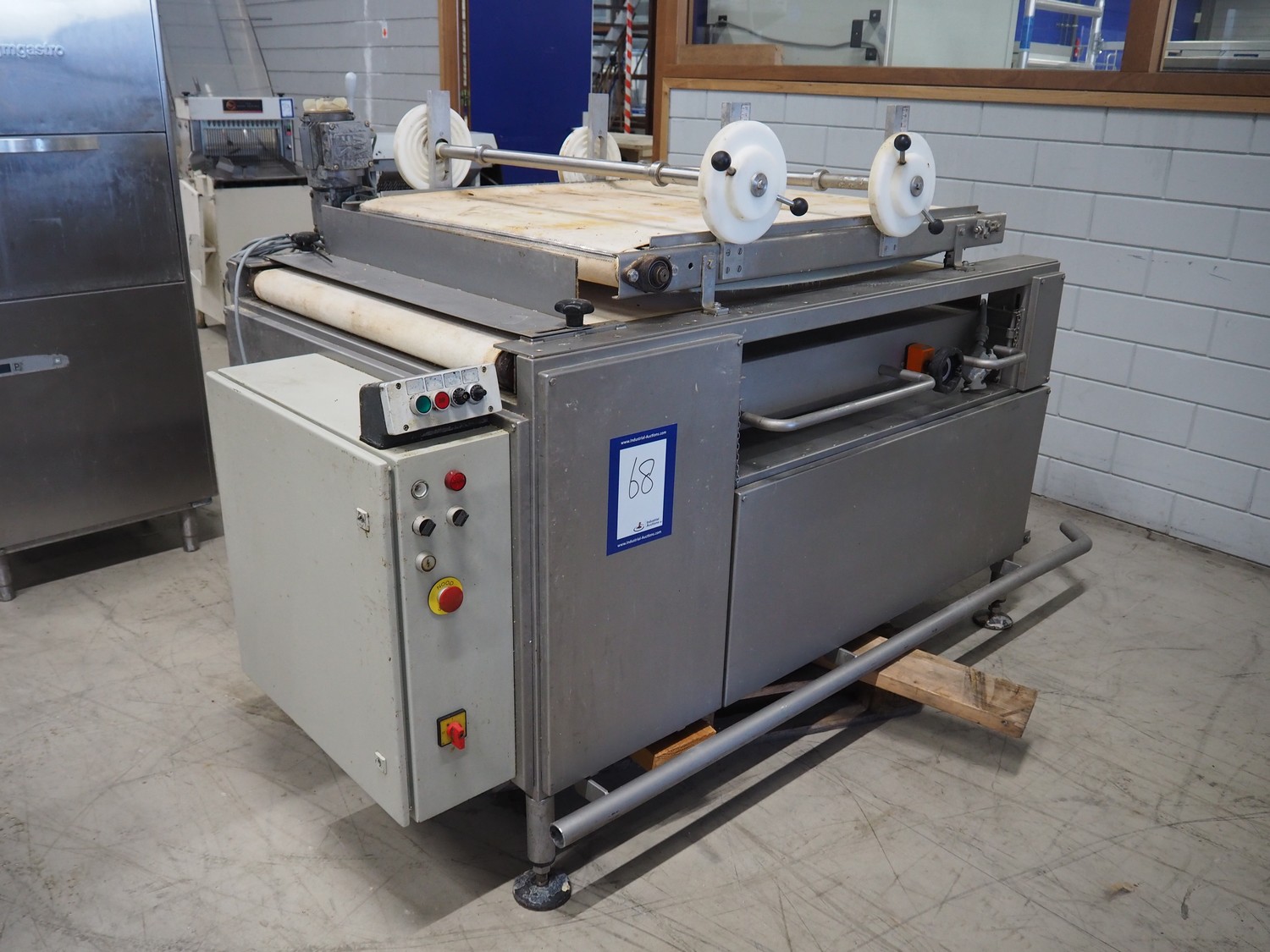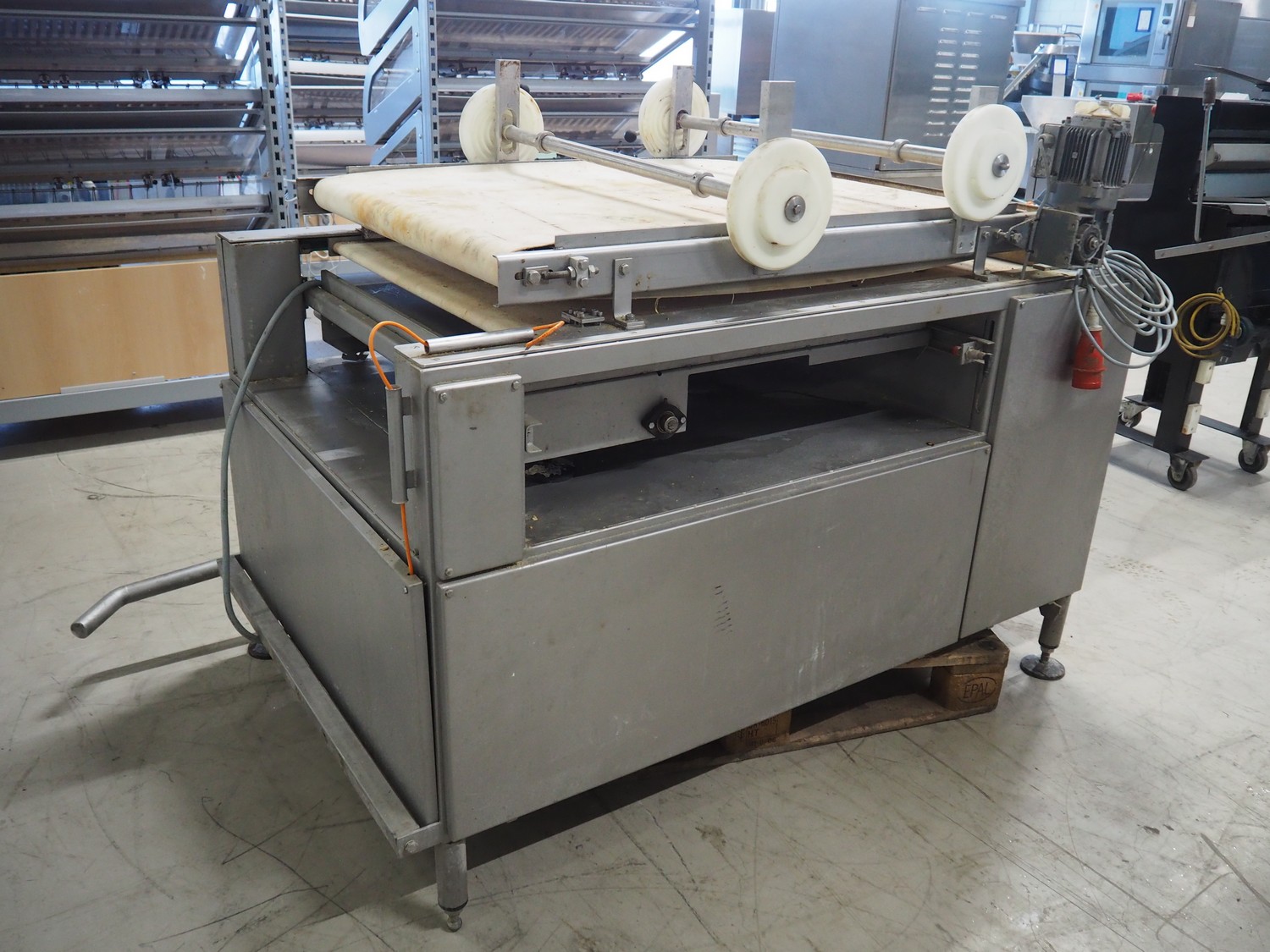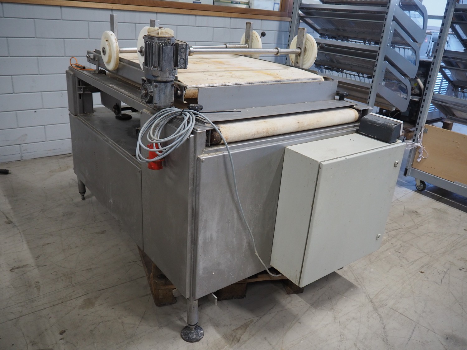 Dough rolling machine, 2 cloth belts, belt width: 835 mm, total dimensions: 2050 mm x 1150 mm x 1320 mm. Incomplete.