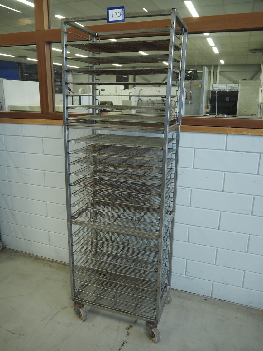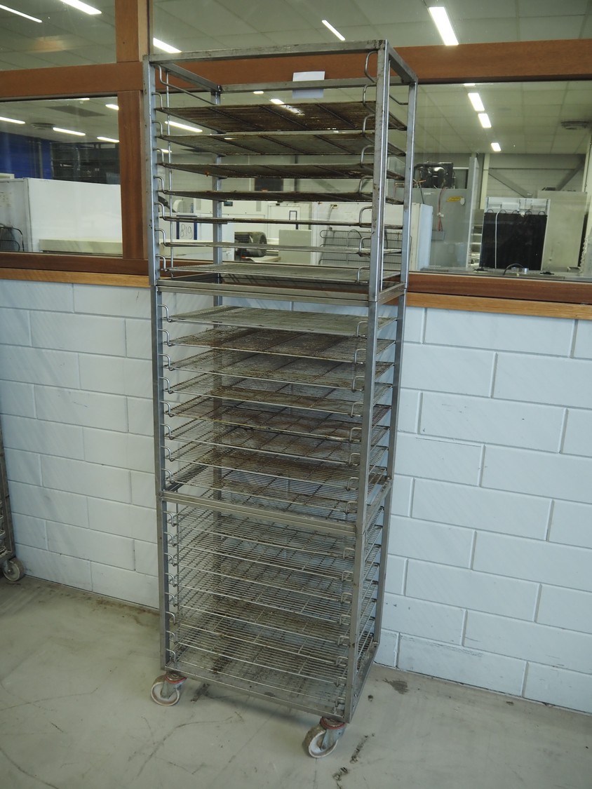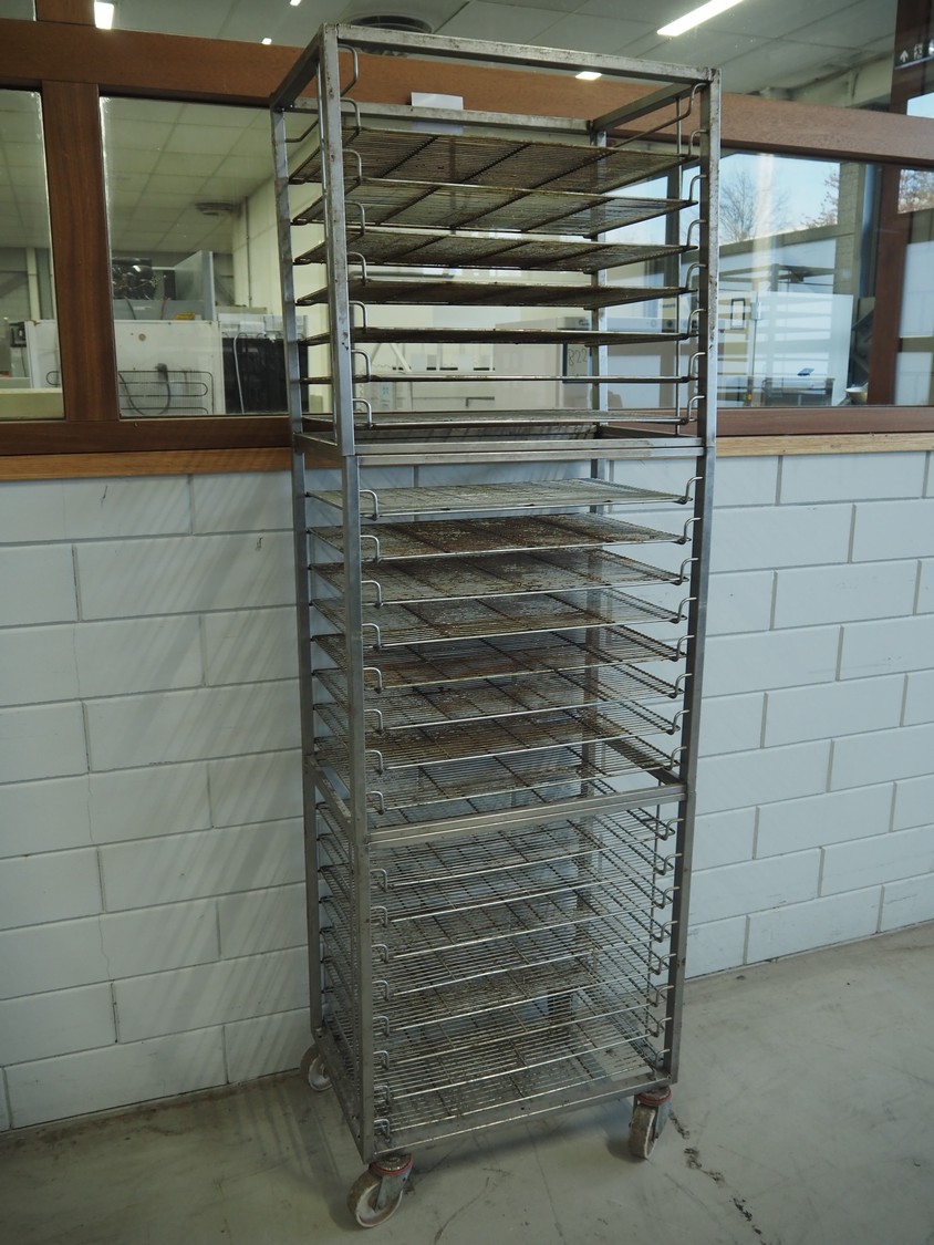 S/s trolley, 23 floors, dimensions floors: 650 mm x 420 mm, total dimensions: 660 mm x 420 mm x 1970 mm. Including 23 s/s racks.