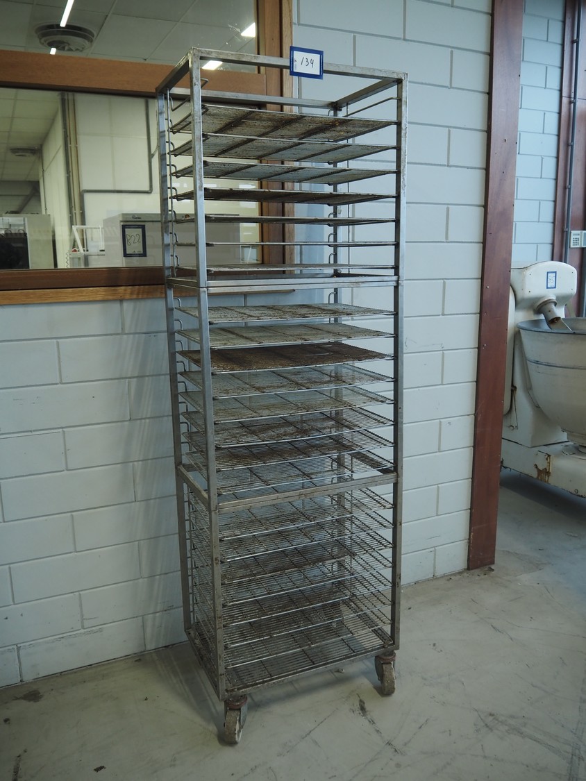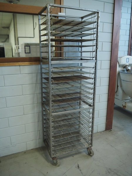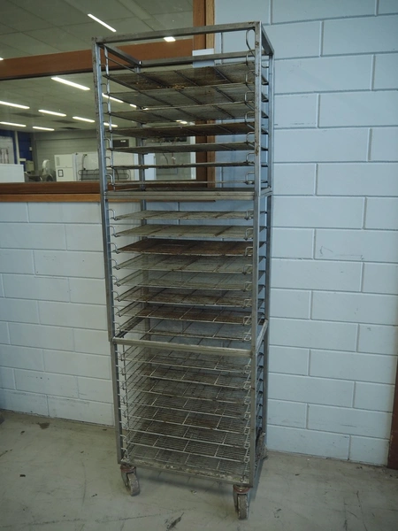 S/s trolley, 23 floors, dimensions floors: 650 mm x 420 mm, total dimensions: 660 mm x 420 mm x 1970 mm. Including 23 s/s racks.