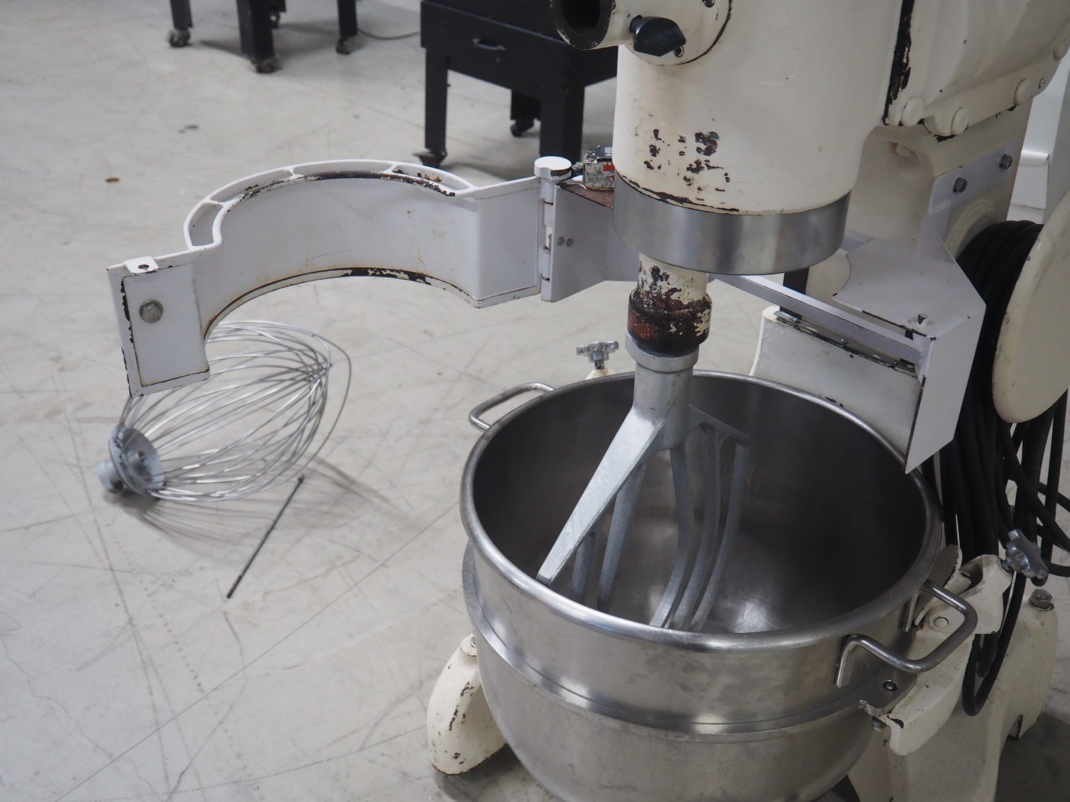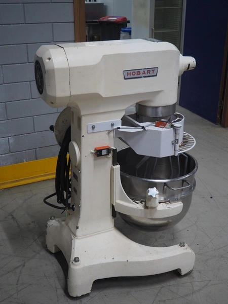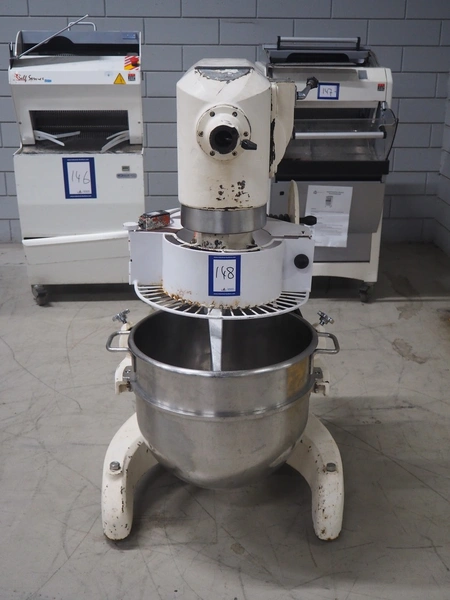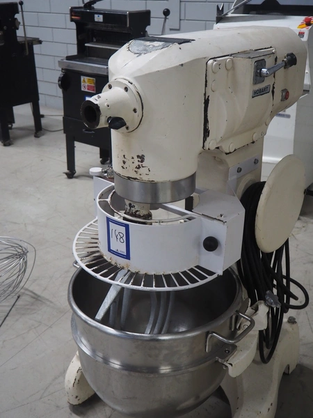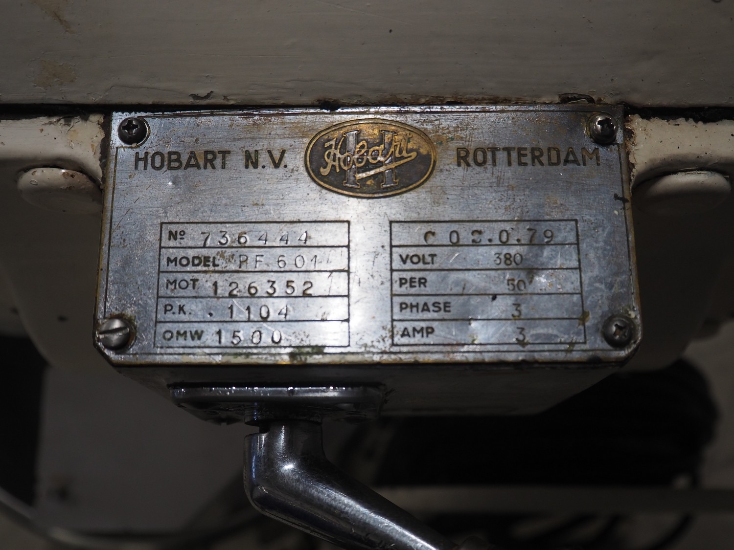 Hobart bowl mixer, model: PF 601, number: 736444, 380 V, 3 Ph, 50 Hz, 3 A, inside dimensions bowl: ø 400 mm x 350 mm, total dimensions: 900 mm x 500 mm x 1270 mm. Including extra whisk.