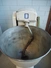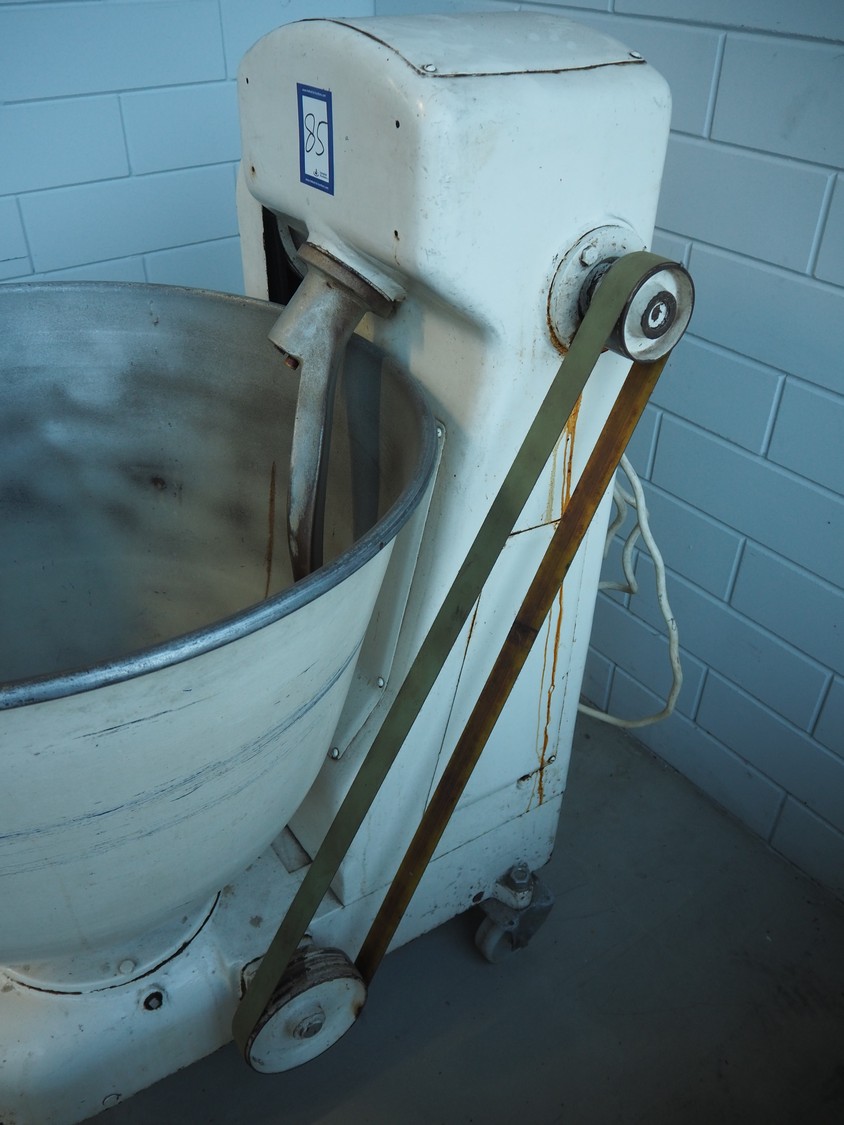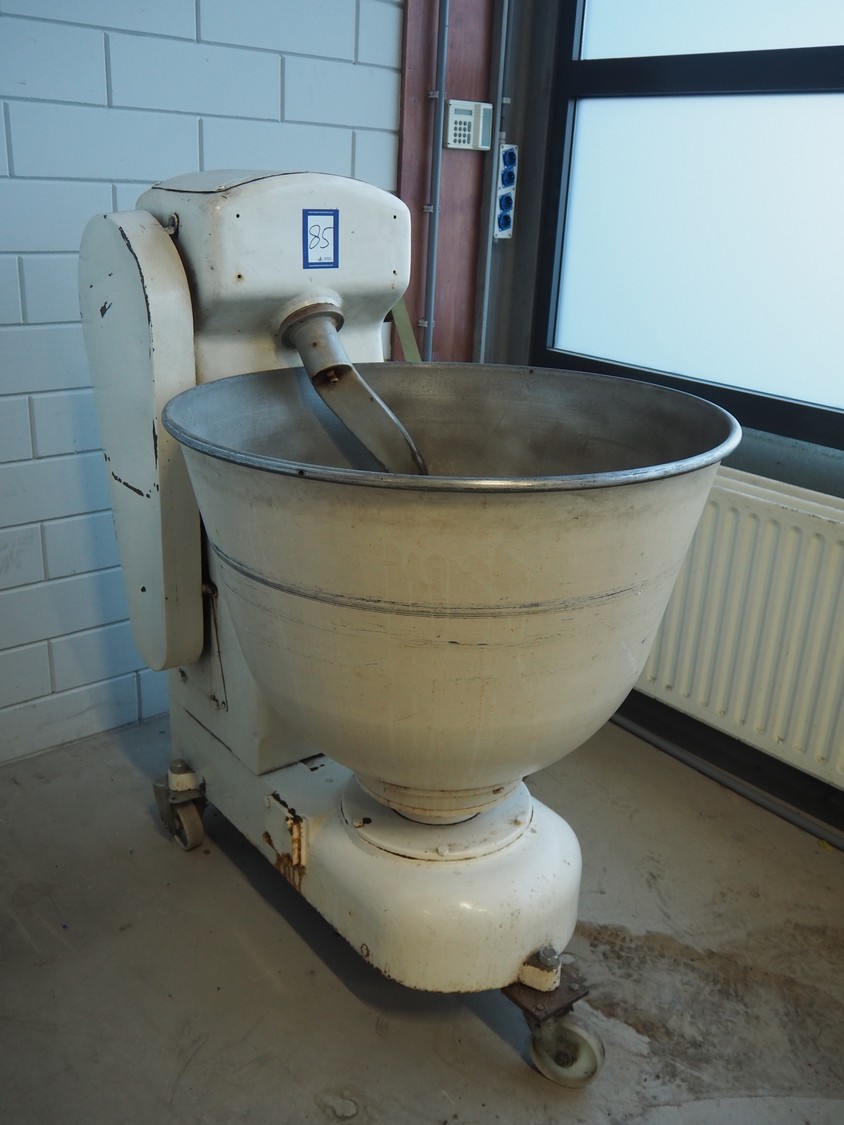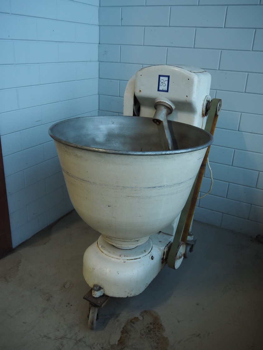 Mobile mixer, steel bowl, dimensions bowl: Ø 830 mm x 620 mm, total dimensions: 1200 mm x 870 mm x 1400 mm. Missing cover.
