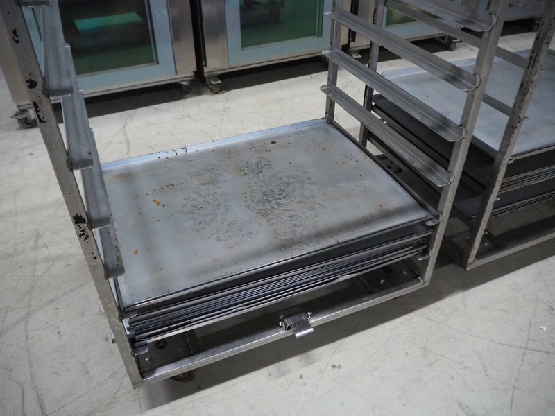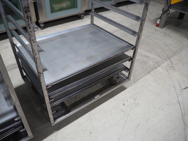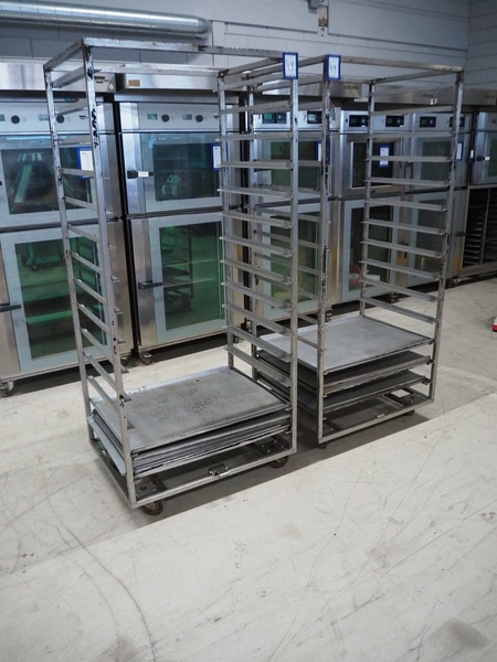 2 s/s trolleys, 14 floors each, floor dimensions: 810 mm x 630 mm, total dimensions: (2x) 870 mm x 650 mm x 1940 mm. Including plates.