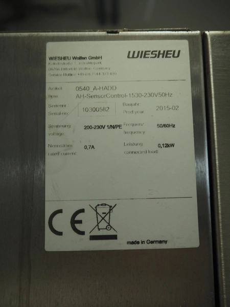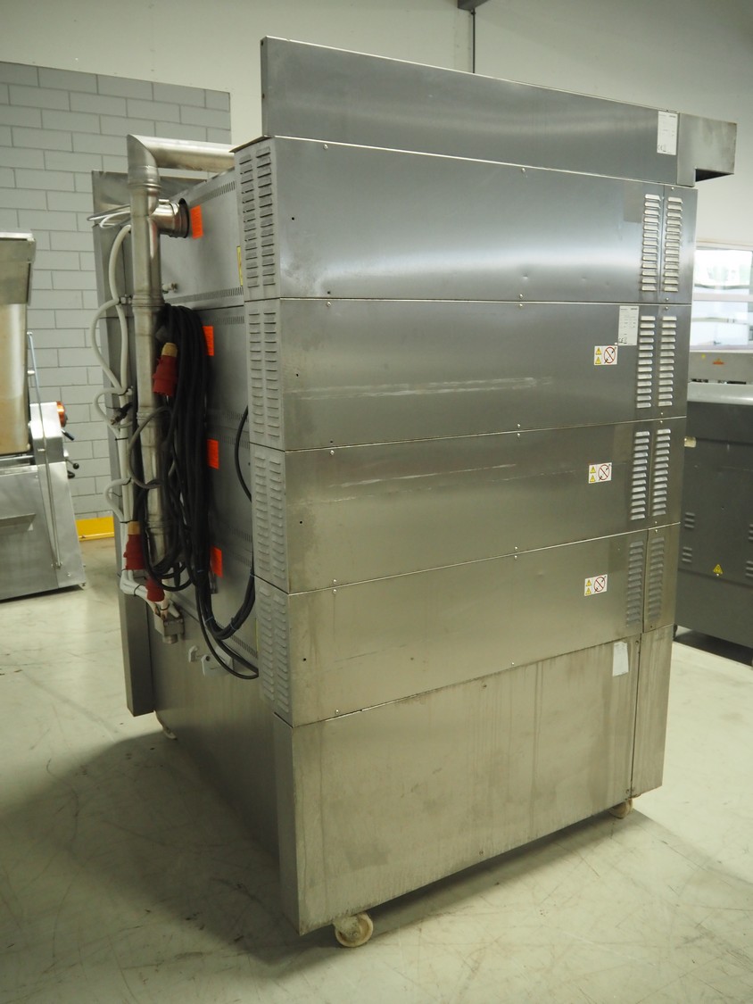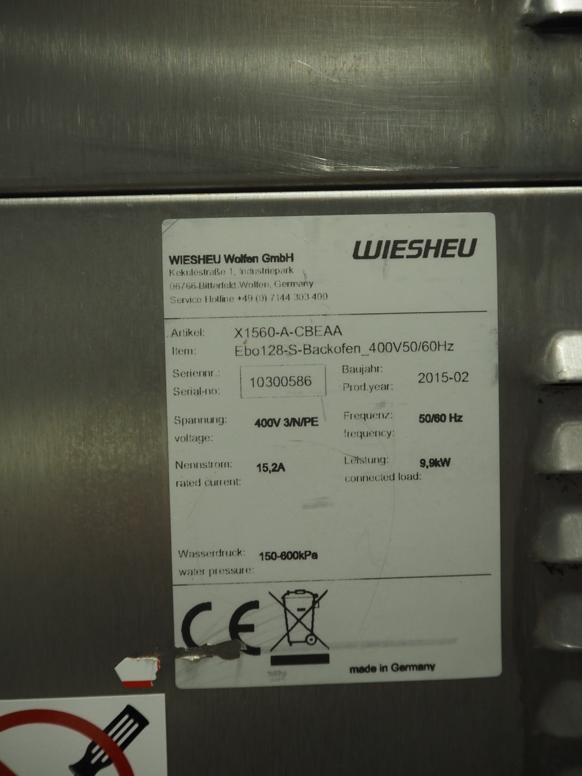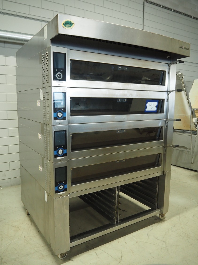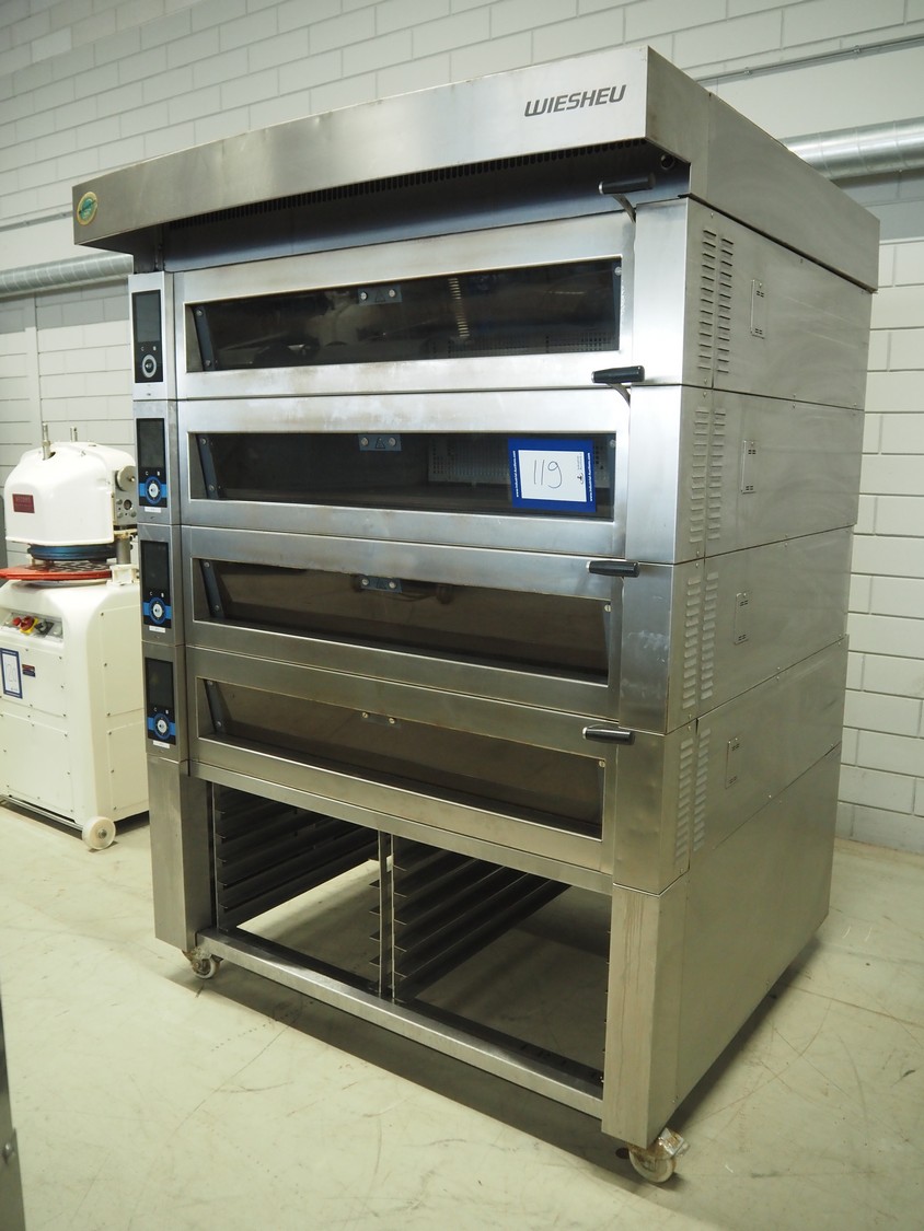 Wiesheu GmbH mobile deck oven, serial number: 10300582/10300586, year of construction: 2015-02, 400 V, 3 Ph, 50/60 Hz, 15.2 A, 9.9 kW, 4 decks, inside dimensions: (4x) 1240 mm x 870 mm x 165 mm, total dimensions: 1530 mm x 1470 mm x 2150 mm.