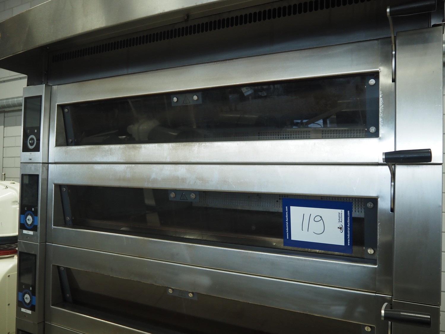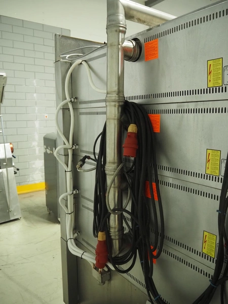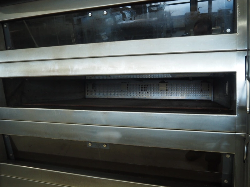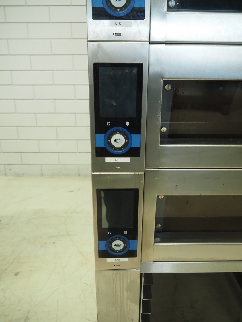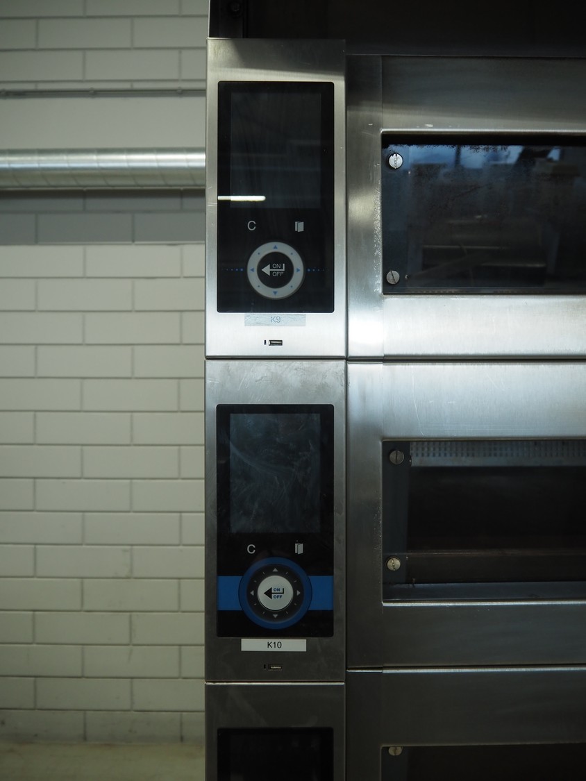 Wiesheu GmbH mobile deck oven, serial number: 10300582/10300586, year of construction: 2015-02, 400 V, 3 Ph, 50/60 Hz, 15.2 A, 9.9 kW, 4 decks, inside dimensions: (4x) 1240 mm x 870 mm x 165 mm, total dimensions: 1530 mm x 1470 mm x 2150 mm.