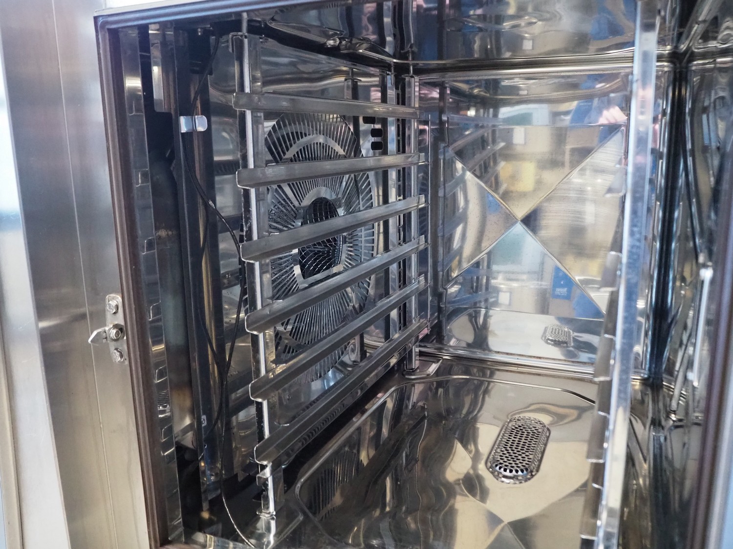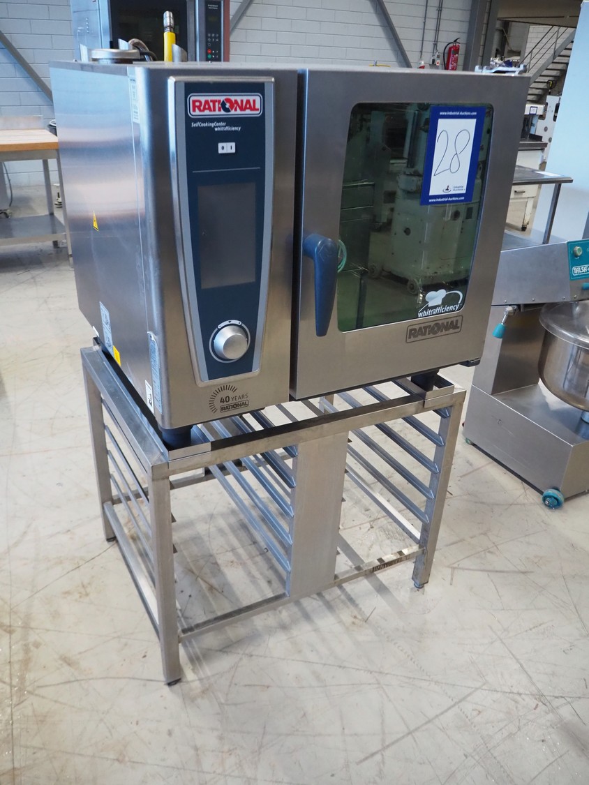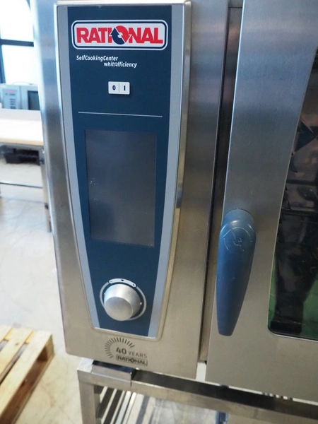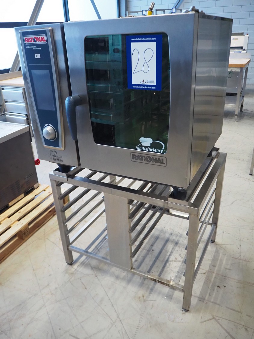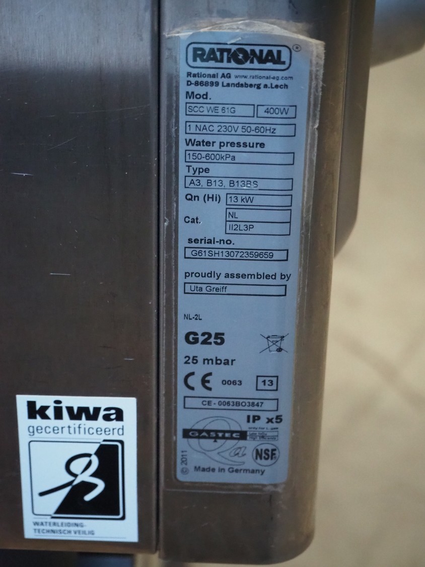 Rational combi steamer, model: SCC WE 61G, serial number: G61SH13072359659, year of construction: 2013, 230 V, 1 Ph, 50-60 Hz, 400 W, gas heated, 6 floors, dimensions each floor: 530 mm x 330 mm, total dimensions: 850 mm x 850 mm x 1550 mm.