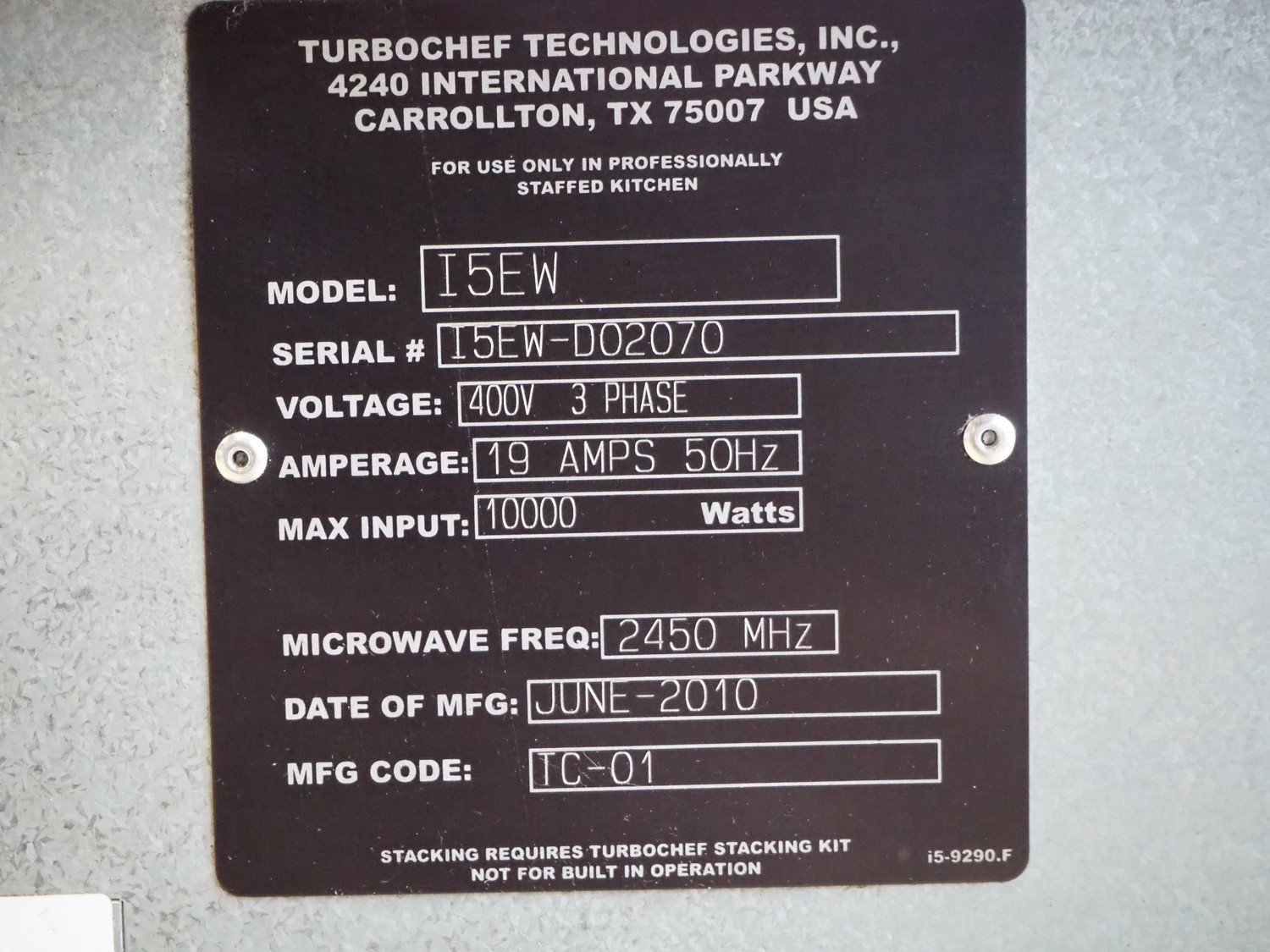 Turbochef Technologies turbo oven, model: I5EW, serial number: I5EW-D02070, year of construction: June 2010, 400 V, 3 Ph, 50 Hz, 19 A, 10000 W, inside dimensions: 610 mm x 400 mm x 250 mm, total dimensions: 750 mm x 690 mm x 610 mm.