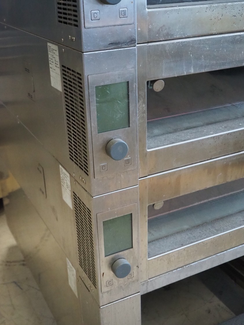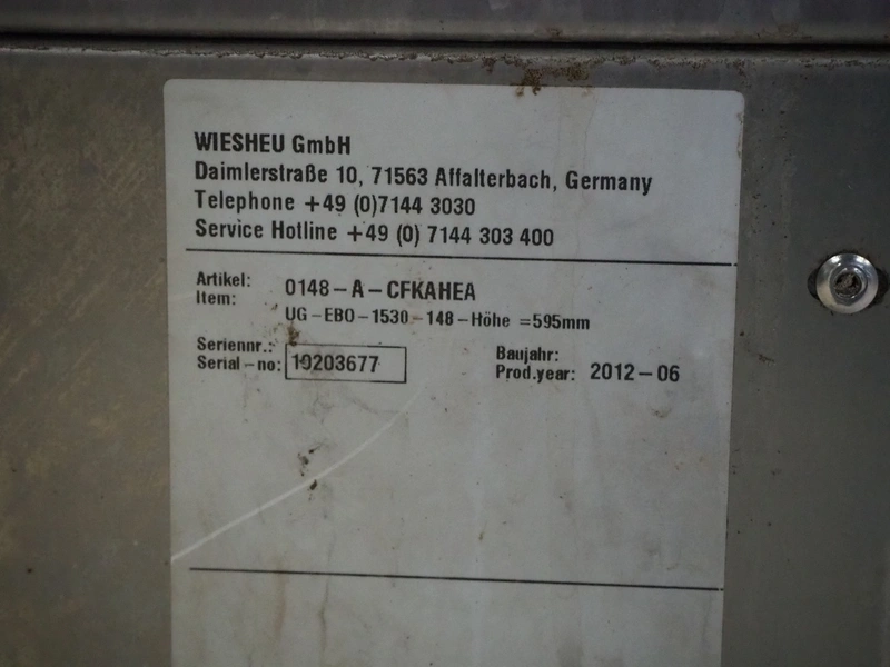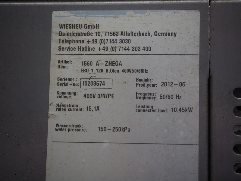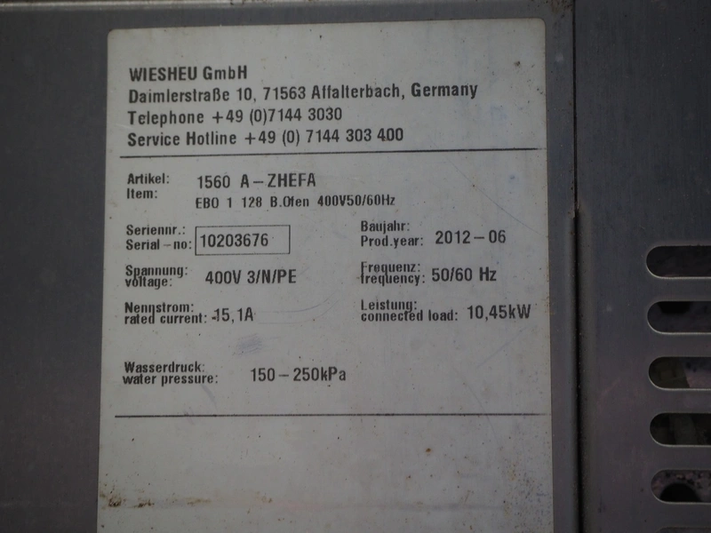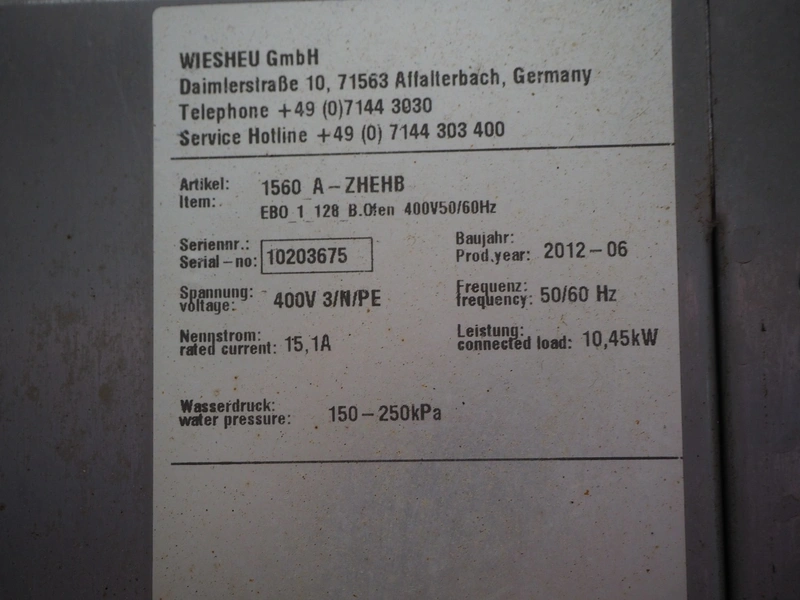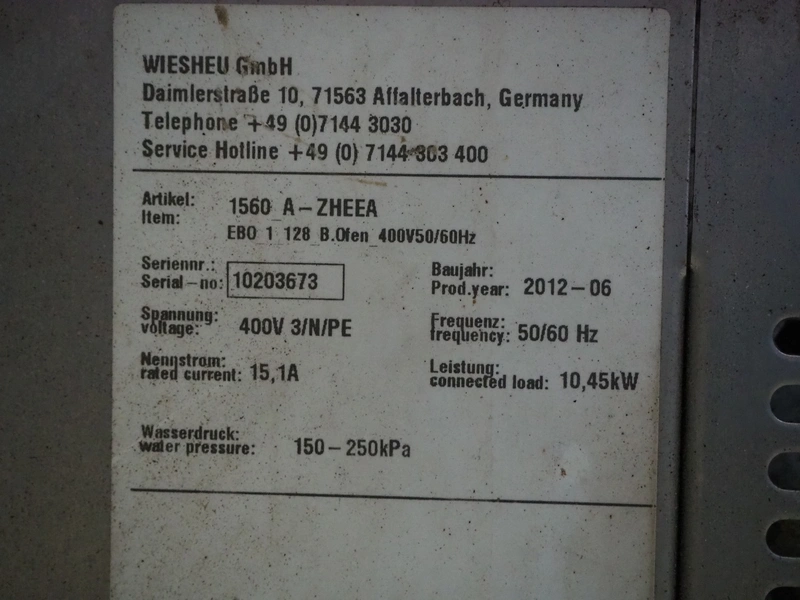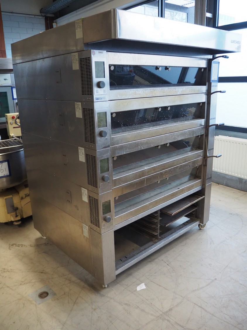 Wiesheu GmbH mobile deck oven, model: EBO_1_128_B.Ofen, serial numbers: 10203675/10203674/10203676/10203673, year of construction: 06-2012, 400 V, 3 Ph, 50/60 Hz, 15.1 A, 10.45 kW, 4 decks, inside dimensions: (4x) 900 mm x 1200 mm x 150 mm, total dimensions: 1500 mm x 1550 mm x 2050 mm.