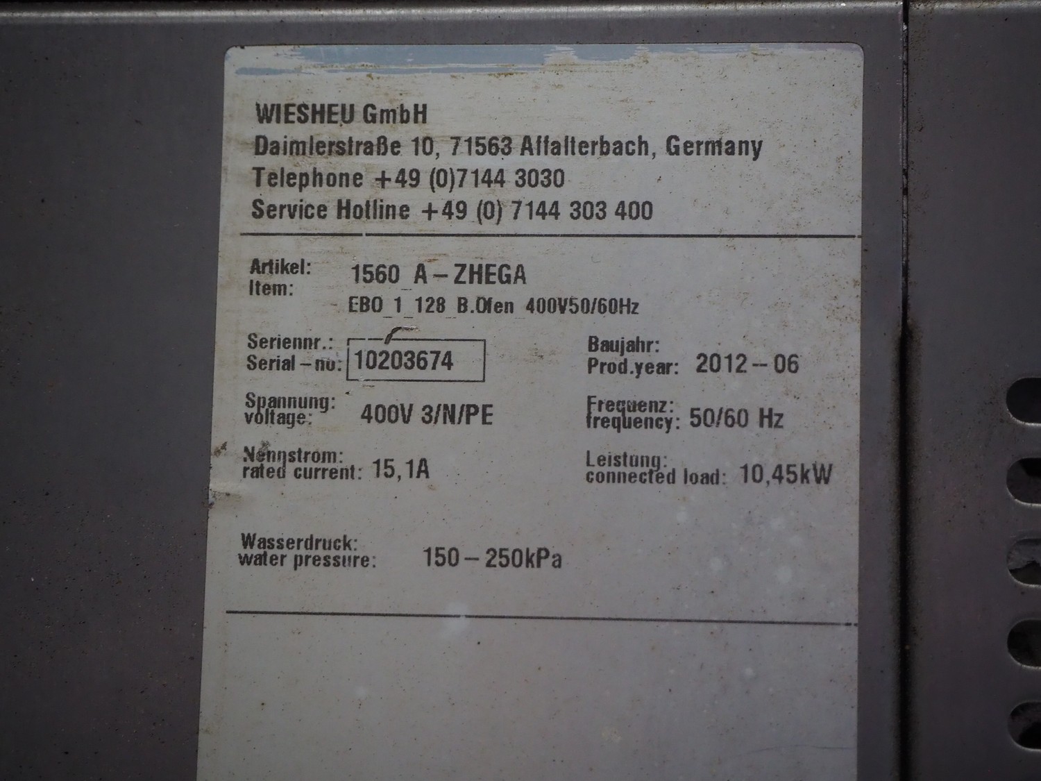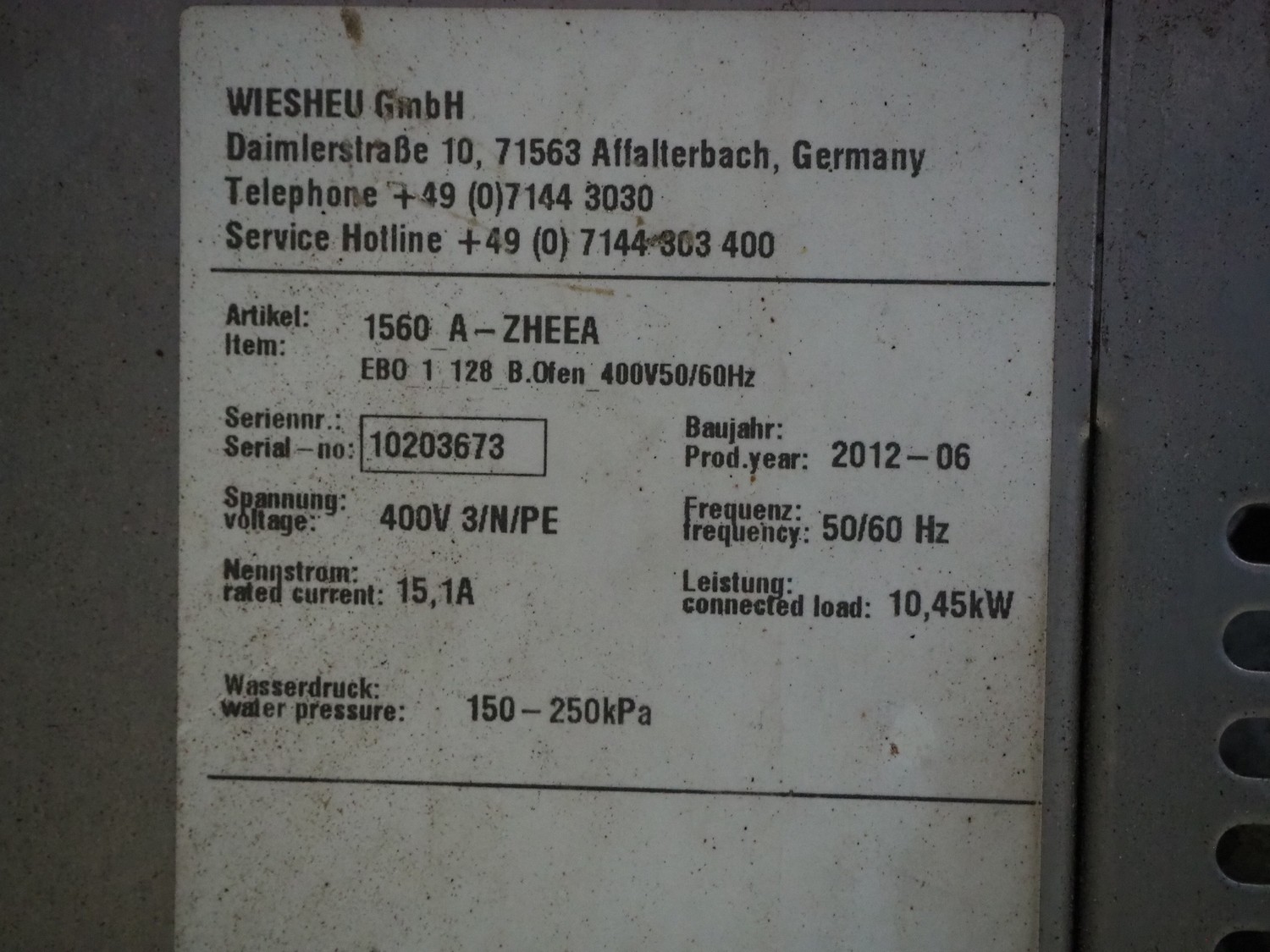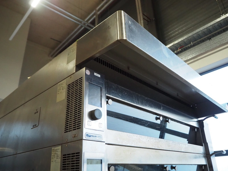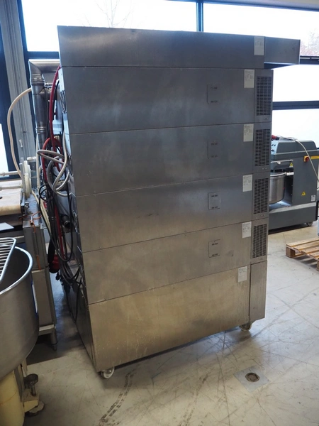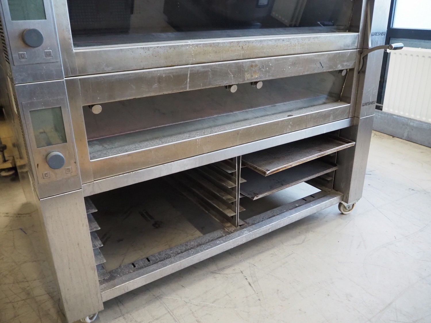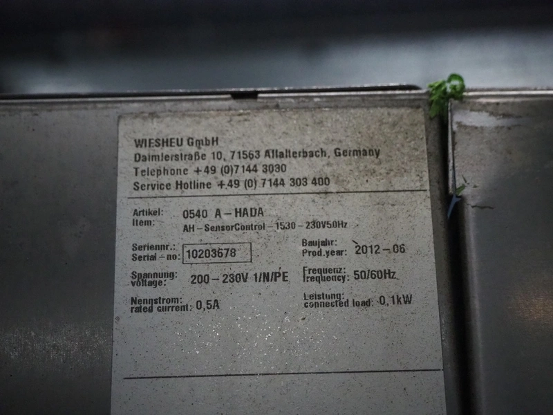 Wiesheu GmbH mobile deck oven, model: EBO_1_128_B.Ofen, serial numbers: 10203675/10203674/10203676/10203673, year of construction: 06-2012, 400 V, 3 Ph, 50/60 Hz, 15.1 A, 10.45 kW, 4 decks, inside dimensions: (4x) 900 mm x 1200 mm x 150 mm, total dimensions: 1500 mm x 1550 mm x 2050 mm.
