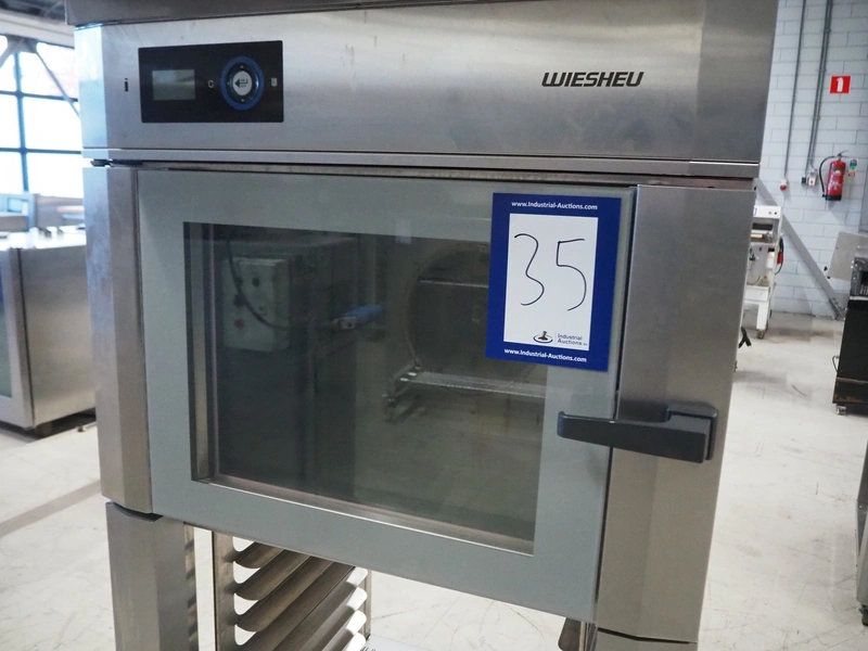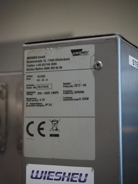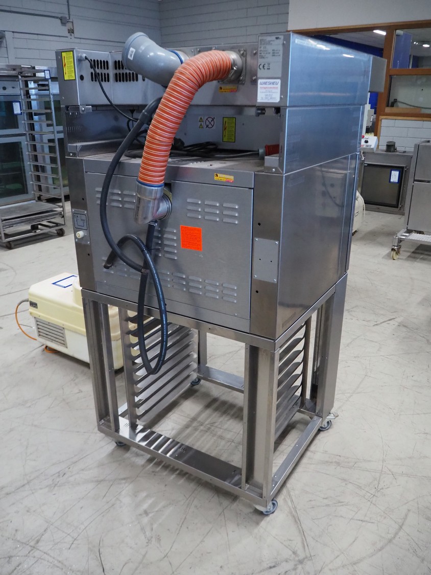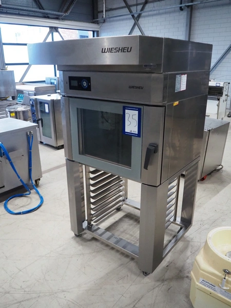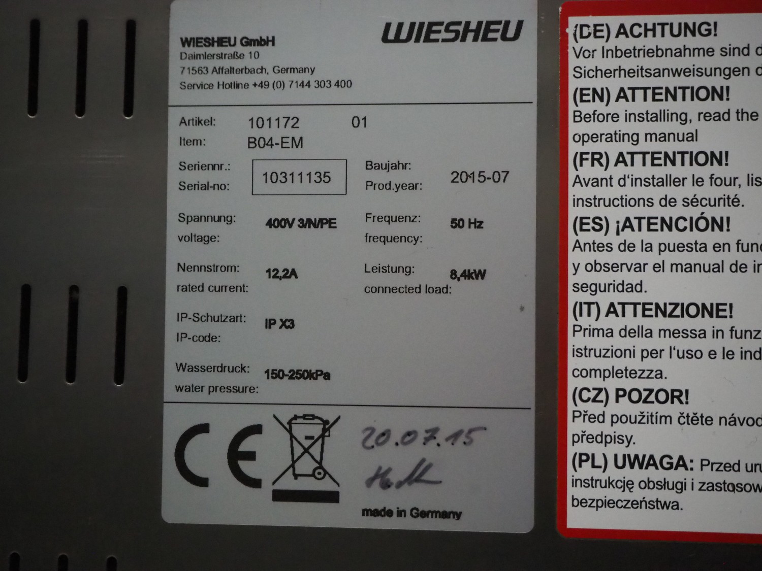 Wiesheu GmbH mobile oven, model: B04-EM, serial number: 10311135, year of construction: 07-2015, 400 V, 3 Ph, 50 Hz, 12.2 A, 8.4 kW, 5 floors, dimensions each floor: 610 mm x 400 mm, total dimensions: 1200 mm x 950 mm x 1800 mm.