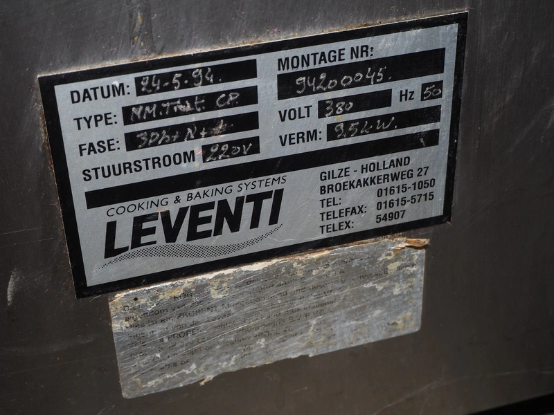 Leventi oven, type: NM.TUT.CP, number: 94200045, year of construction: 24-5-94, 380 V, 3 Ph, 50 Hz, 9,5 kW, 5 floors, floor dimensions: 360 mm x 615 mm, total dimensions: 720 mm x 980 mm x 885 mm.