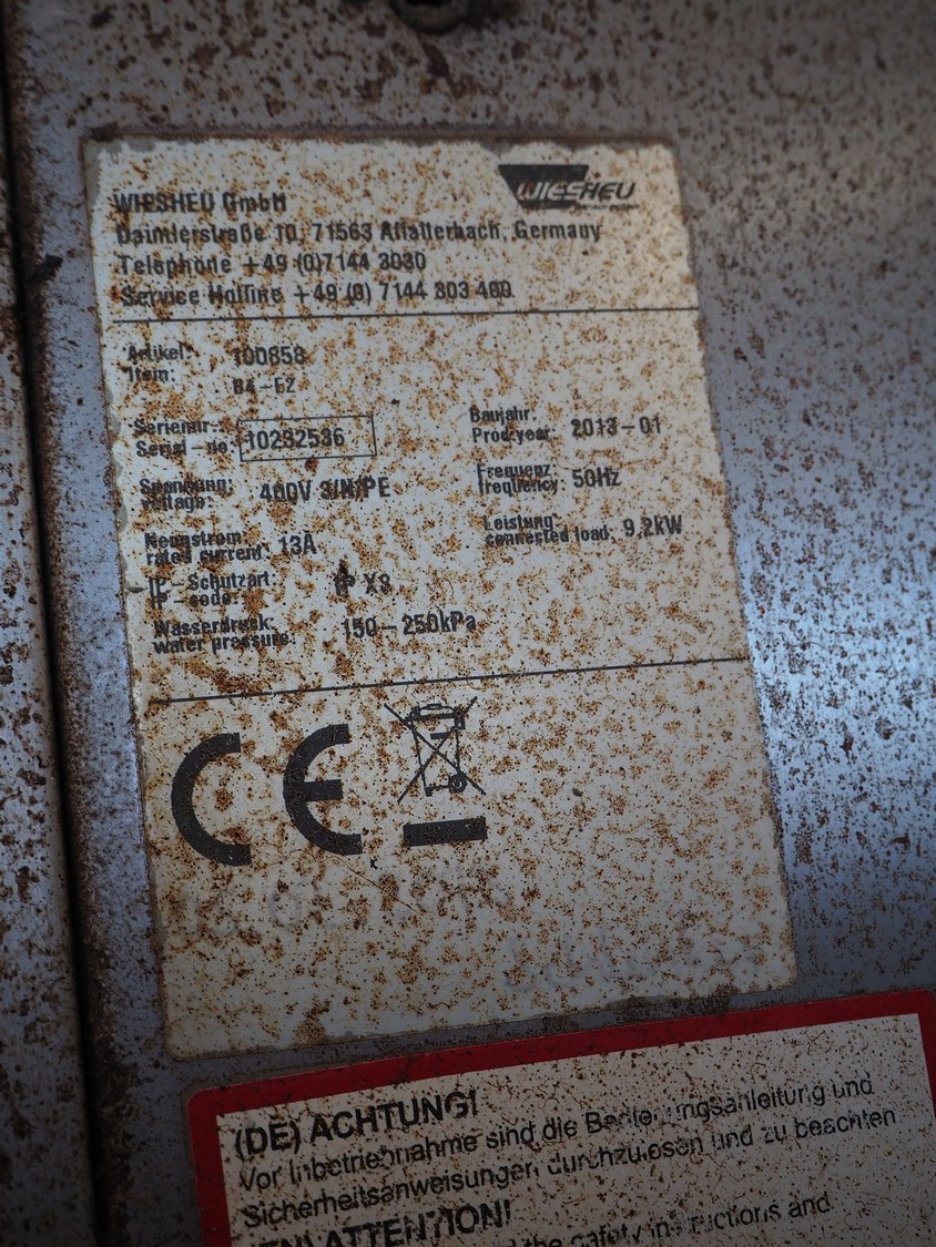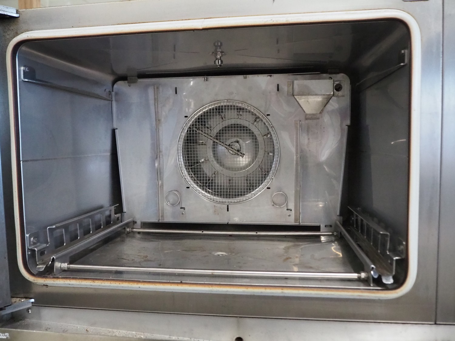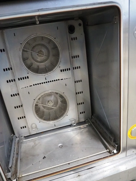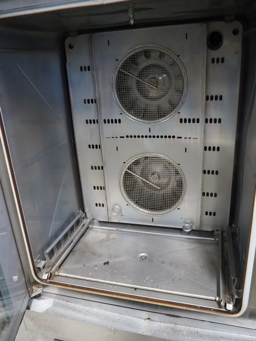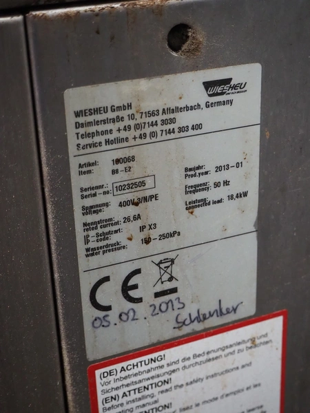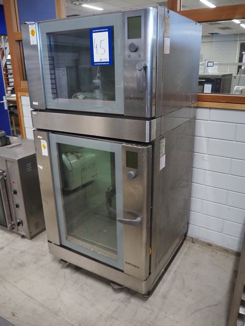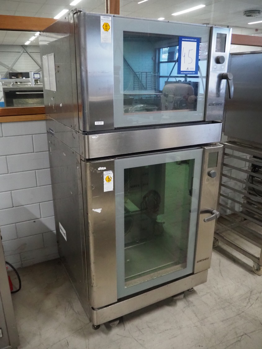 Wiesheu GmbH double stacked oven, type top oven: B4-E2, serial number: 10232536, year of construction: 01-2013, 400 V, 3 Ph, 50 Hz, 13 A, 9.2 kW, type bottom oven: B8-E2, serial number: 10232505, year of construction: 10-2013, 400 V, 3 Ph, 50 Hz, 26.6 A, 18.4 kW, dimensions: 765 mm x 530 mm x 1985 mm.