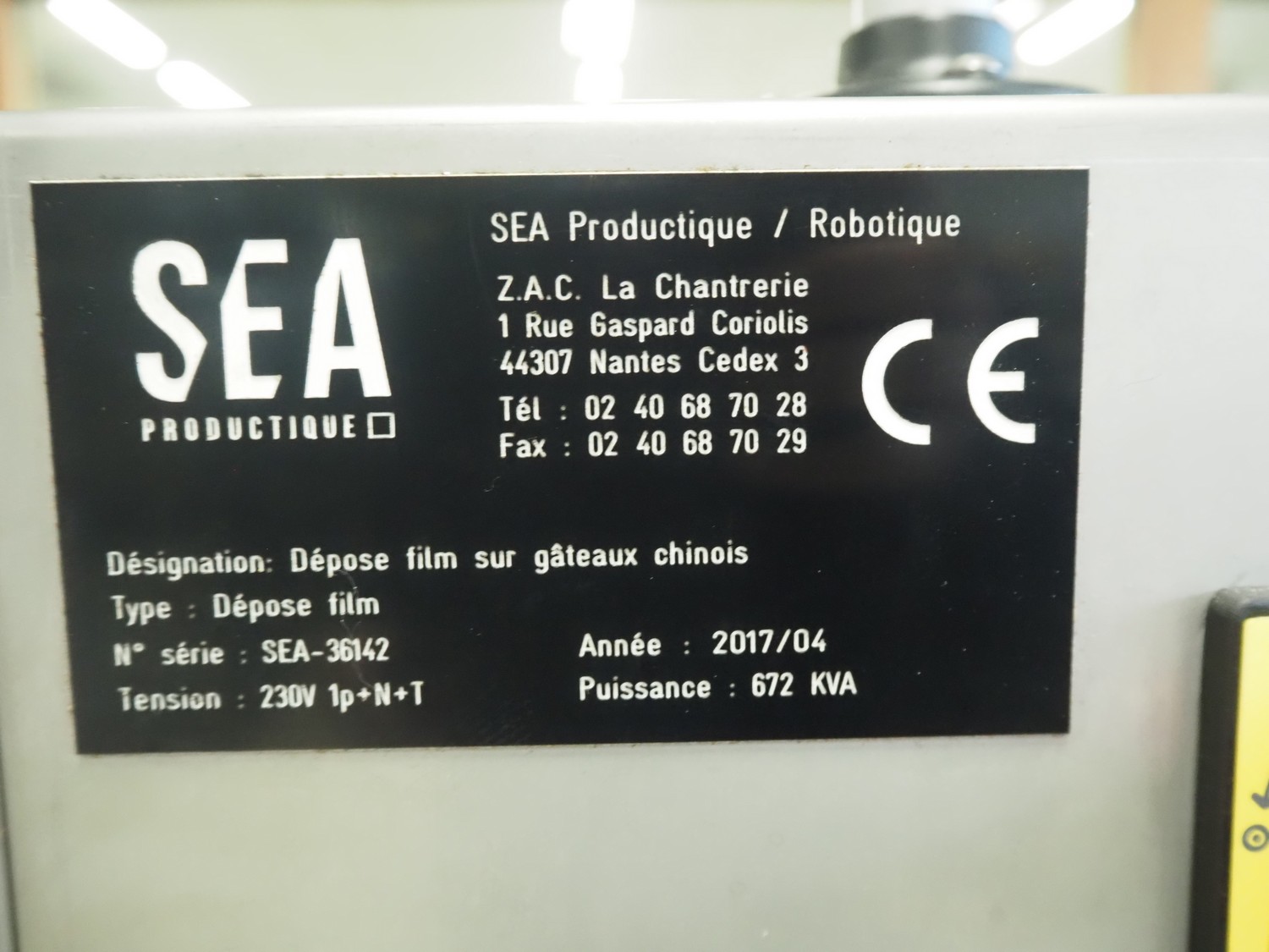 Sea Productique packaging line, type: Dépose film, serial number: SEA-36142, year of construction: 2017/04, 230 V, 1 Ph, dimensions: 1140 mm x 720 mm x 1530 mm.
