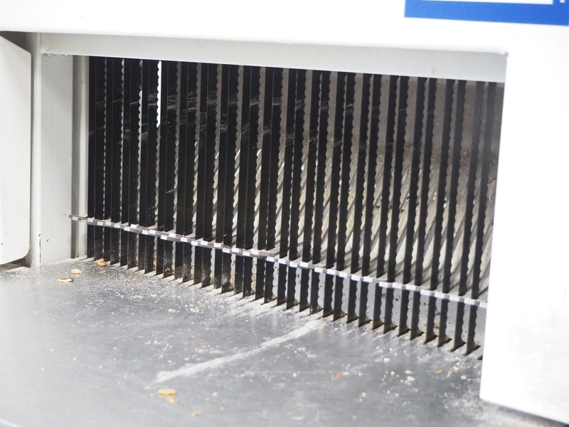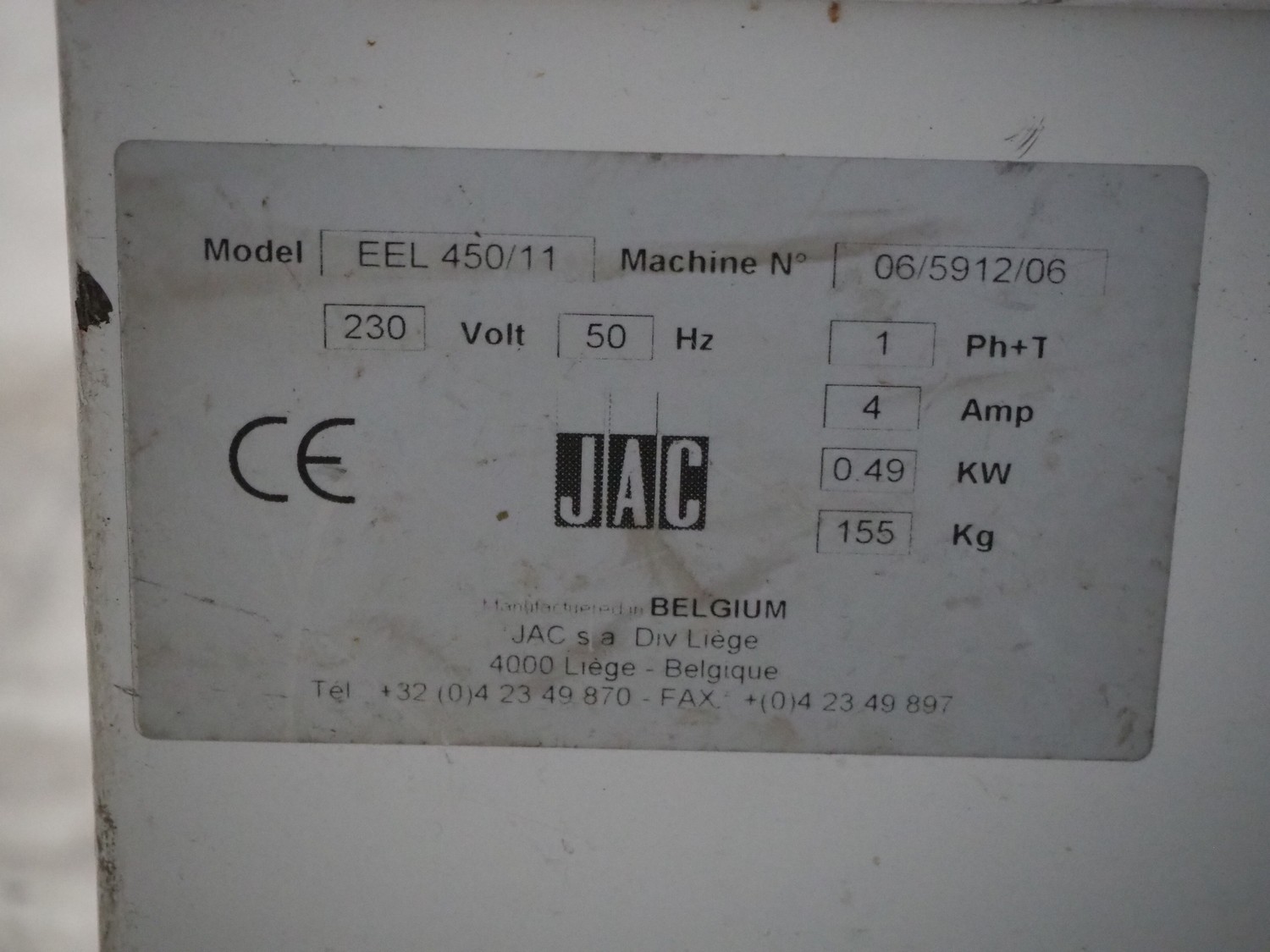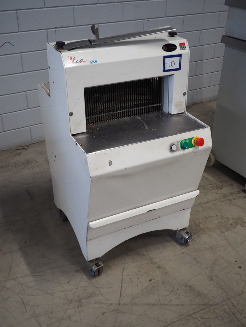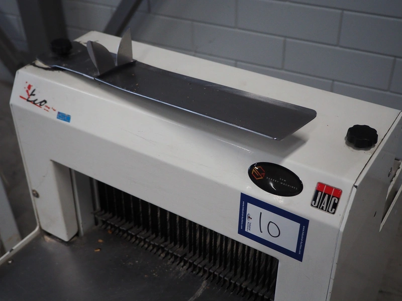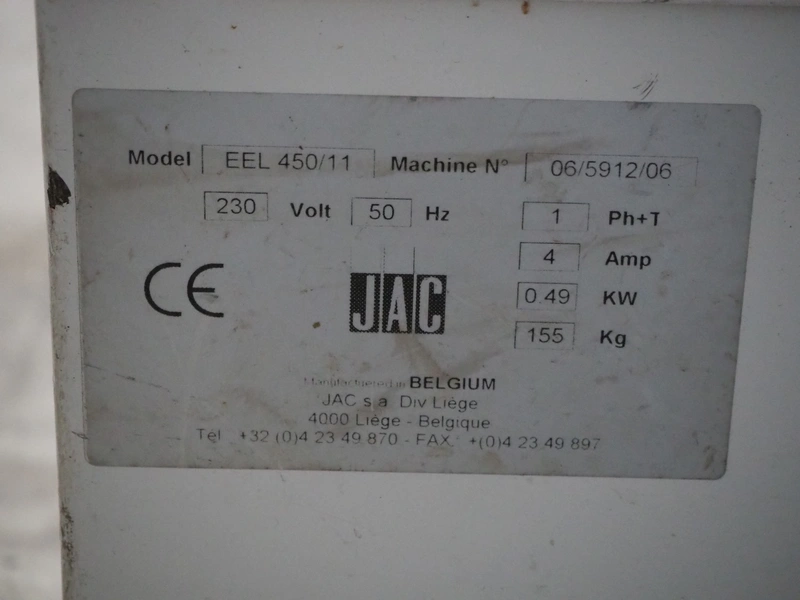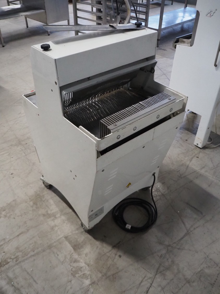 JAC mobile automatic bread slicer, model: EEL 450/11, machine number: 06/5912/06, 230 V, 1 Ph, 50 Hz, 4 A, 0.49 kW, weight: 155 kg, working width: 440 mm, distance between knives: 11 mm, total dimensions: 620 mm x 750 mm x 1200 mm.