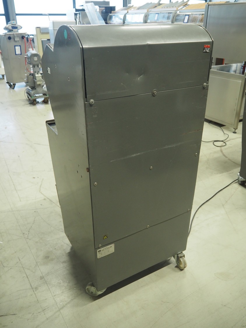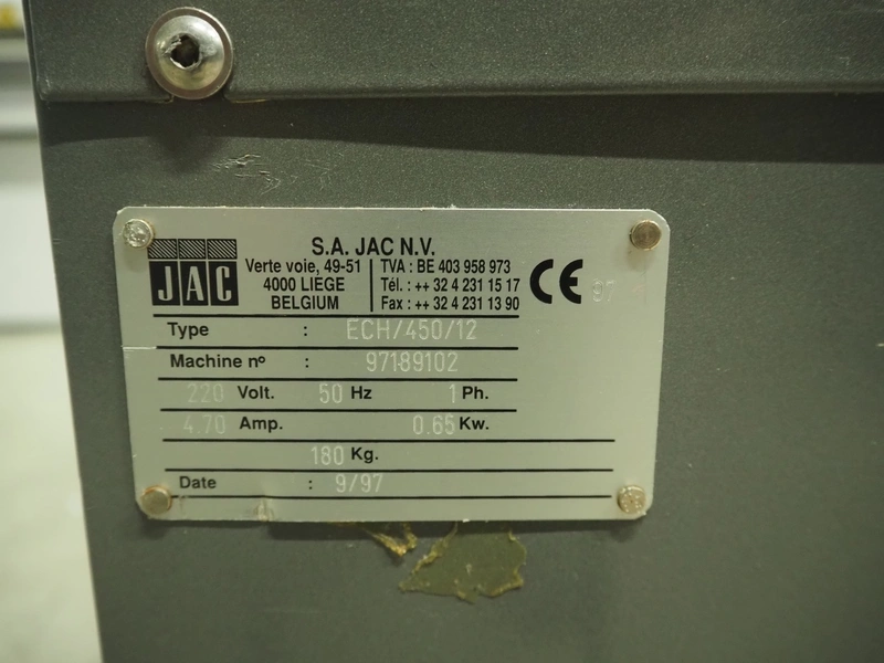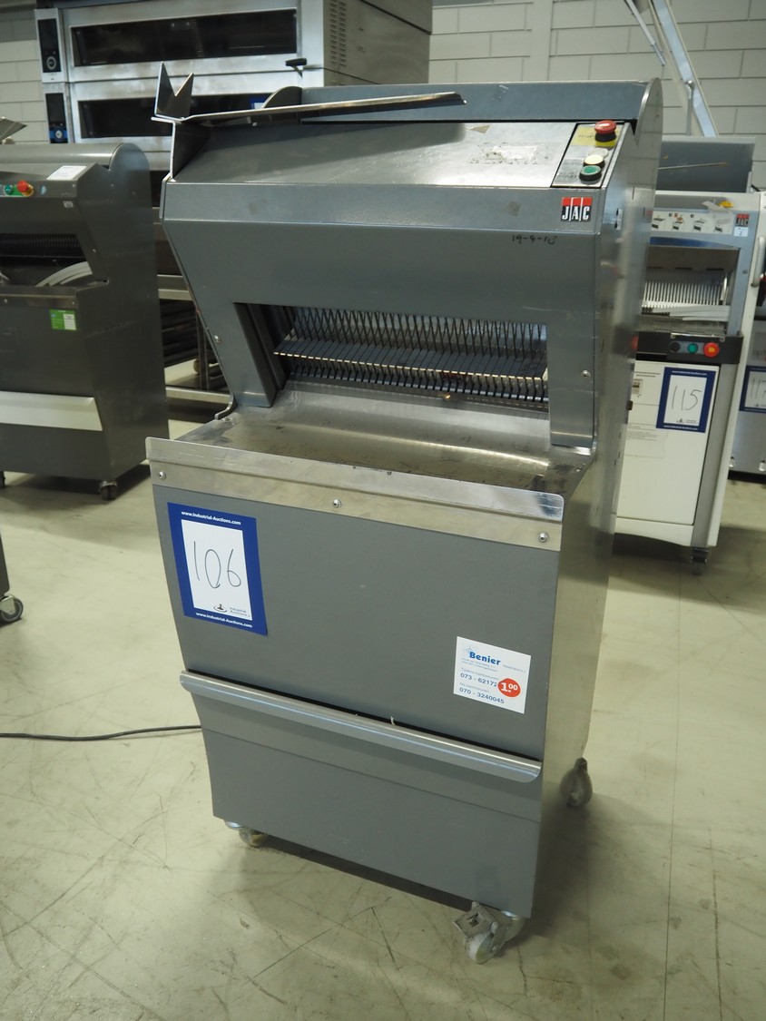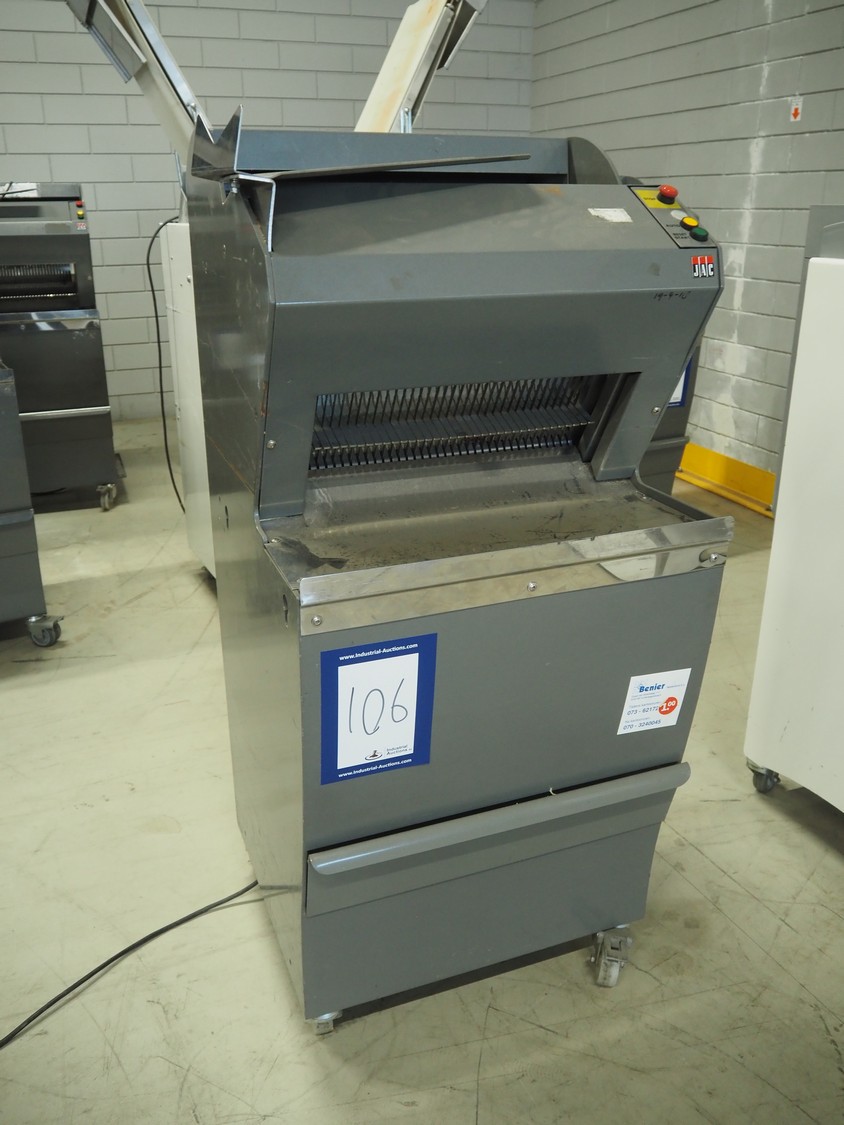 JAC mobile automatic bread slicer, model: ECH/450/12, machine number: 97189102, year of construction: 9/97, 220 V, 1 Ph, 50 Hz, 4.7 A, 0.65 kW, 180 kg, 34 knives, distance between knives: 12 mm, total dimensions: 590 mm x 610 mm x 1350 mm.