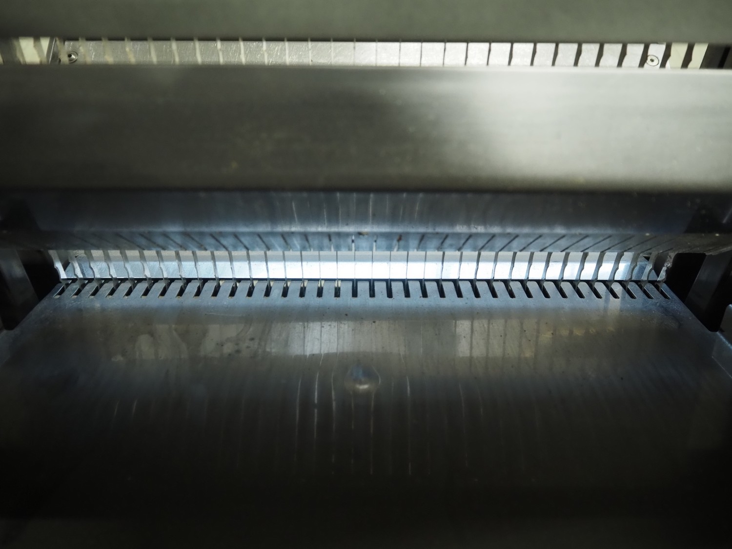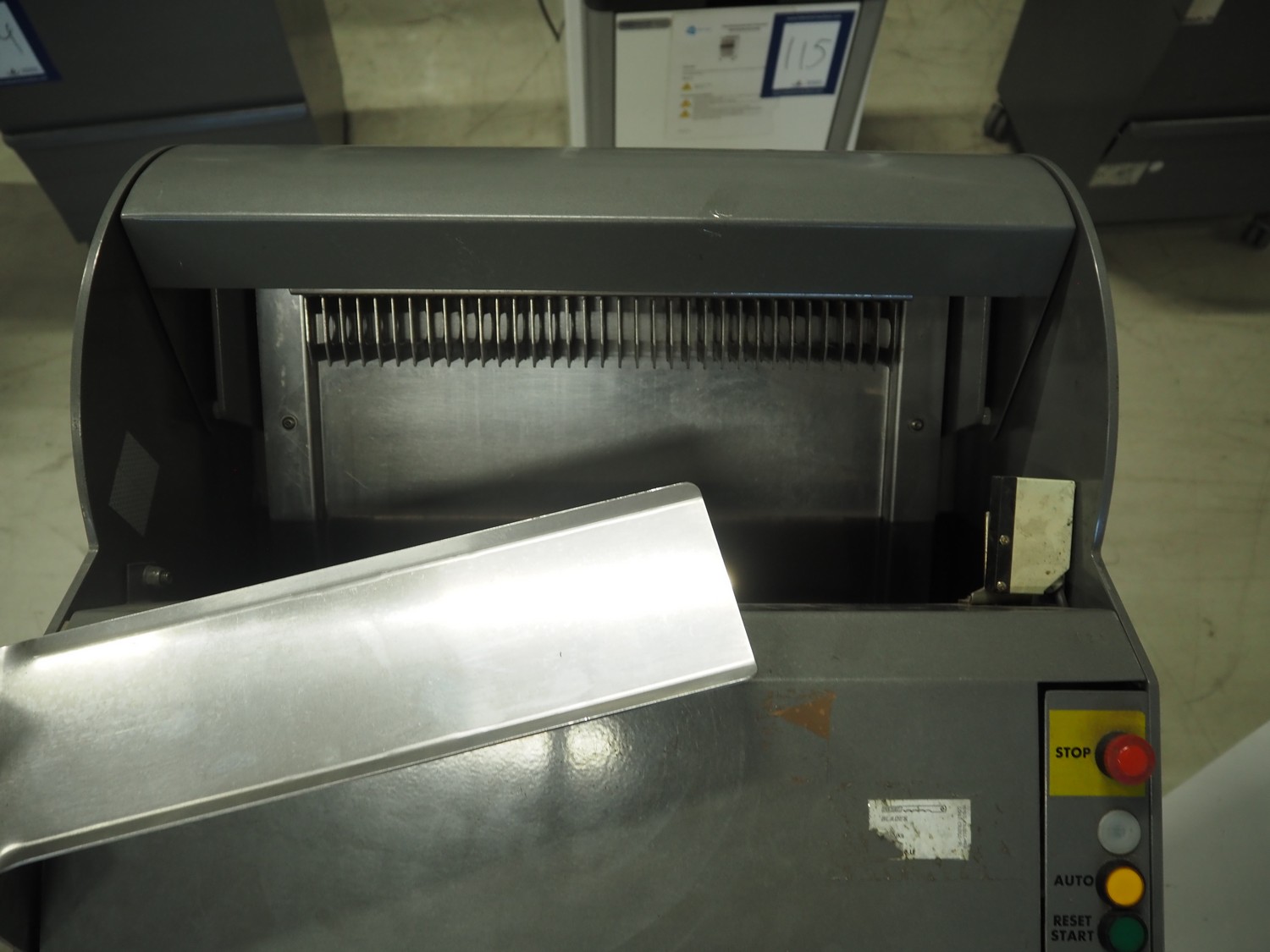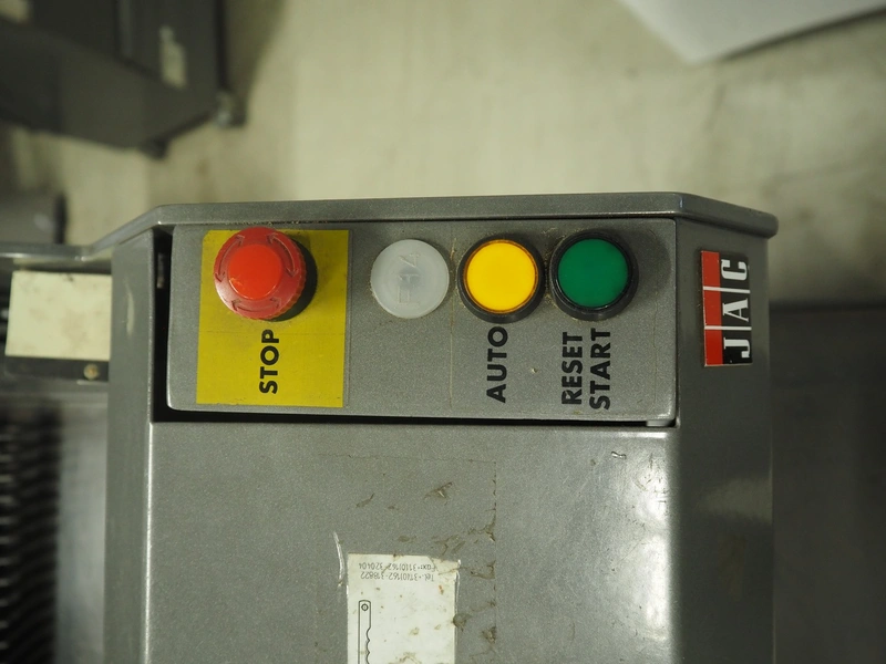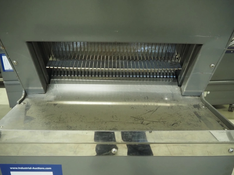 JAC mobile automatic bread slicer, model: ECH/450/12, machine number: 97189102, year of construction: 9/97, 220 V, 1 Ph, 50 Hz, 4.7 A, 0.65 kW, 180 kg, 34 knives, distance between knives: 12 mm, total dimensions: 590 mm x 610 mm x 1350 mm.