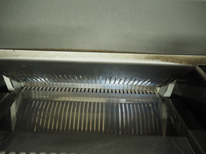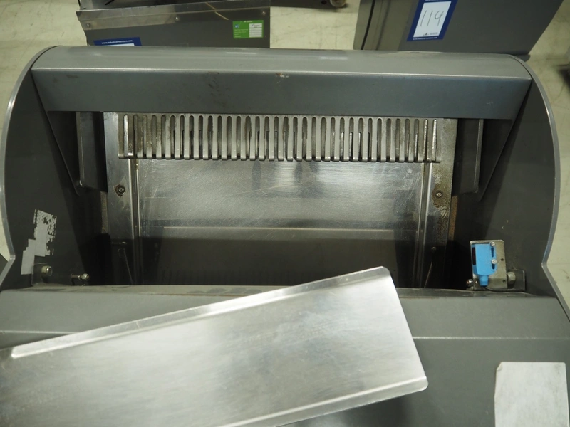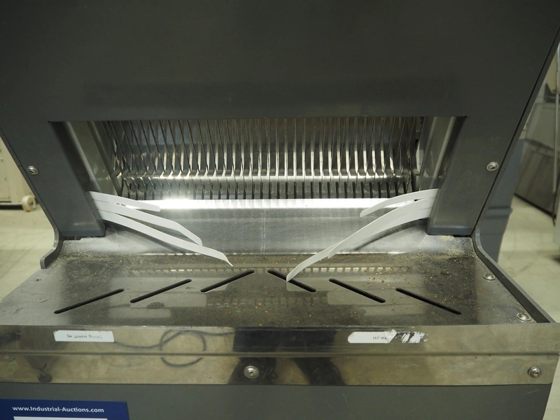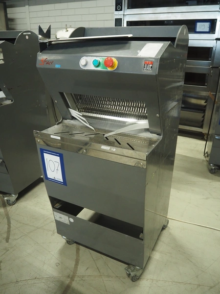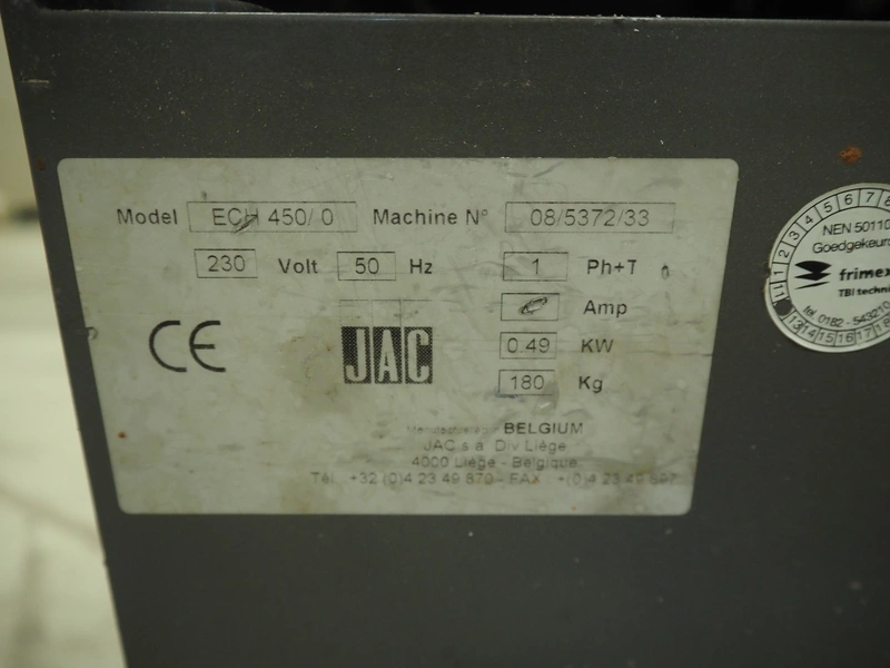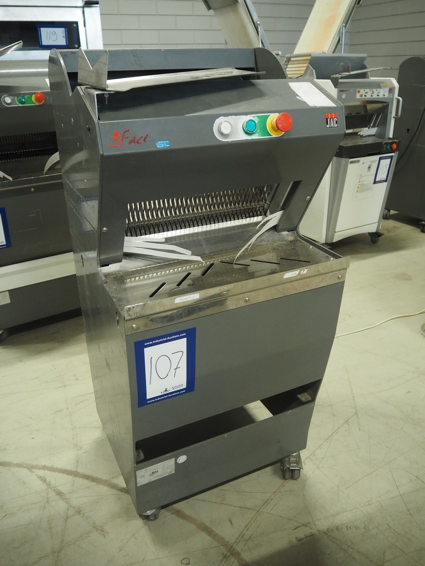 JAC mobile automatic bread slicer, model: ECH/450/0, machine number: 08/5372/33, 230 V, 1 Ph, 50 Hz, 4.7 A, 0.65 kW, 180 kg, 34 knives, distance between knives: 12 mm, total dimensions: 590 mm x 610 mm x 1350 mm.