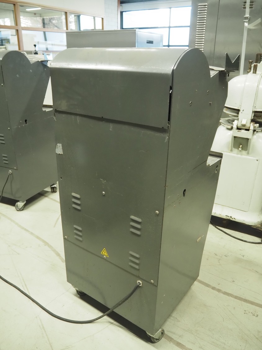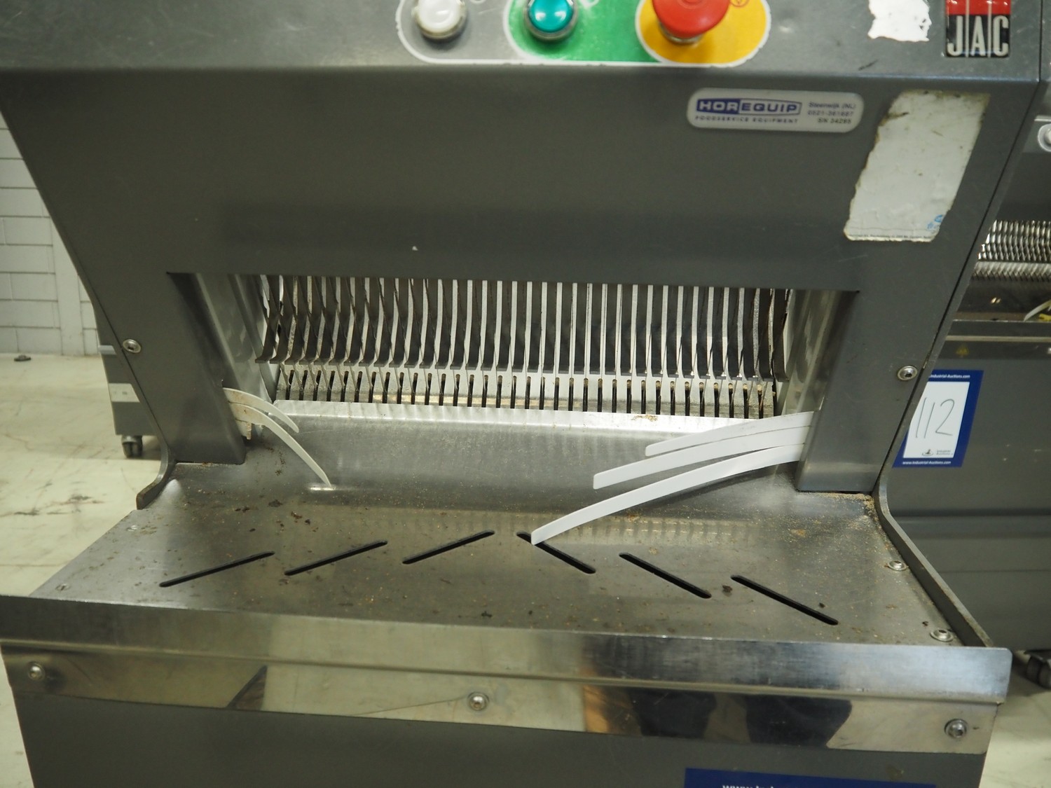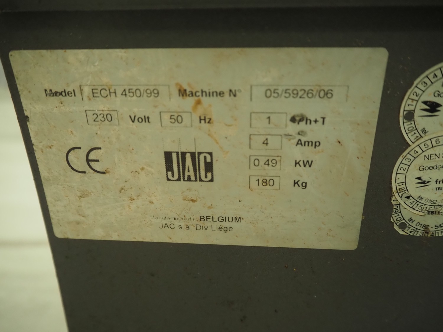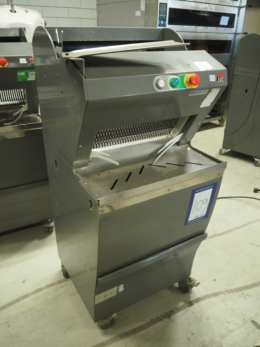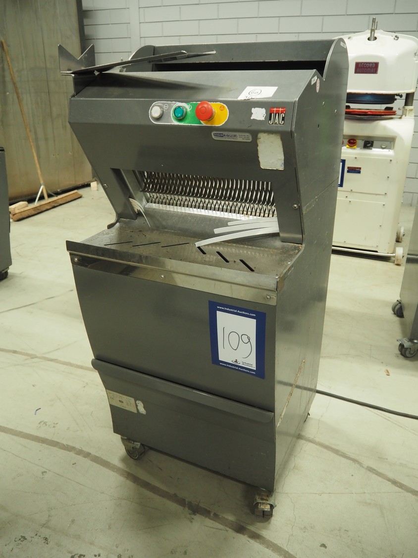 JAC mobile automatic bread slicer, model: ECH/450/99, machine number: 09/5926/06, 230 V, 1 Ph, 50 Hz, 4.7 A, 0.49 kW, 180 kg, 34 knives, distance between knives: 12 mm, total dimensions: 590 mm x 610 mm x 1350 mm.