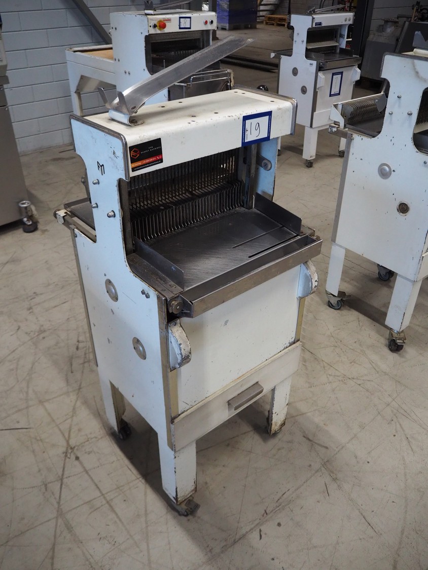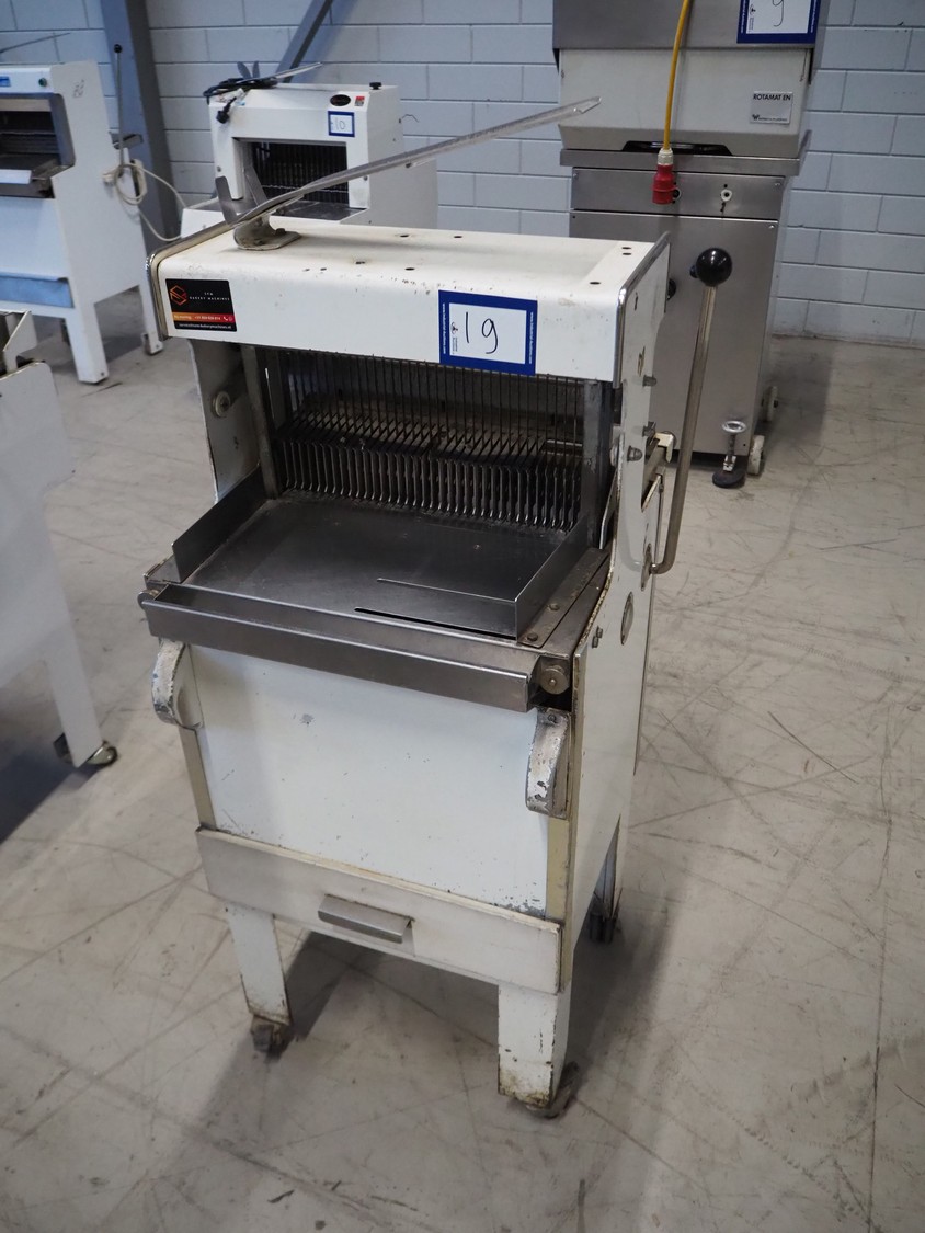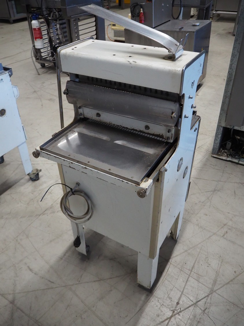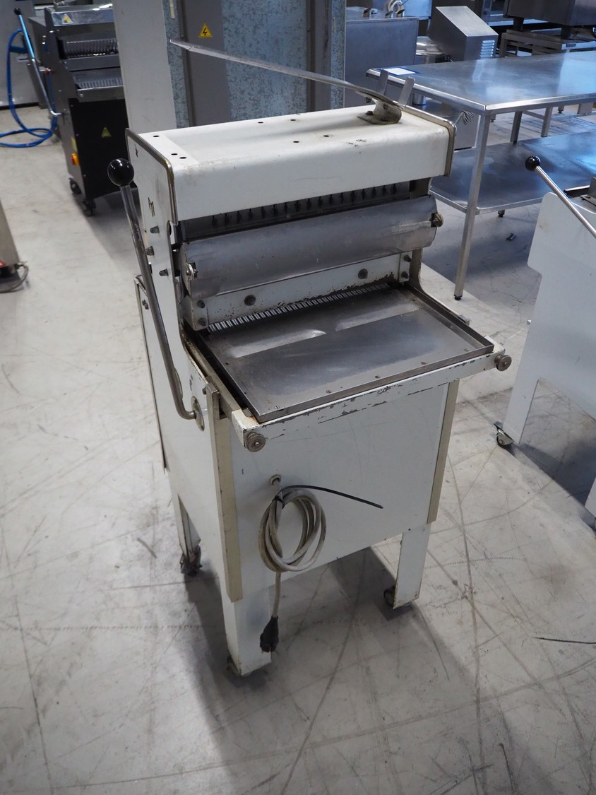 Mobile bread slicer, 34 knives, distance between knives: 12 mm, total dimensions: 550 mm x 660 mm x 1390 mm.