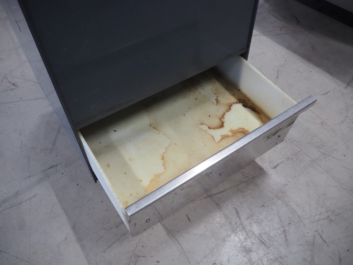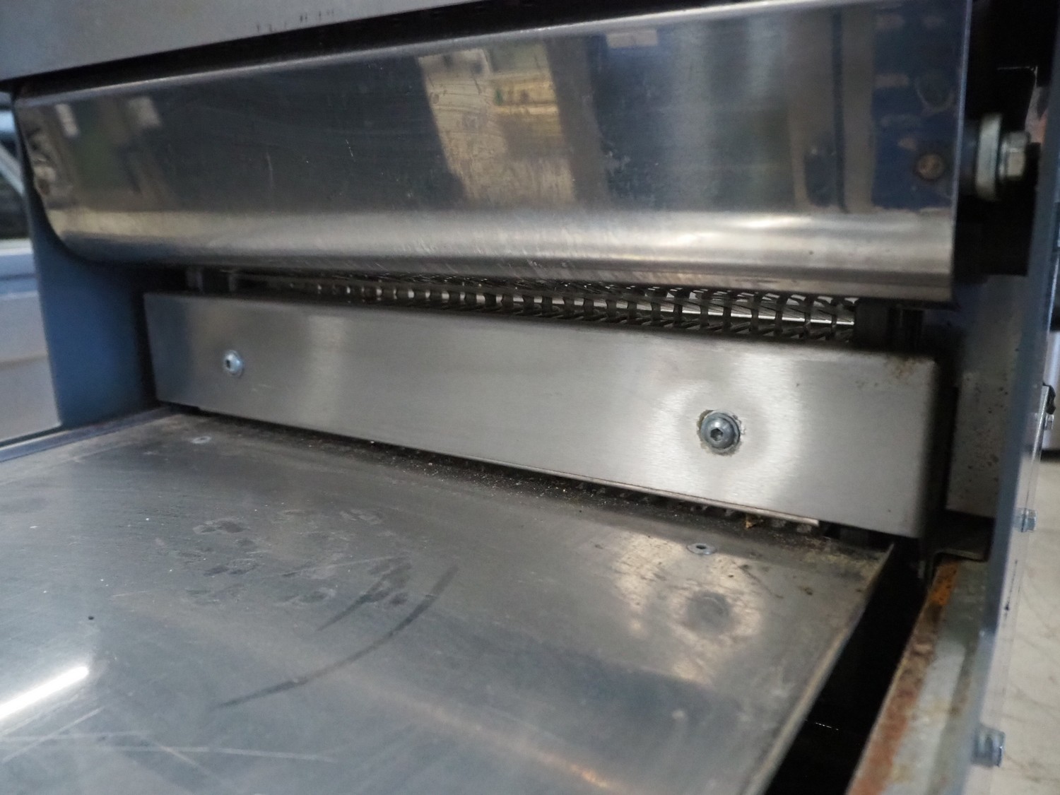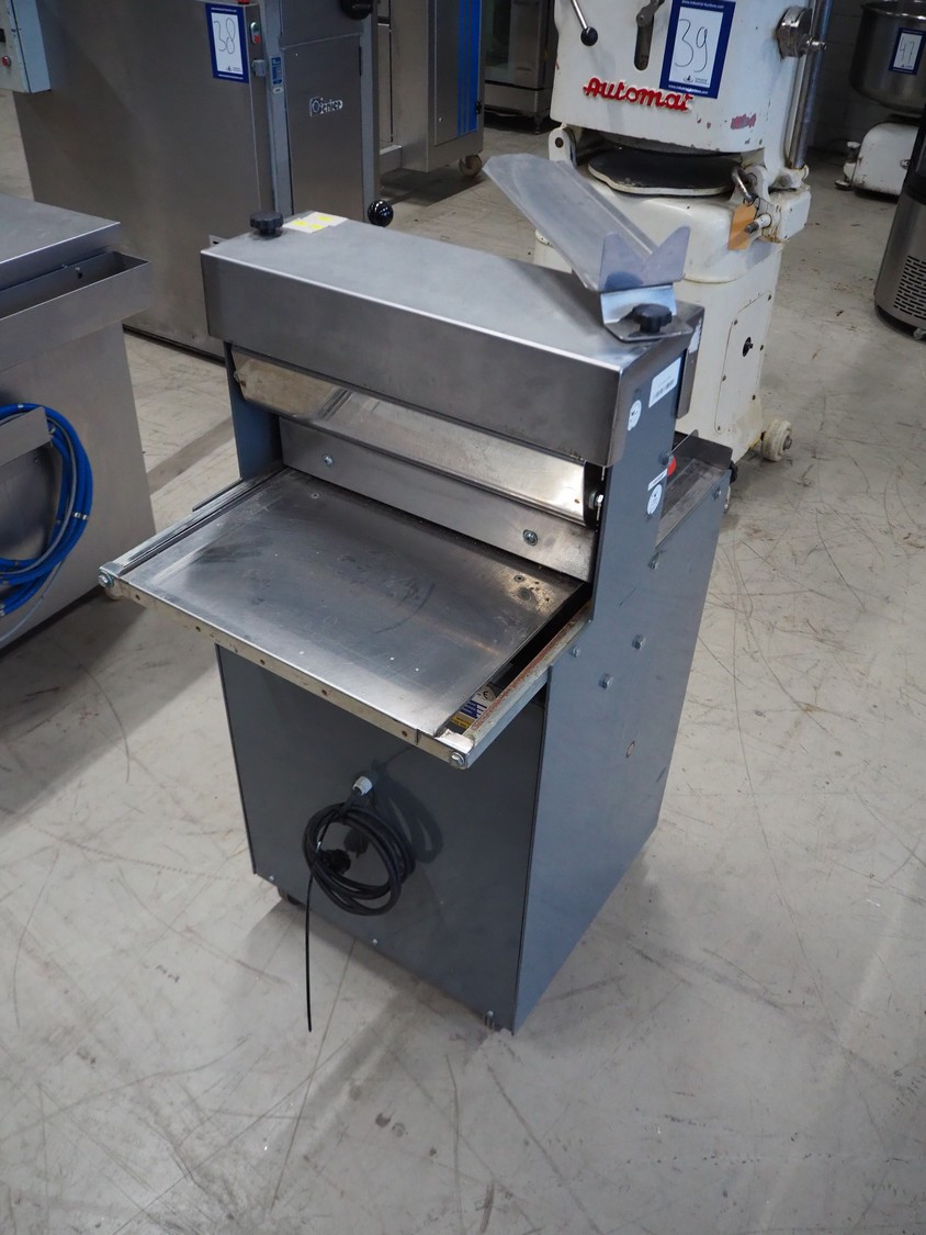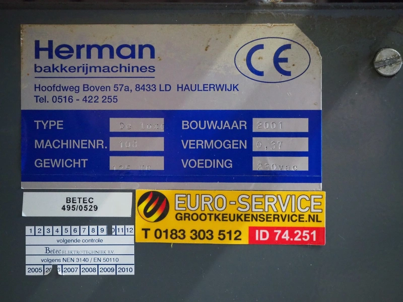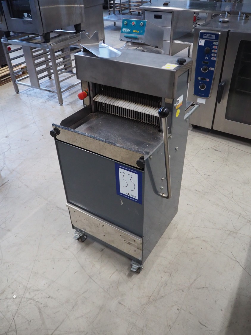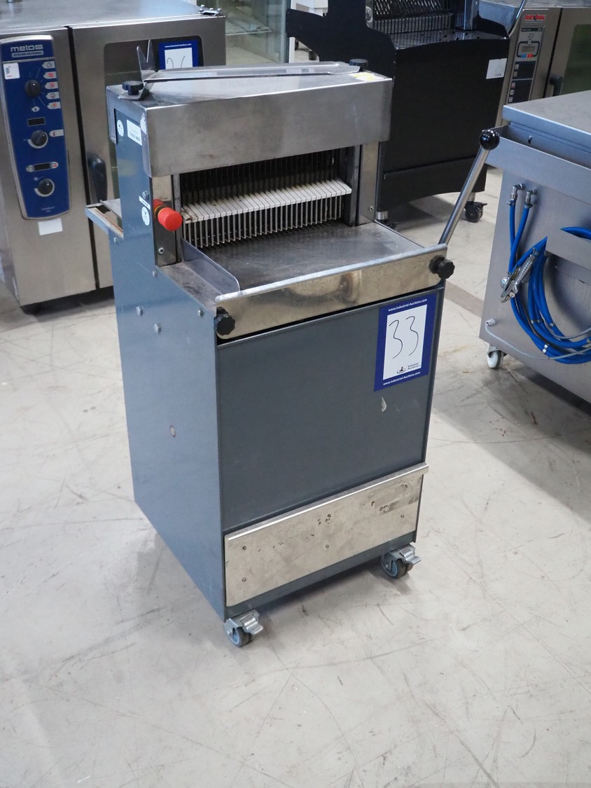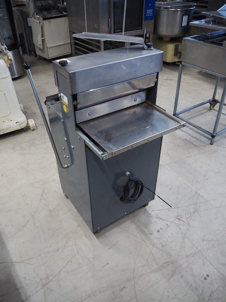 Herman mobile bread slicer, type: De luxe, machine number: 108, year of construction: 2001, 230 V, 0.37 kW, weight: 125 kg, 30 knives, distance between knives: 12 mm, total dimensions: 700 mm x 660 mm x 1240 mm.