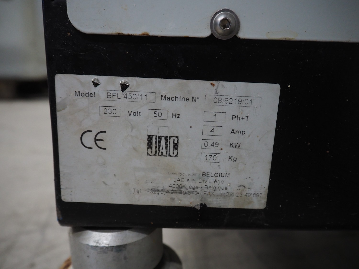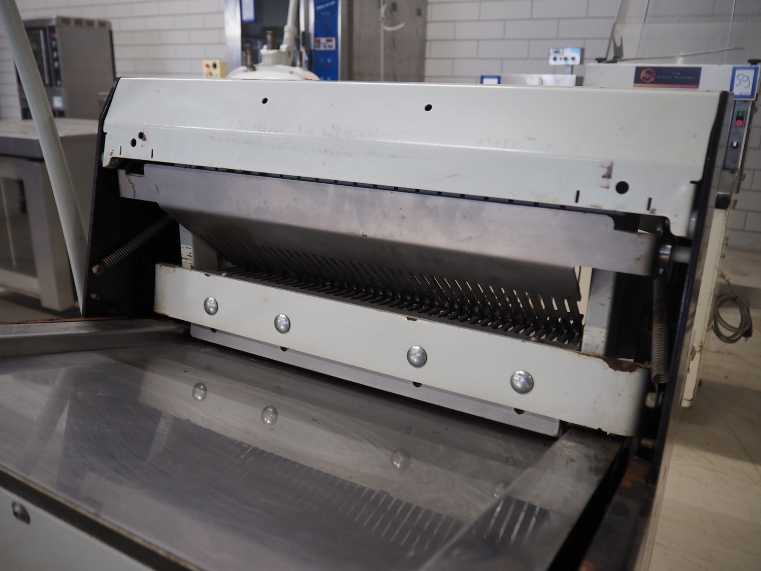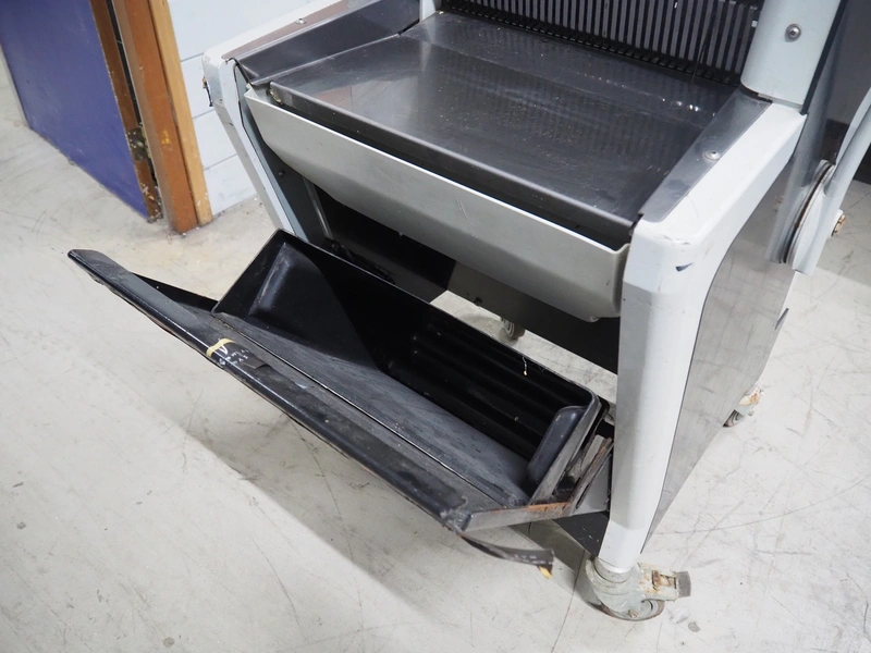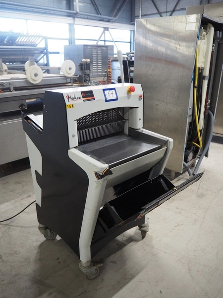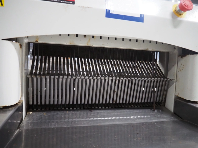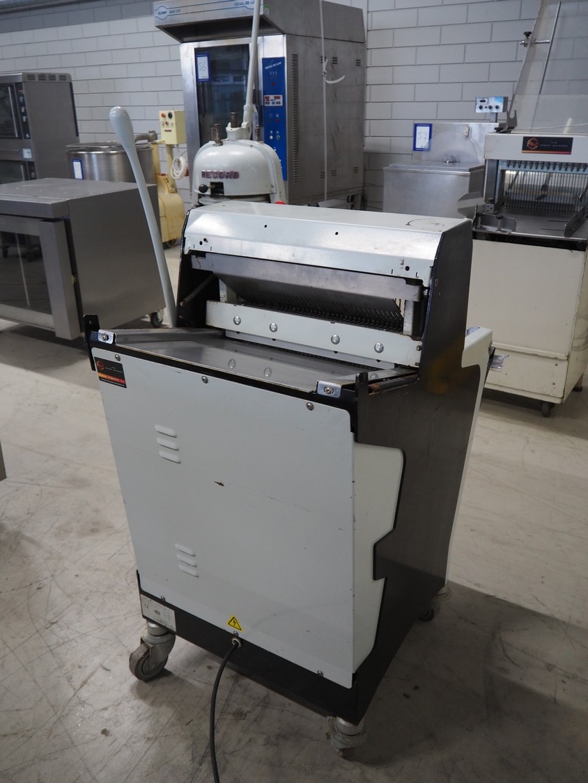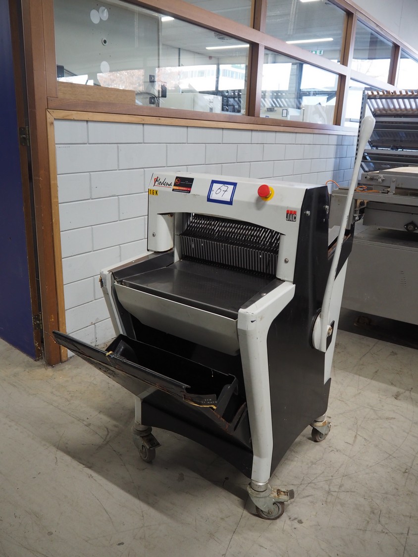 JAC mobile bread slicer, model: BFL 450/11, machine number: 08/6219/01, 230 V, 1 Ph, 50 Hz, 4.0 A, 0.49 kW, 170 kg, 26 knives, distance between knives: 11 mm, total dimensions: 750 mm x 650 mm x 1380 mm. Missing some knives.