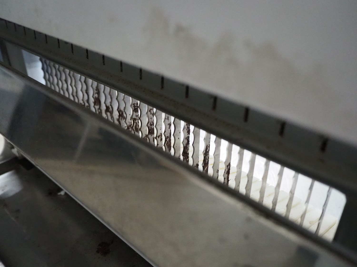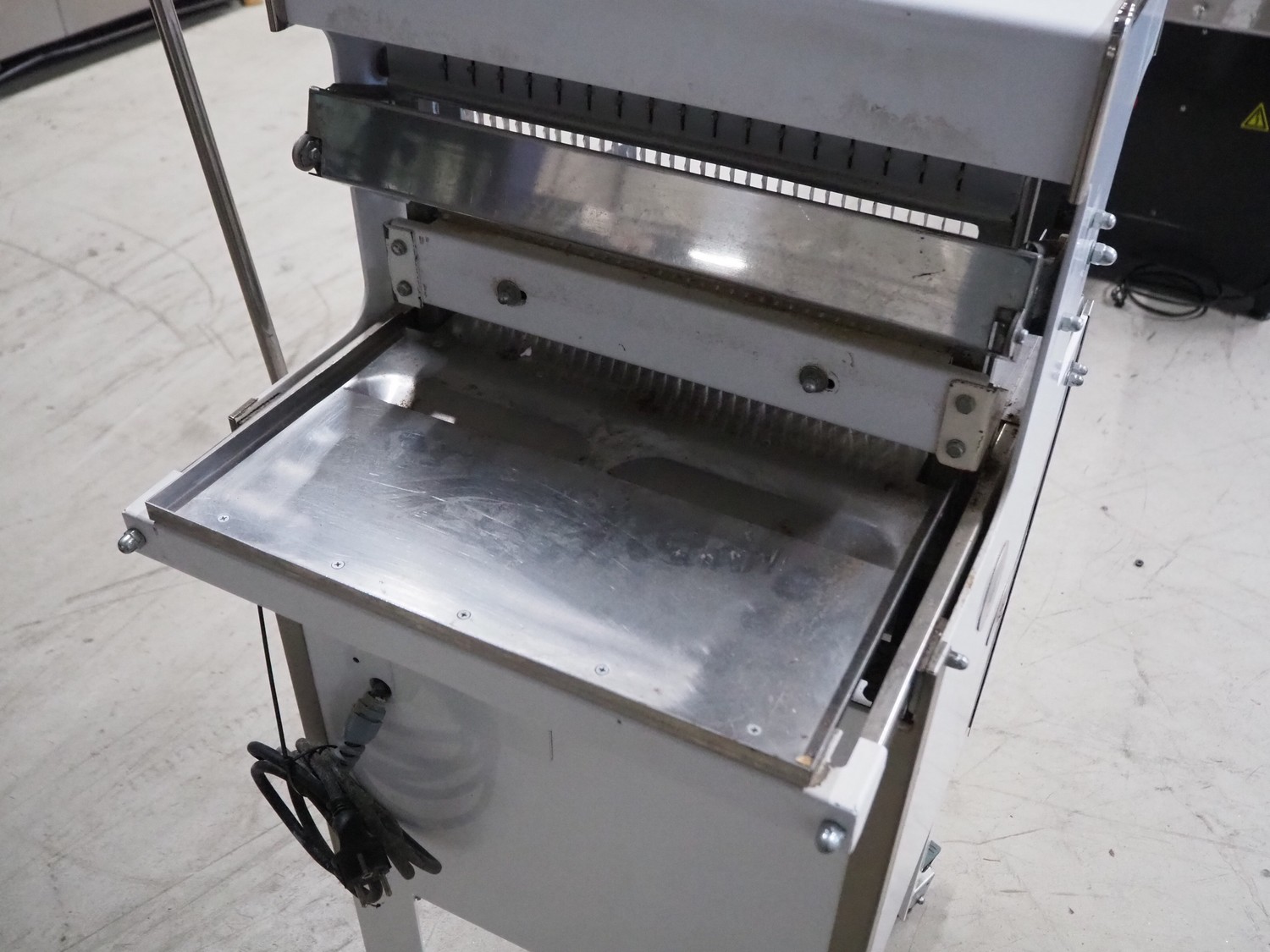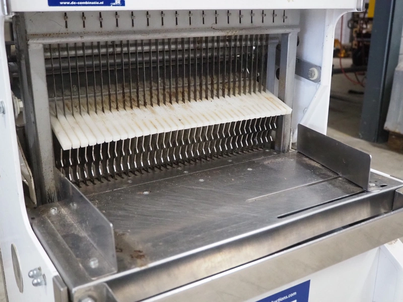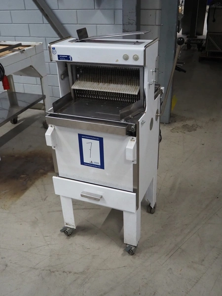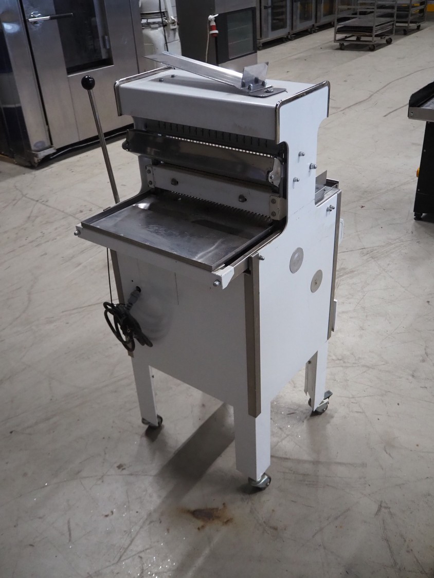 Mobile bread slicer, 34 knives, distance between knives: 12 mm, total dimensions: 640 mm x 660 mm x 1230 mm.