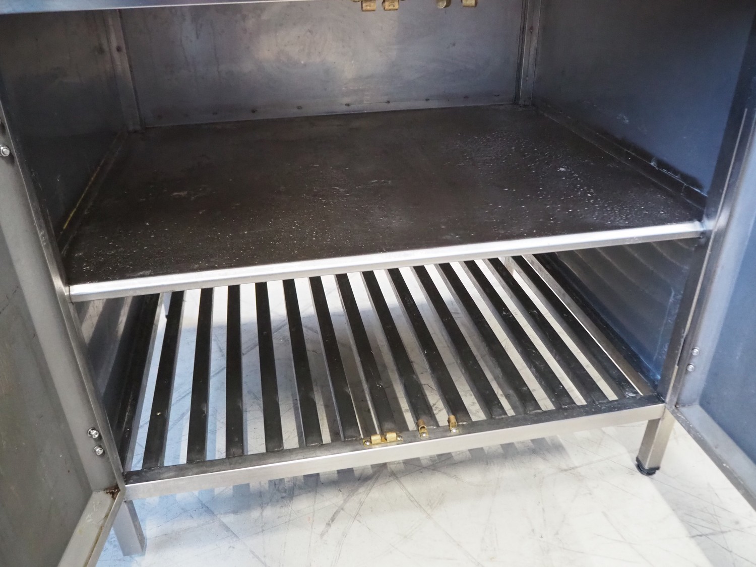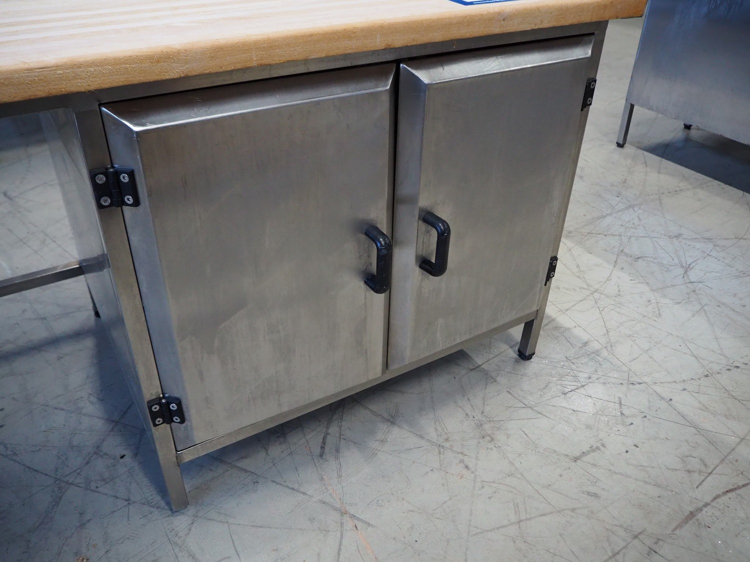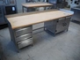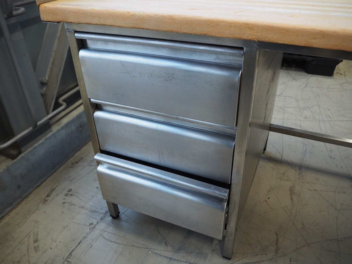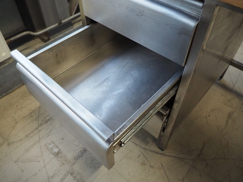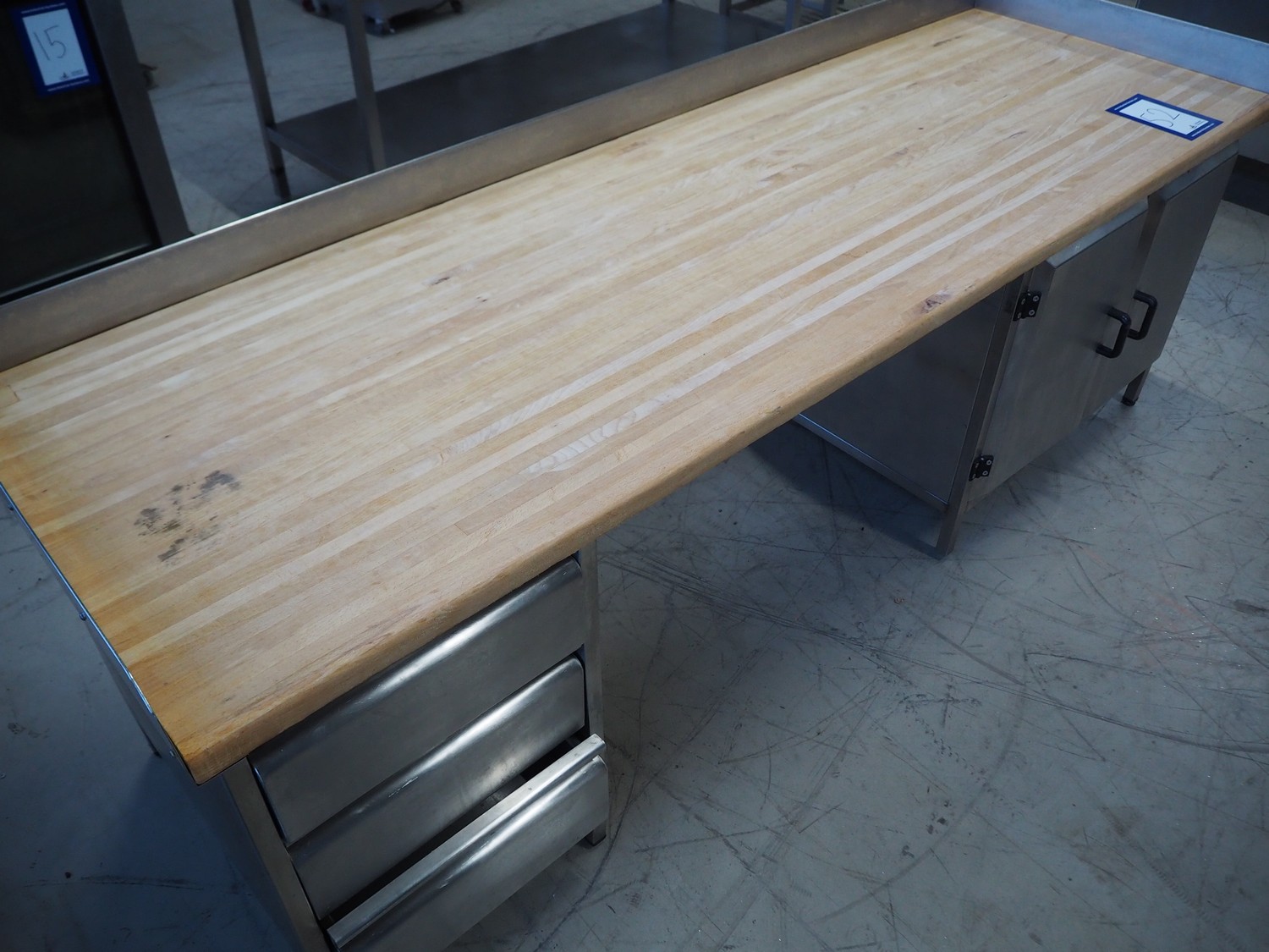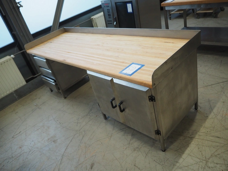 S/s table with wooden top, dimensions: 2520 mm x 800 mm x 950 mm.