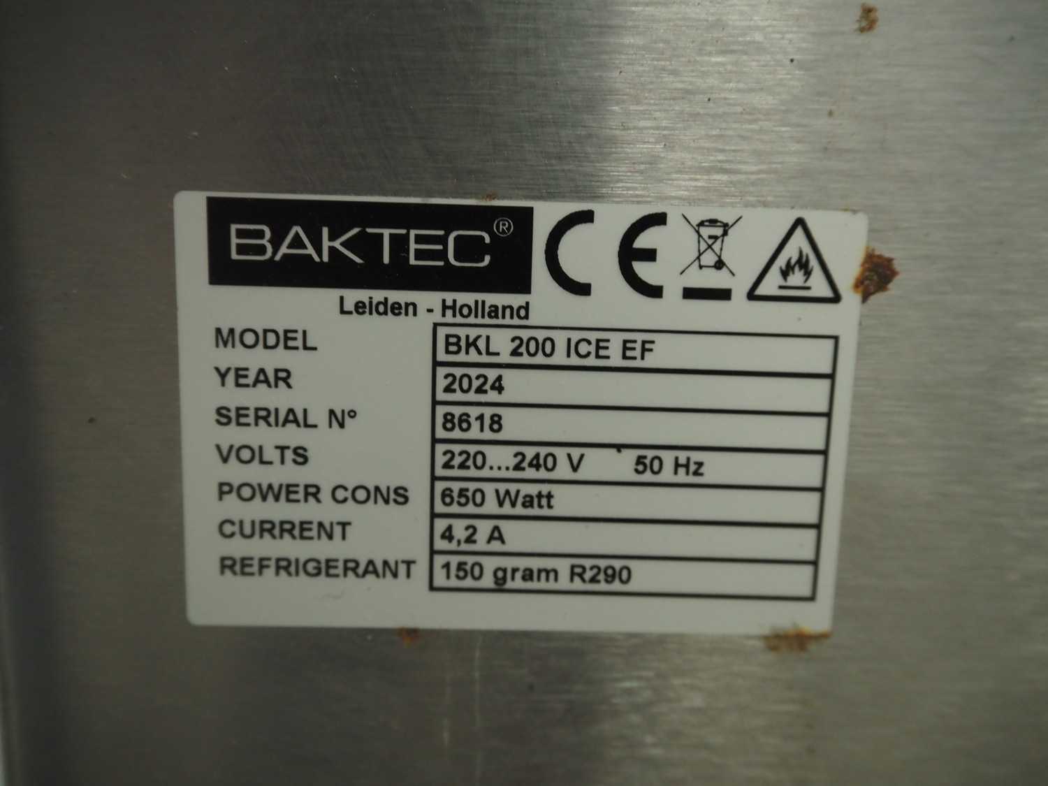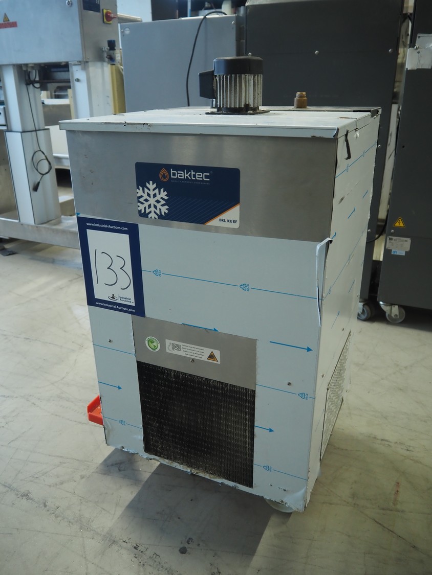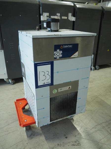 Baktec water chiller, type: BKL 200 ICE EF, serial number: 8618, year of construction: 2024, 220/240 V, 50 Hz, 4.2 A, 650 W, refrigerant: R290, 150 g, dimensions: 500 mm x 500 mm x 800 mm.