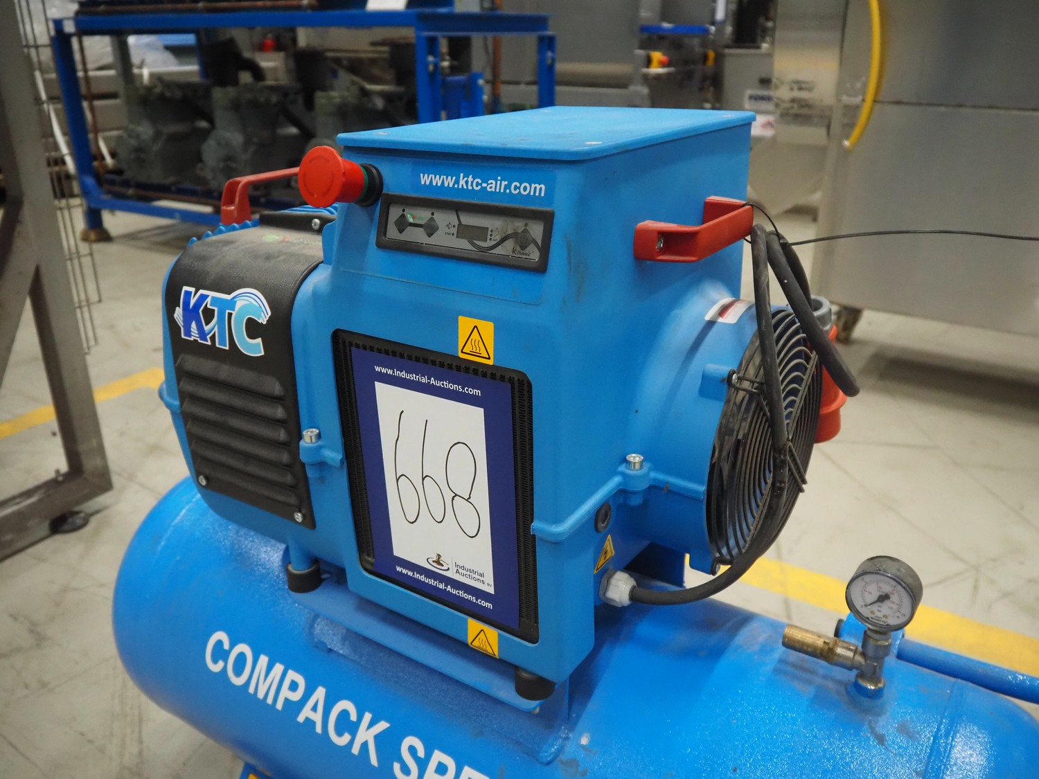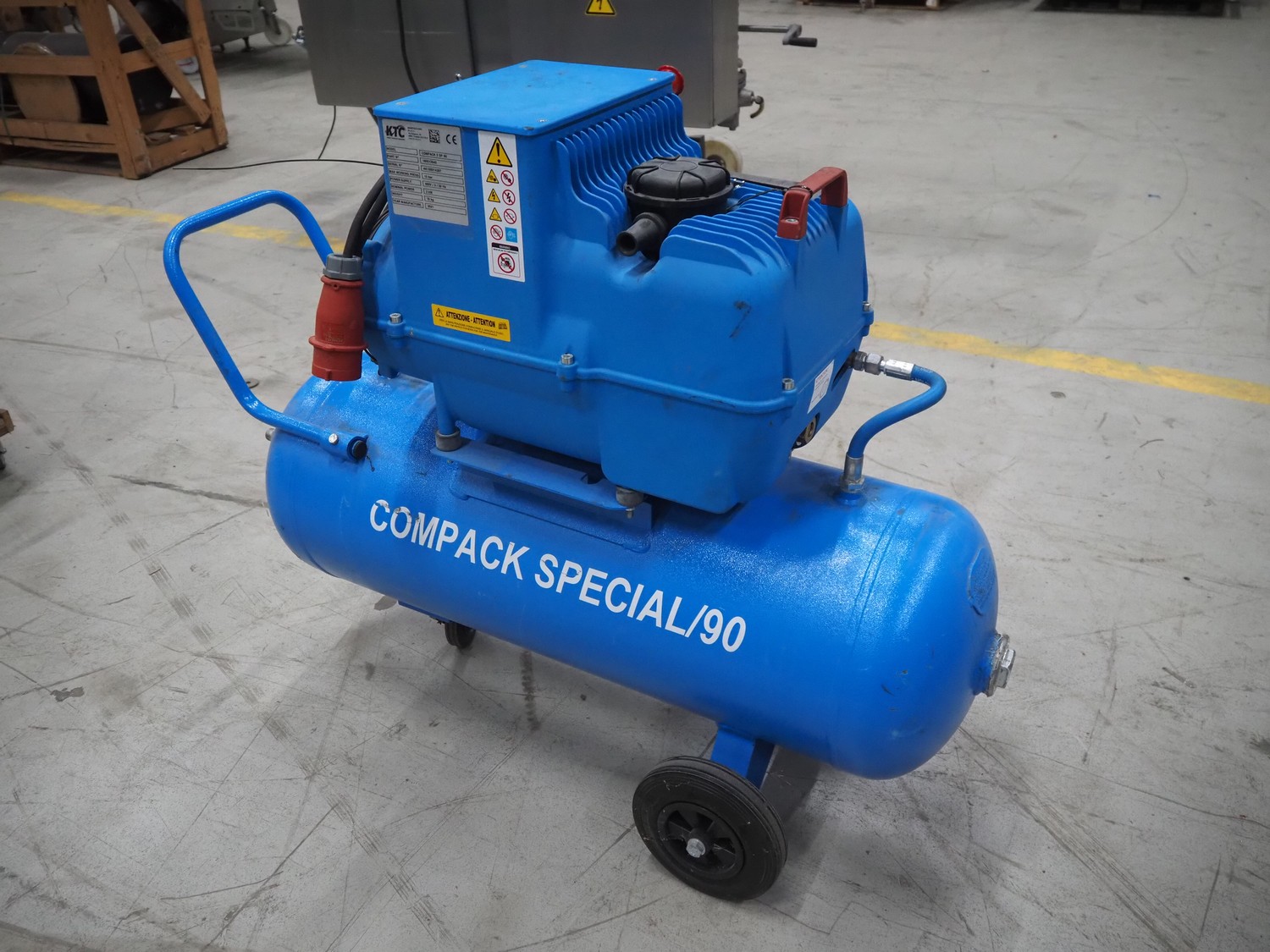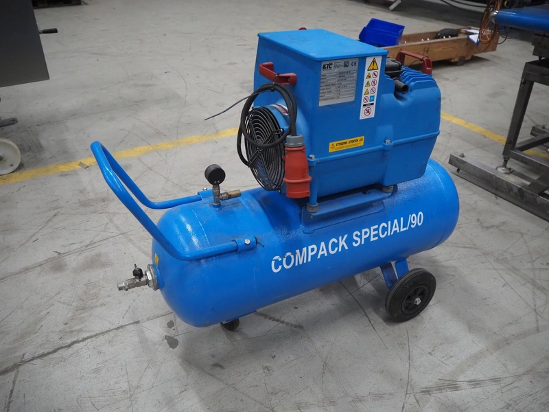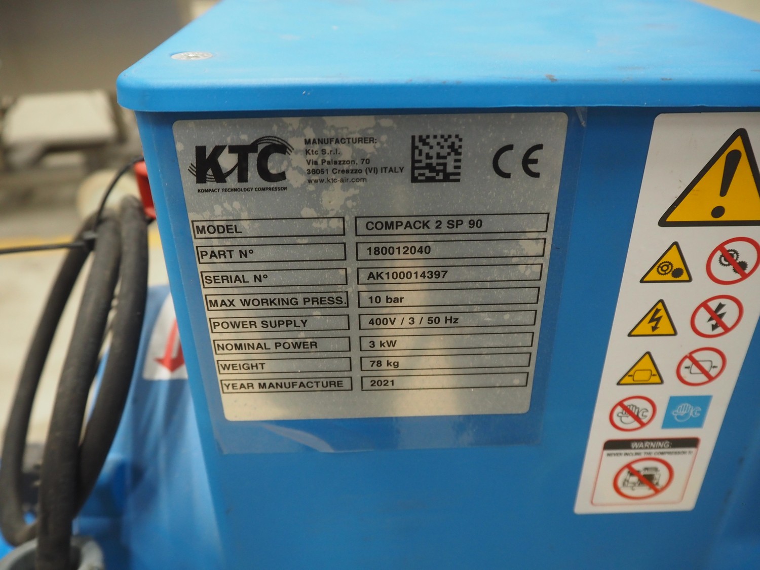KTC air compressor, model: COMPACK 2 SP 90, serial number: AK100014397, year of construction: 2021, 400 V, 3 Ph, 50 Hz, 3 kW, weight: 78 kg, maximum working pressure: 10 bar, dimensions: 1160 mm x 480 mm x 930 mm.