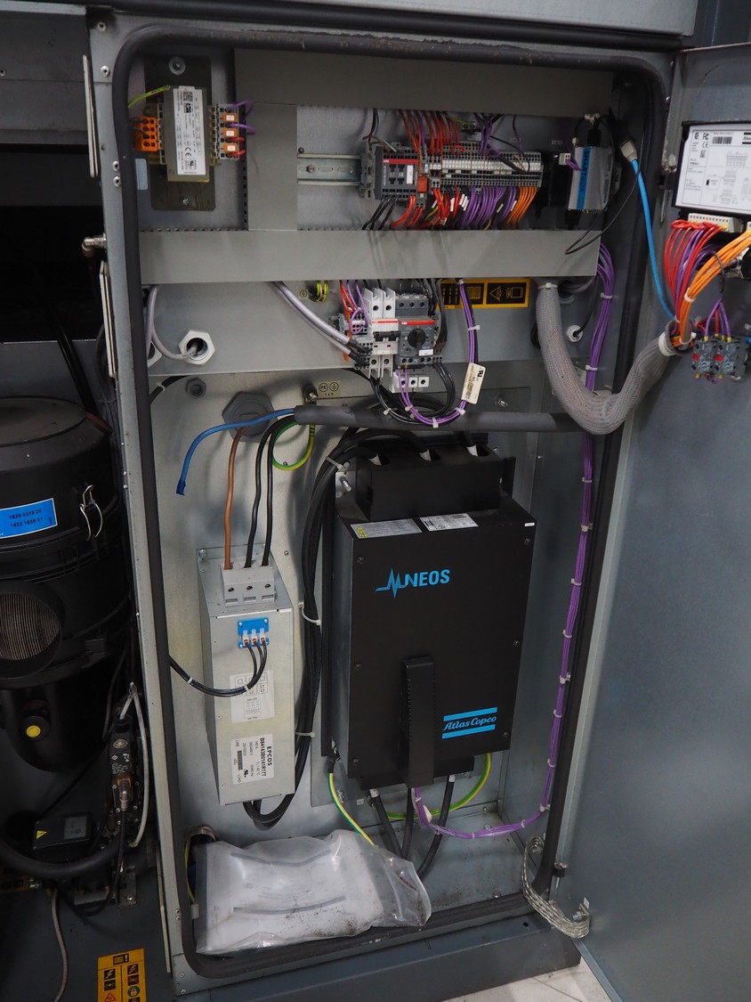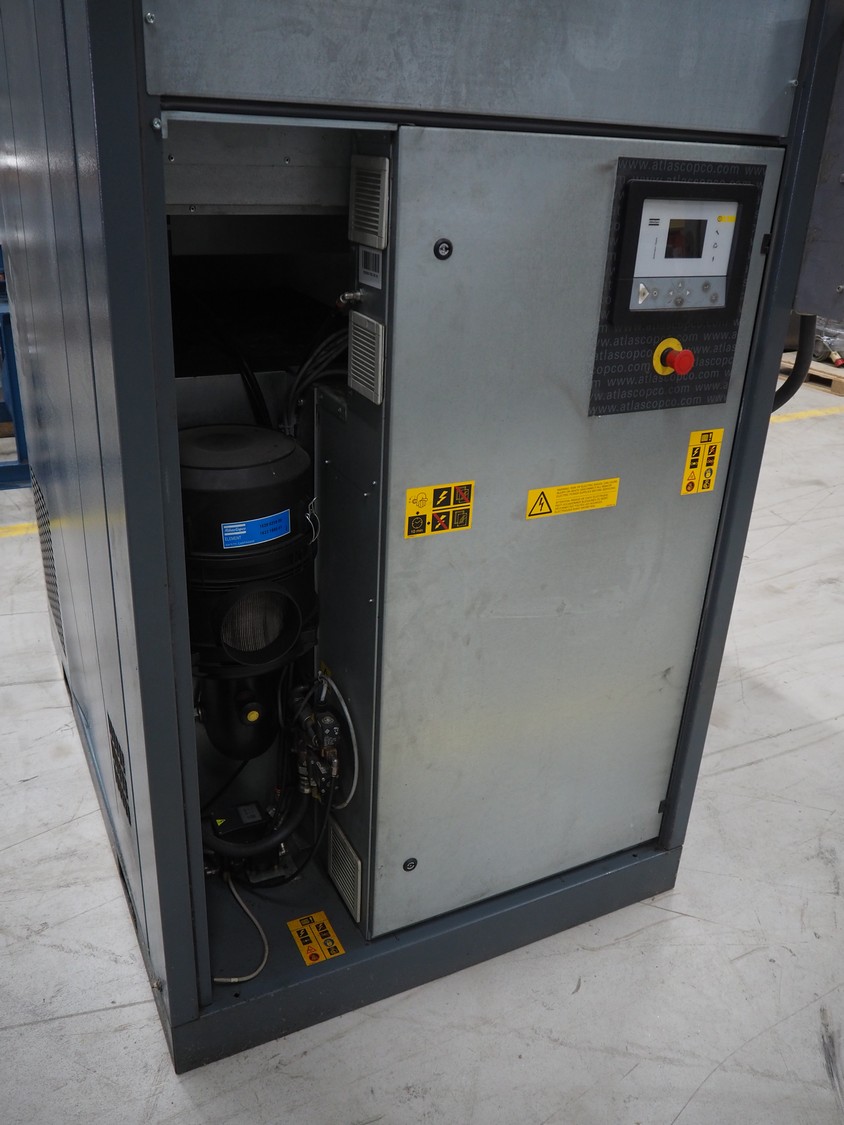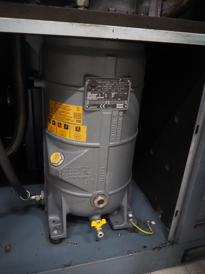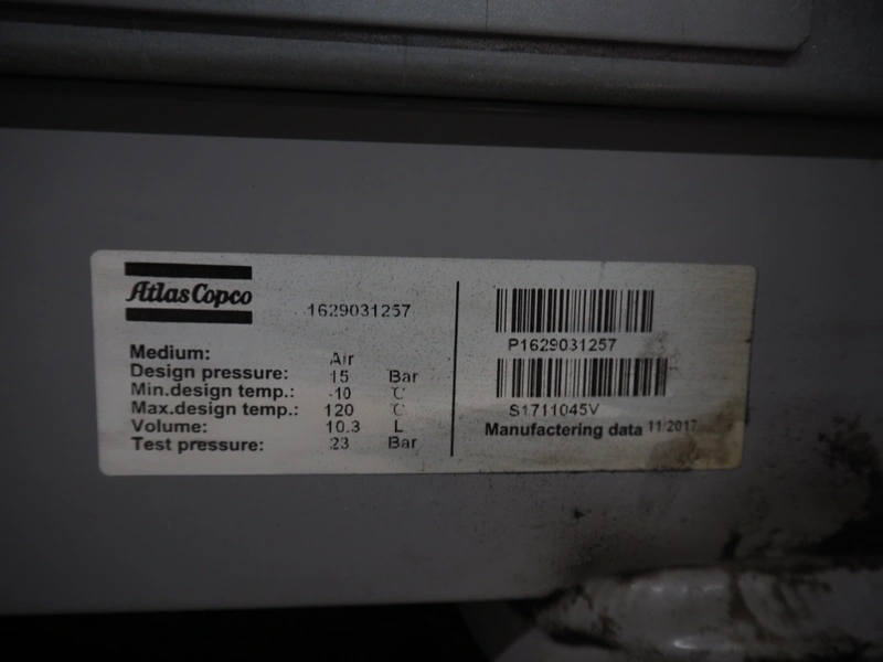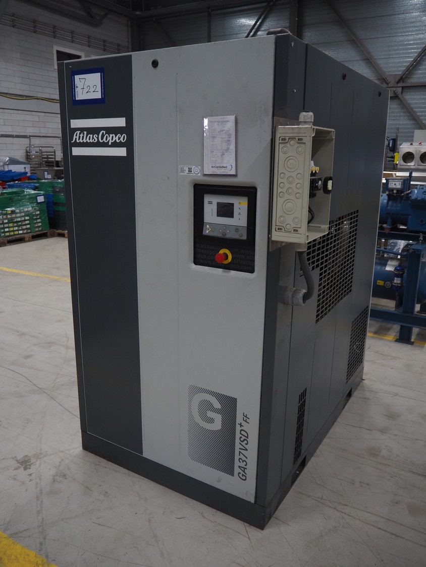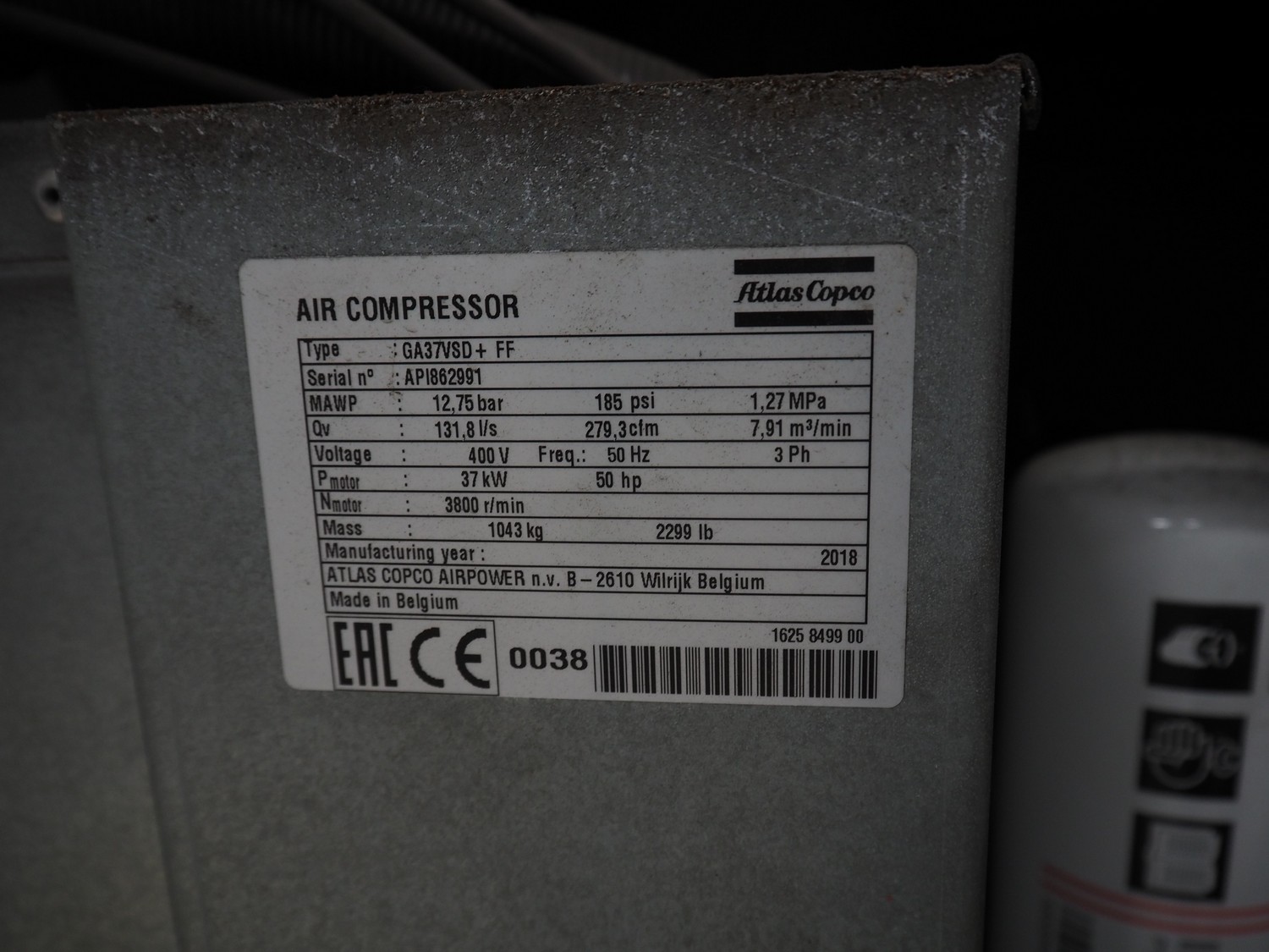 Atlas Copco air compressor, type: GA73VSD + FF, serial number: API862991, year of construction: 2018, 400 V, 3 Ph, 50 Hz, 37 kW, 3800 rates per minute, capacity: 7.91 m³ per minute, weight: 1043 kg, total dimensions: 1800 mm x 1100 mm x 1970 mm.