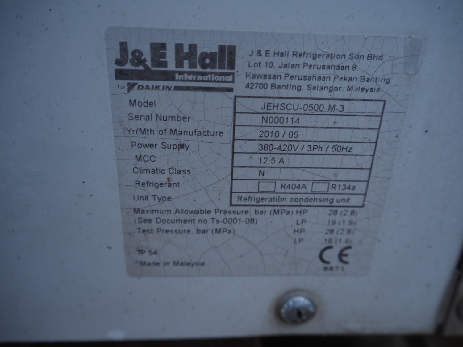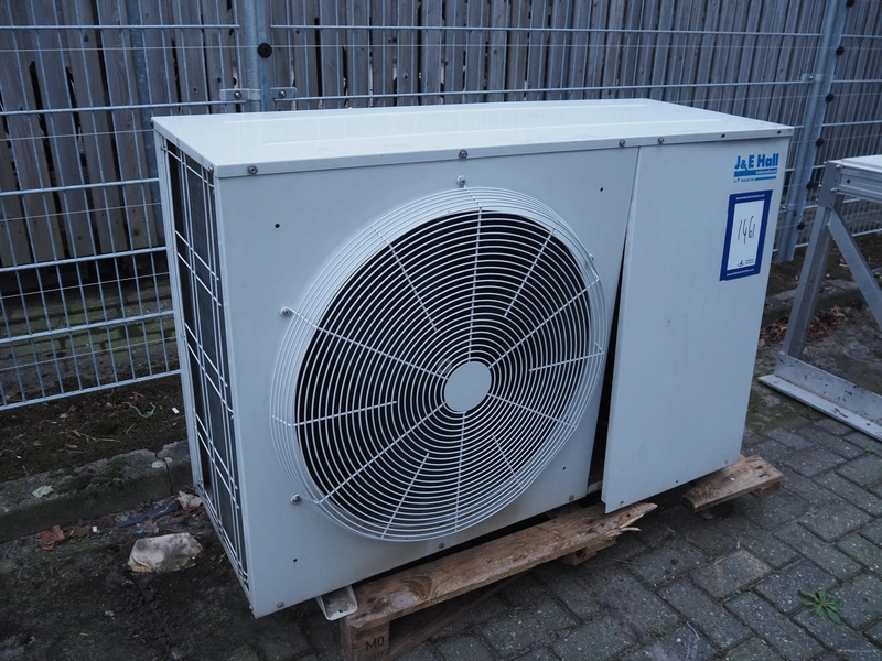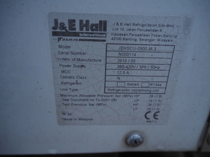 J&E Hall outside unit for airco, model: JEHSCU-0500-M-3, serial number: N000114, year of construction: 2010/05, 380-420 V, 3 Ph, 50 Hz, 12.5 A, dimensions: 1300 mm x 600 mm x 1000 mm.