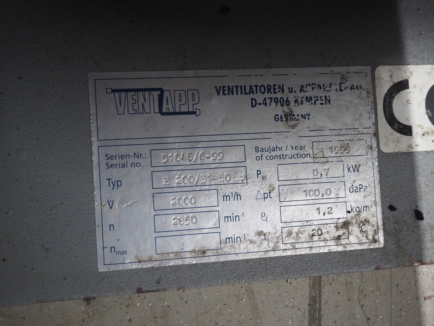 VentApp blower, type: E 200/31-50, serial number: 51046/6-99, year of construction: 1999, capacity: 2000 m³ per hour, dimensions: 700 mm x 450 mm x 580 mm.